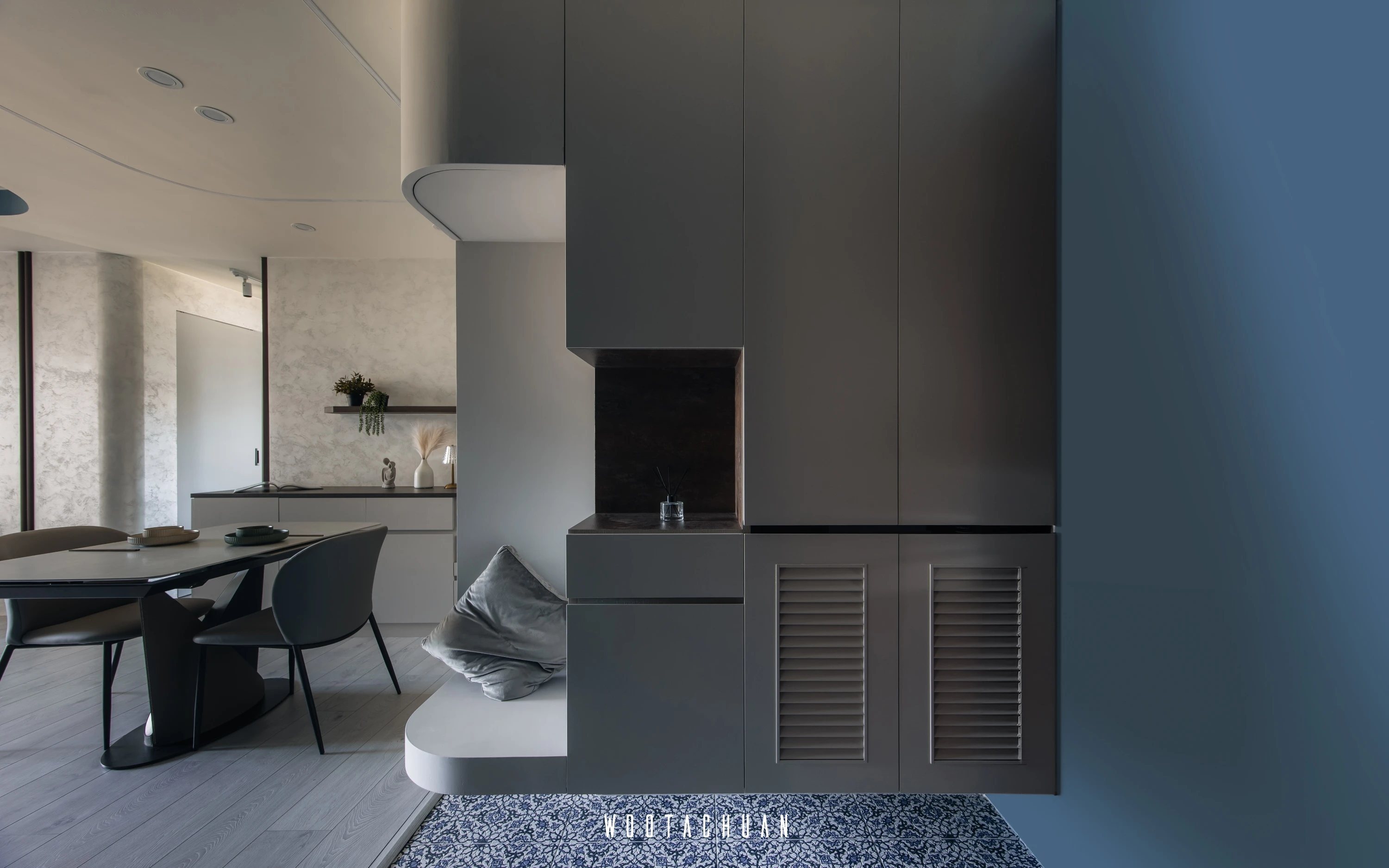 配以導圓⾓的櫃體設計 讓空間更顯柔和與流暢 。