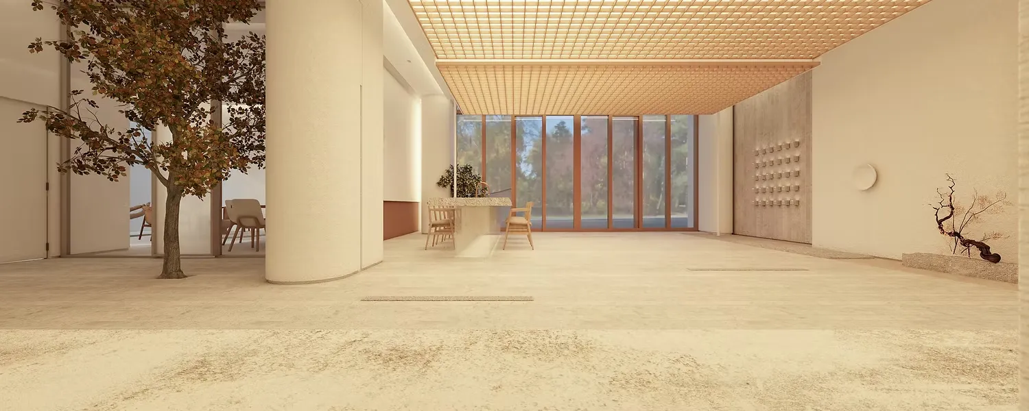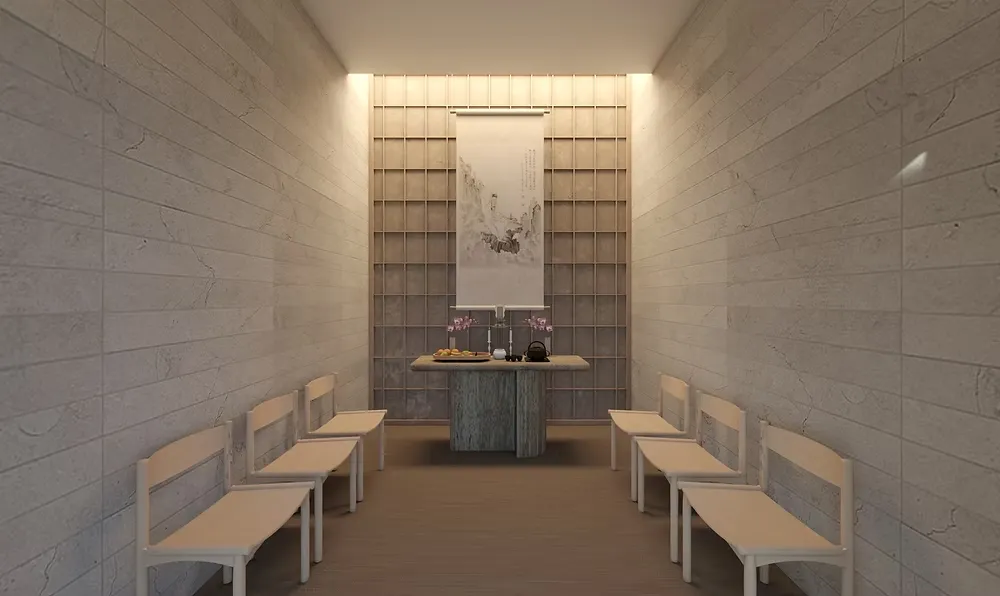 寄秋除了滿足華人祭祀文化中對傳統儀式的需求外,更特別注重訪客的使用體驗。在設計中,我們保留了東方祭祀中交流與飲食的文化元素,並將其融入別院空間,營造出一種充滿「可親性」的氛圍。這樣的設計旨在讓訪客能夠舒適地停留,從而在這裡不僅追思親人,更能洗滌身心,達到精神上的平靜與重生。