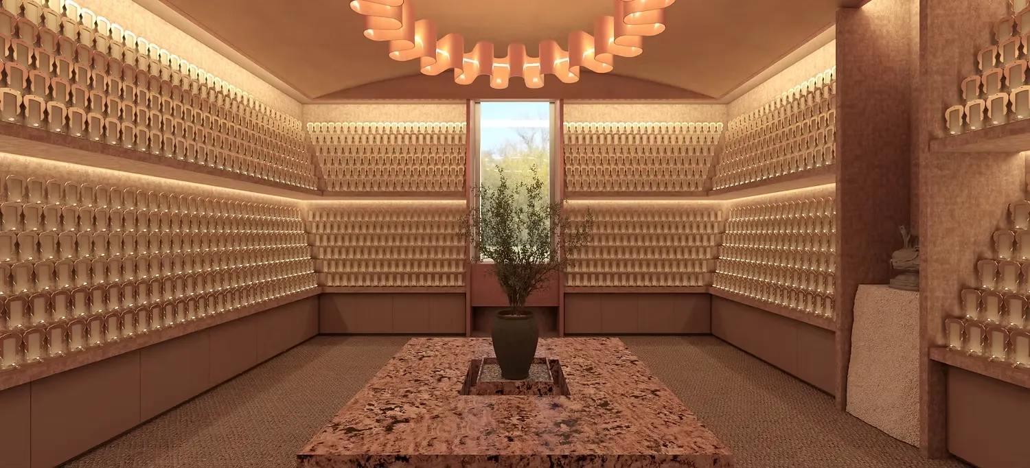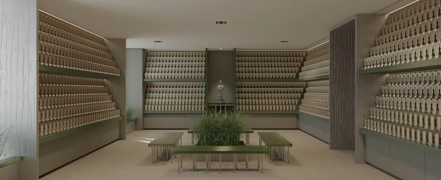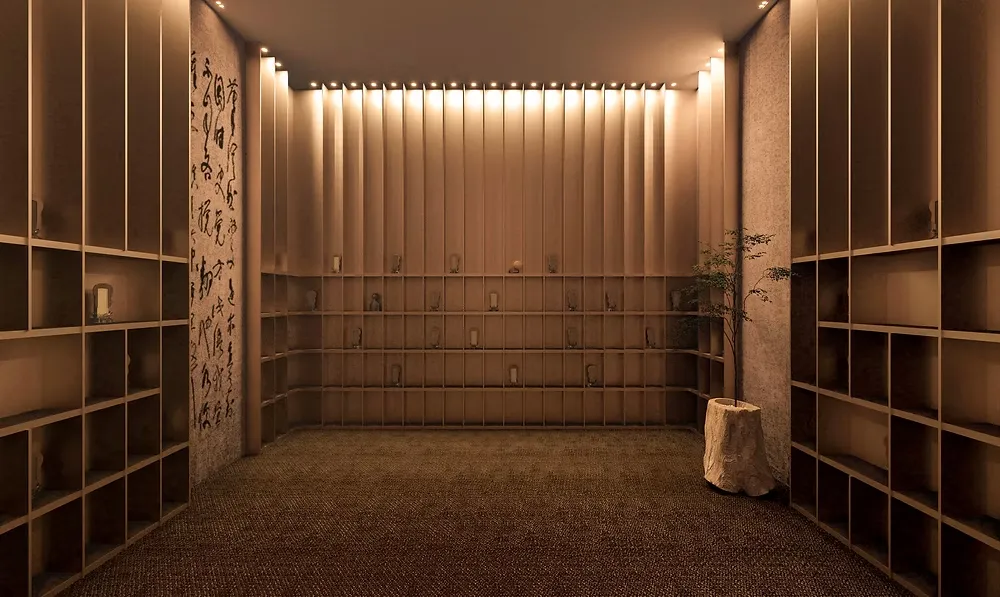 牌位室是最終陳列牌位的地方,也是後人追念親人的場所,寄秋別院以24節氣結合專屬氣味帶入別院內共16間牌位室,不同色系、氣味使每間牌位室分別保有其風格與特色,同時也是個追念親人外歡迎來訪者停留、自我沉澱的空間。