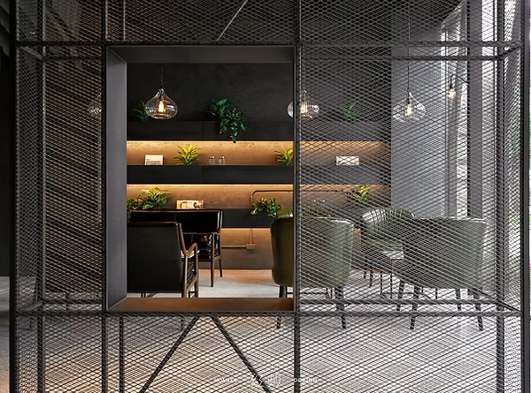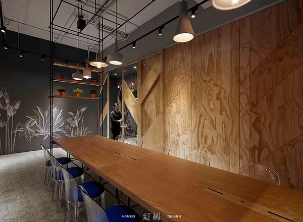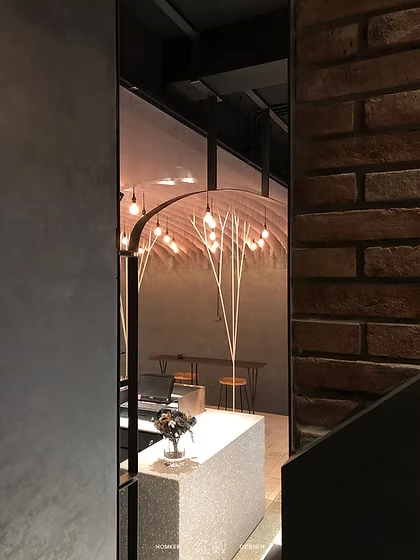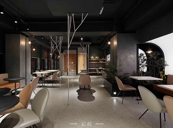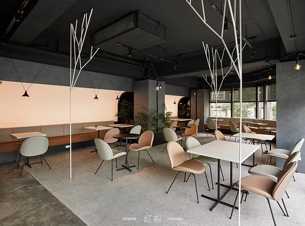 在Loft風格的咖啡廳裡,經常可見紅磚、鐵件、水泥粉光等經典元素的搭配,此作品特出之處在於融入了「布」元素。設計者悉心考量咖啡廳的消費族群廣泛,因此藉由會隨風流飄動、質感柔軟的布料,為粗獷剛硬的空間調性注入屬於女性的柔和特質。整體空間並以充滿樹、風、光的溫室為設計主軸,塑造一個於內於外皆能感受豐富動態視覺的場域。