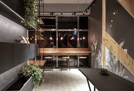 As this project is situated the ground and first floors of a new residential building, and in consideration of the dramatic architectural styling of the residential building, the spatial planning anchored on theme of infusion into the building while accentuating the serenity of café, with characteristics established by the existing large full-height windows and exterior street trees, echoing with s its overall open plan layout and charmingly natural greenhouse ambiance.