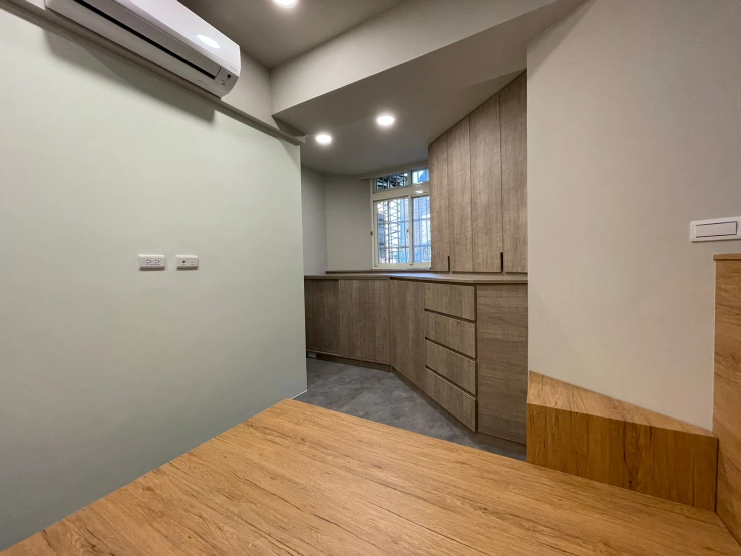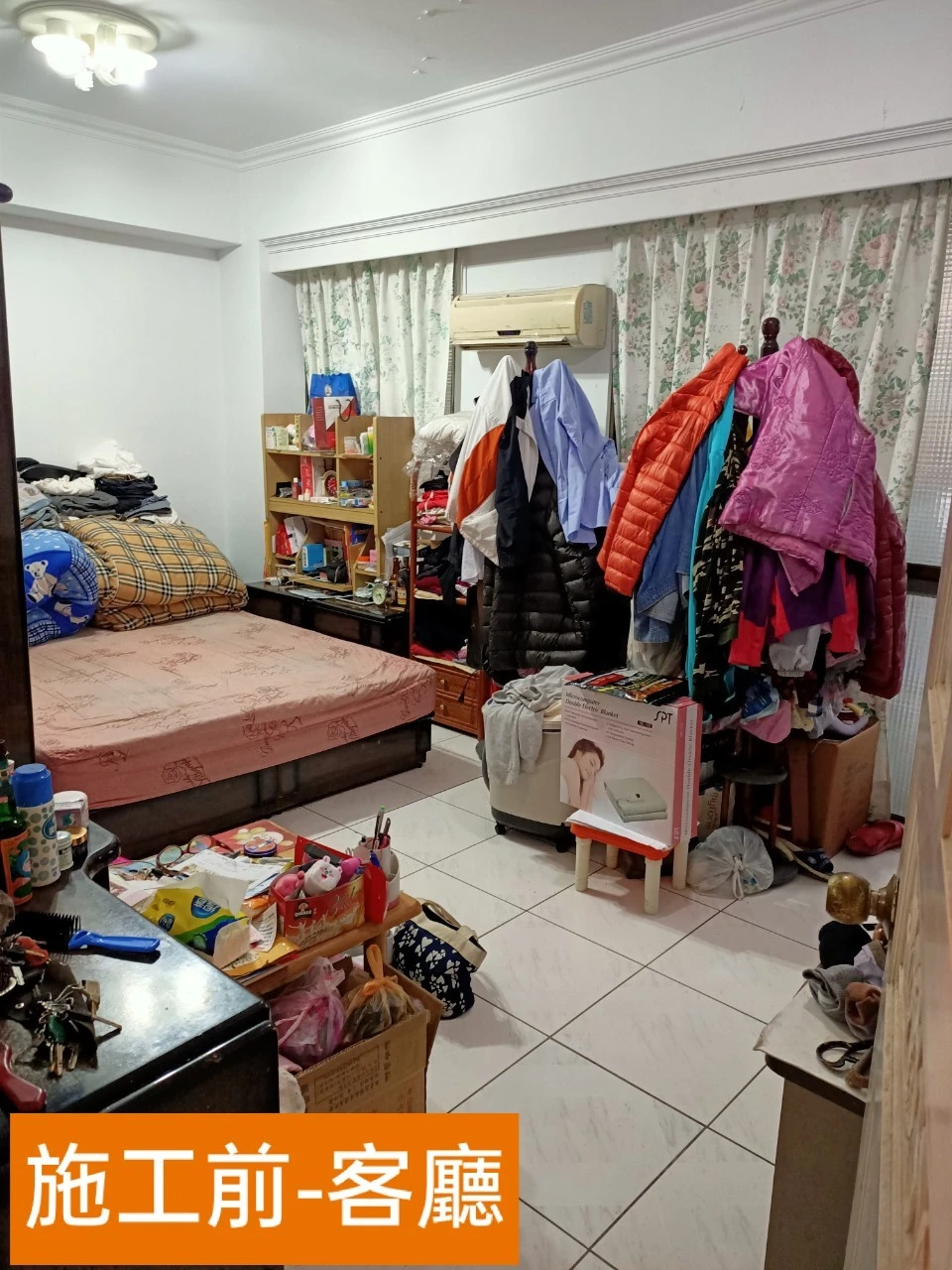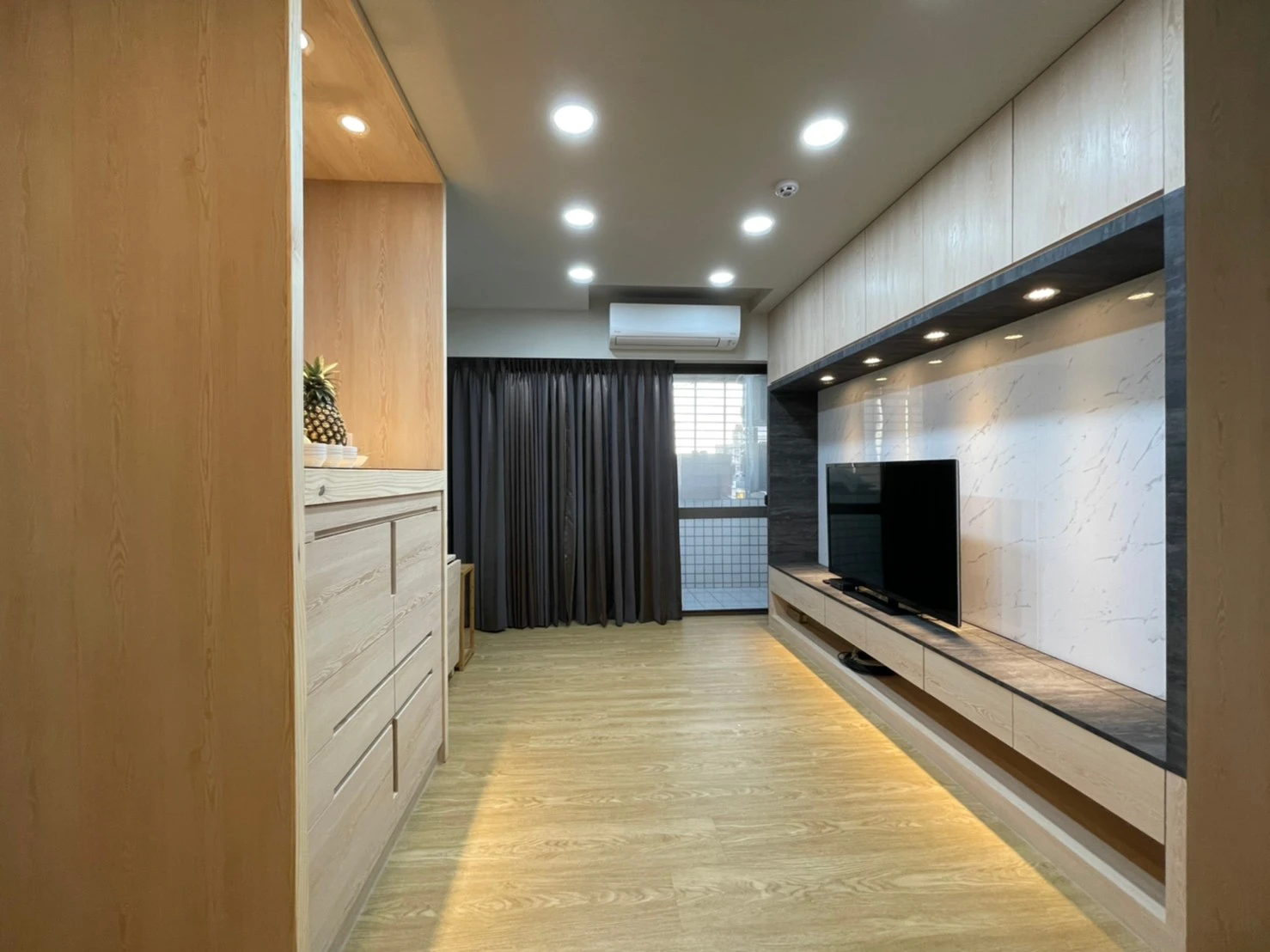 為改善目前空間及動線問題,同時要保留原有陽台落地窗能採光進室內客廳區域;本公司承接此案後即辦理室裝結構分層以及室內格局變更,成功增加室內空間及改善動線問題。另在次臥室多角形的室內空間中,依現地多角地形規劃系統櫃體,增加收納空間。