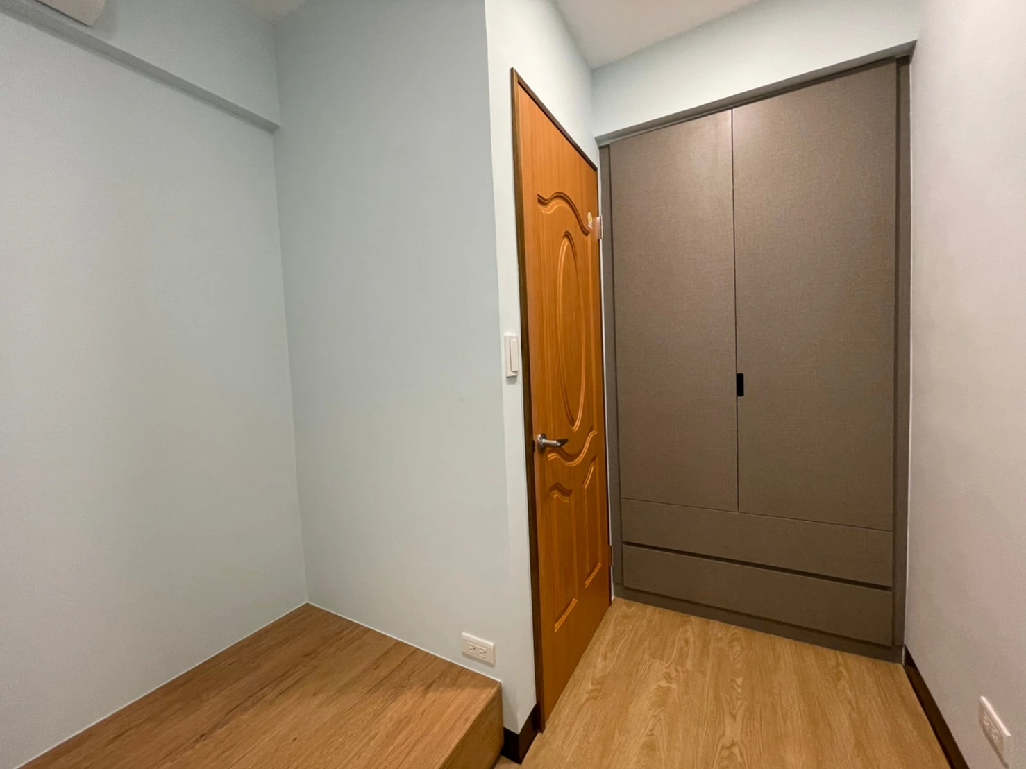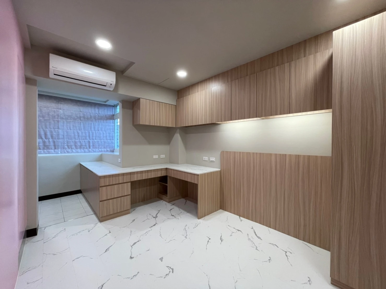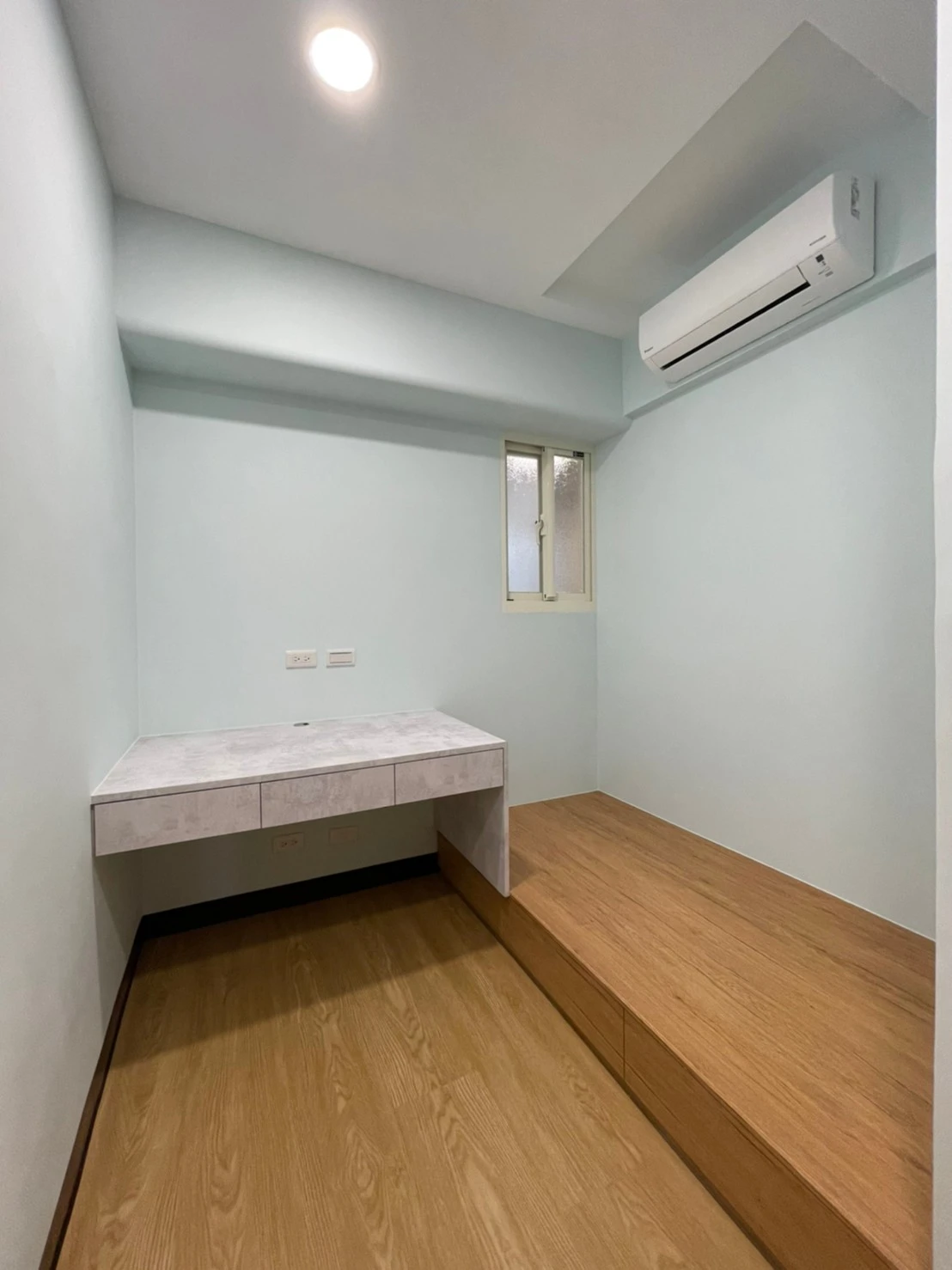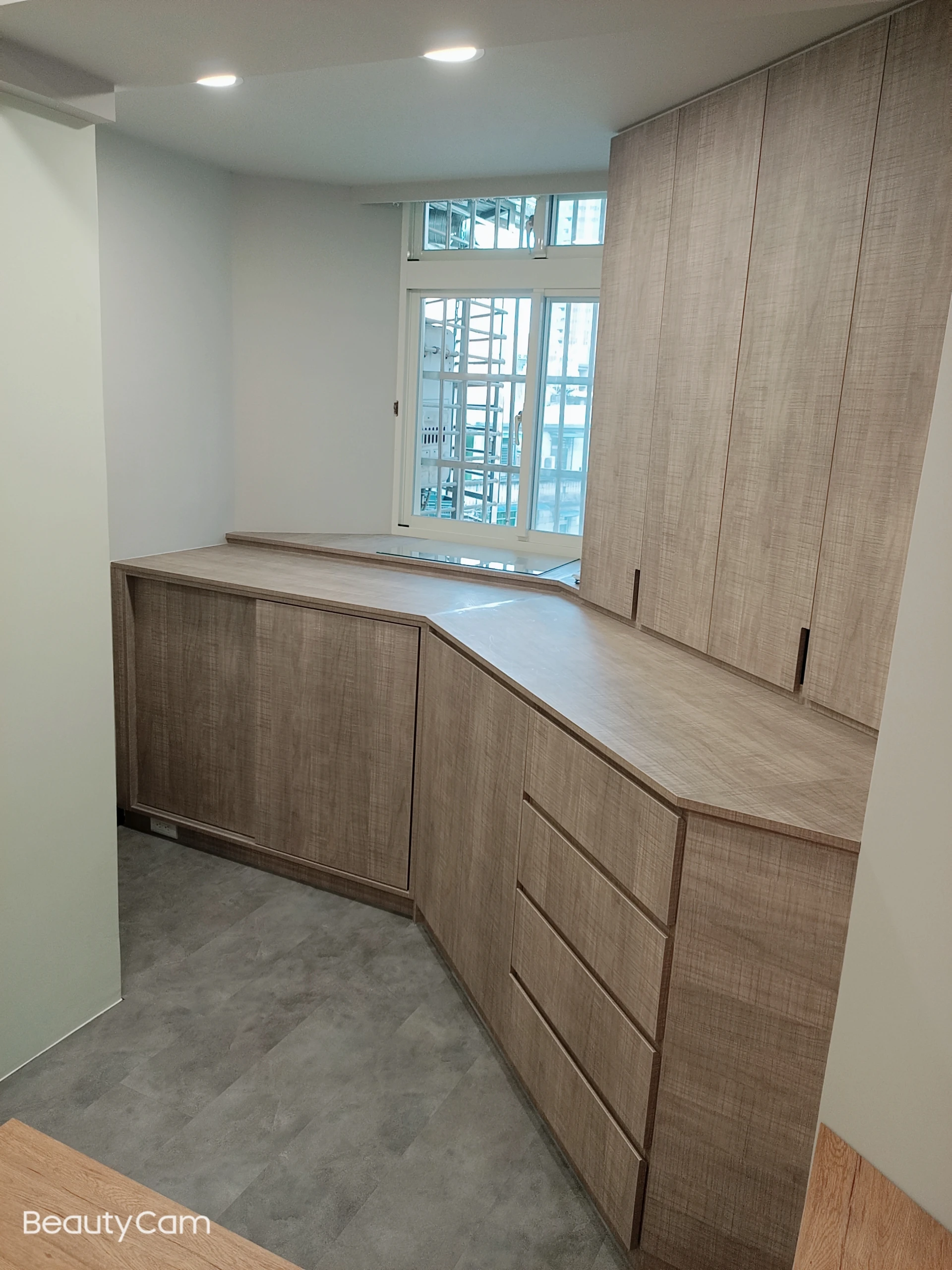 為改善目前空間及動線問題,同時要保留原有陽台落地窗能採光進室內客廳區域;本公司承接此案後即辦理室裝結構分層以及室內格局變更,成功增加室內空間及改善動線問題。另在次臥室多角形的室內空間中,依現地多角地形規劃系統櫃體,增加收納空間。