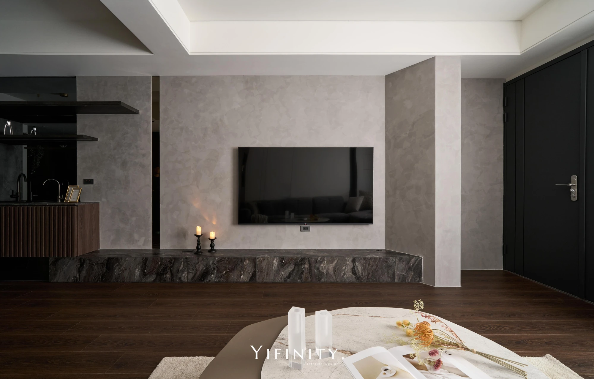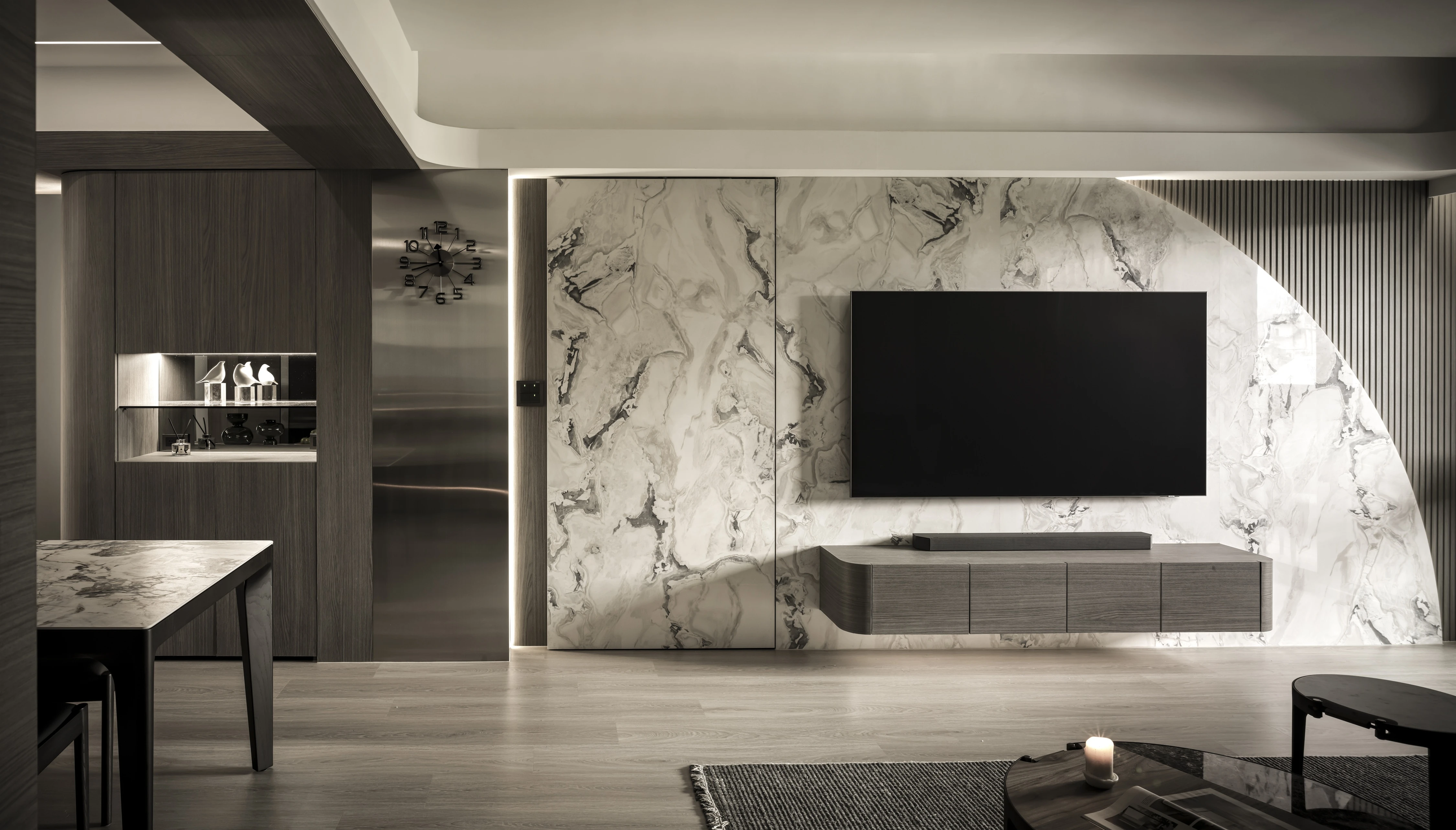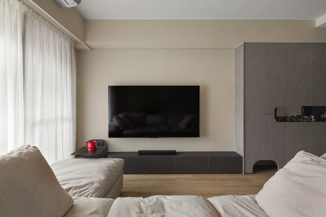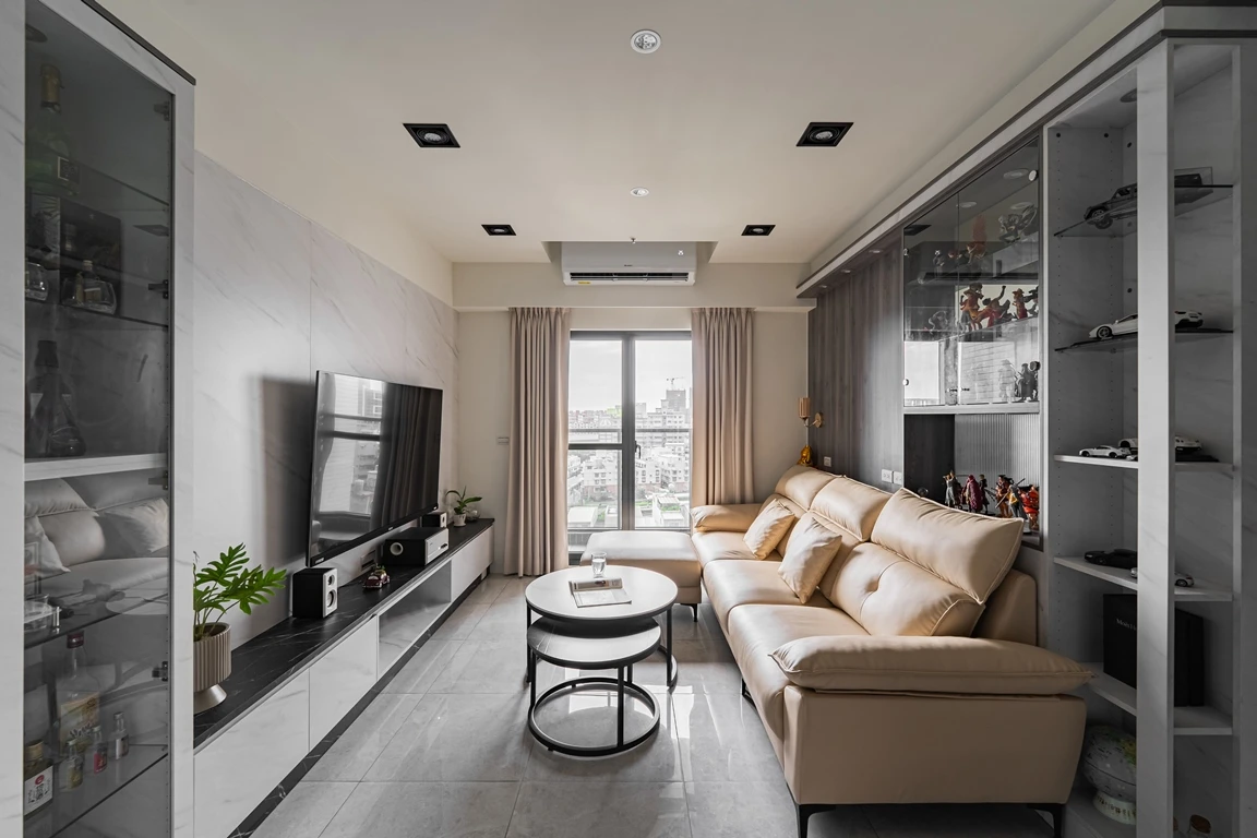 在有限的坪數裡,也能擁有最剛好的質感生活。 以沉穩墨色鋪陳整體基調,搭配柔霧光線與溫暖棕色沙發,打造出安靜卻不冷淡、內斂卻不壓迫的療癒客廳。 極簡線條、隱藏式收納與低調燈帶