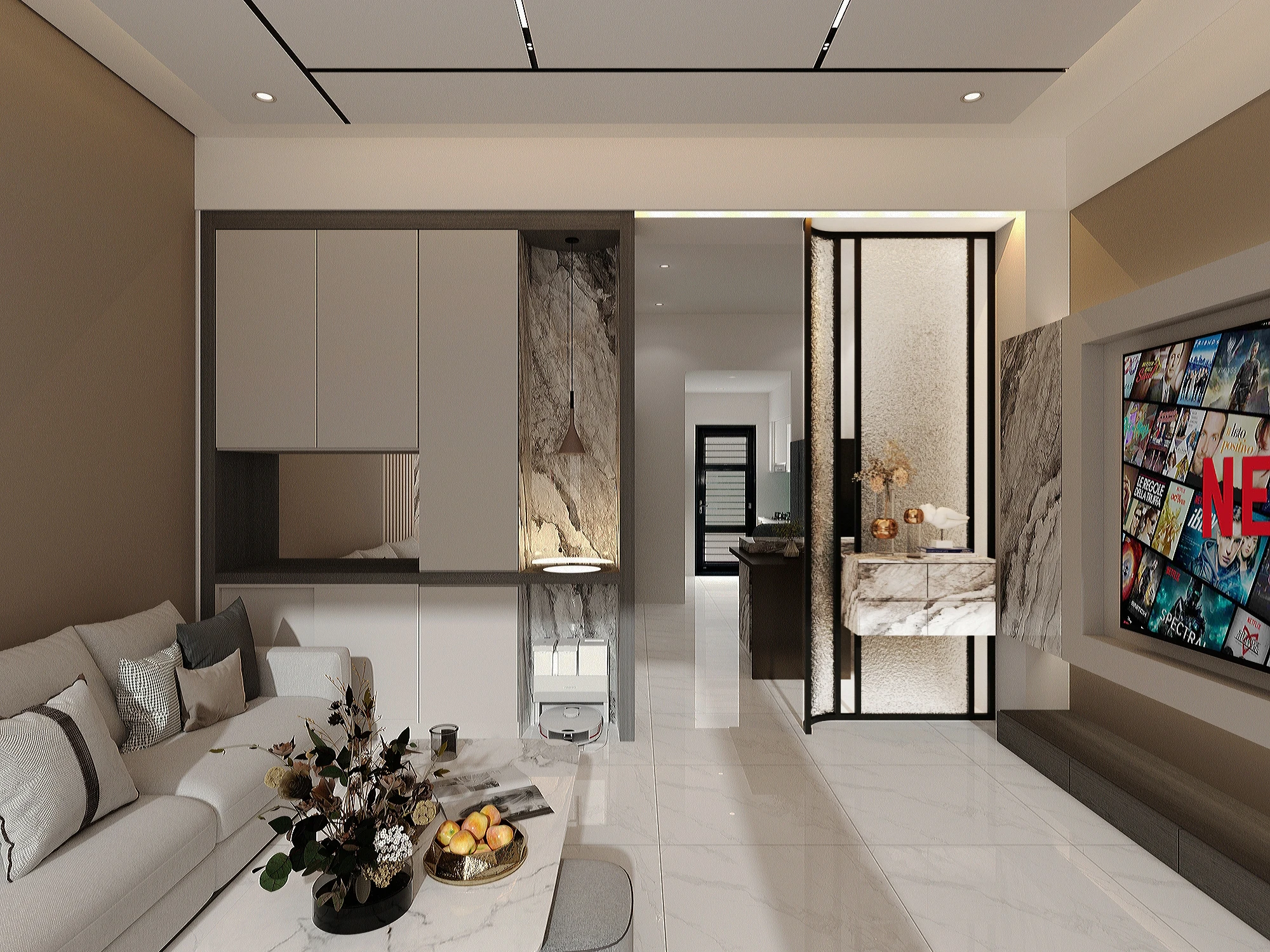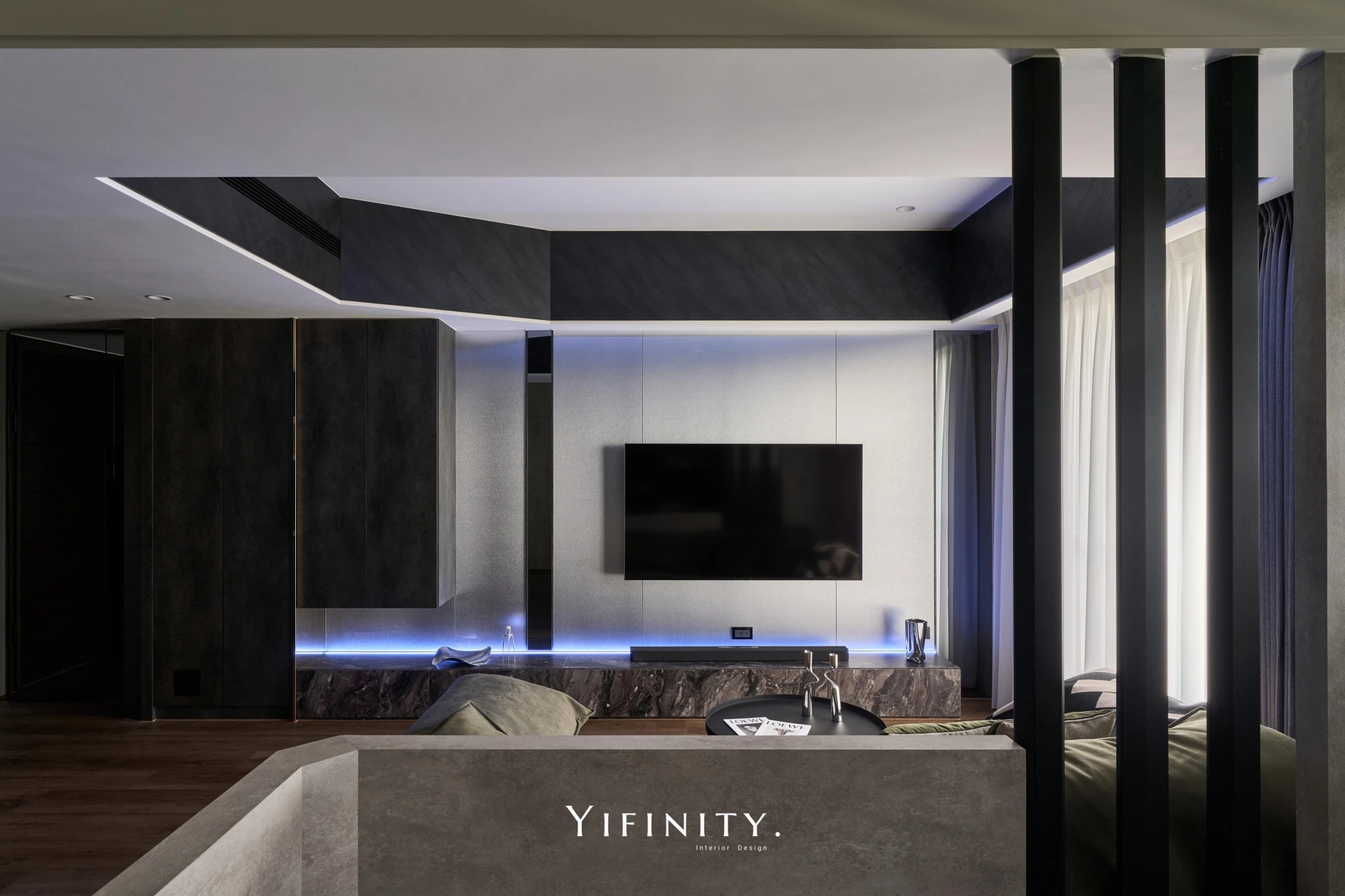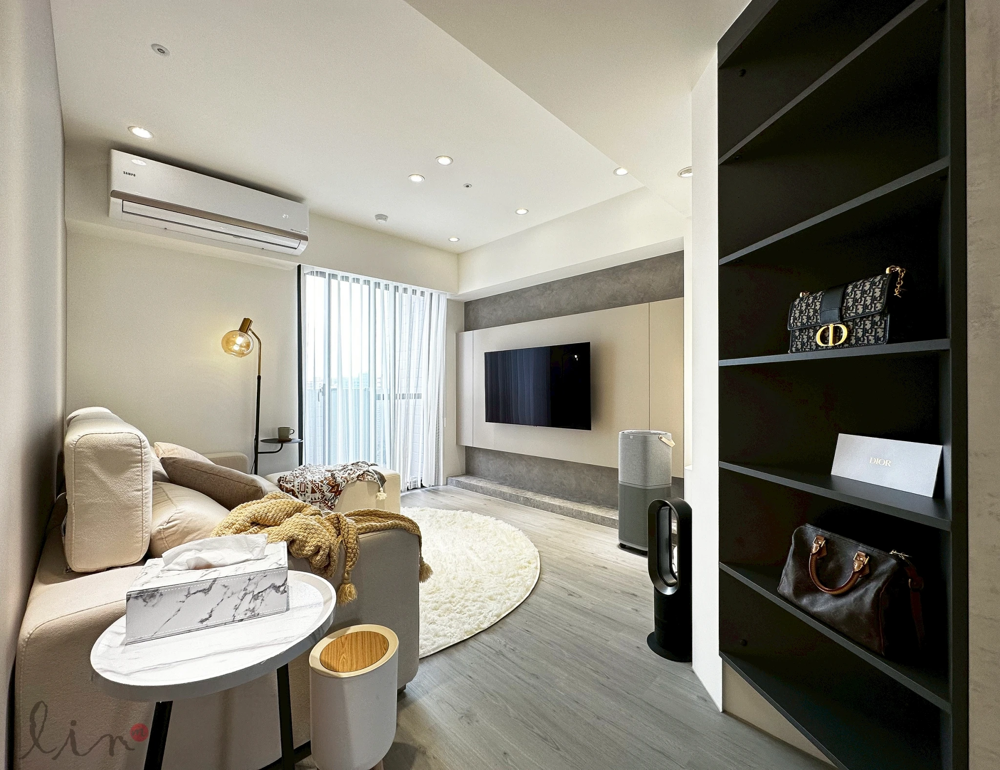 在有限的坪數裡,也能擁有最剛好的質感生活。 以沉穩墨色鋪陳整體基調,搭配柔霧光線與溫暖棕色沙發,打造出安靜卻不冷淡、內斂卻不壓迫的療癒客廳。 極簡線條、隱藏式收納與低調燈帶