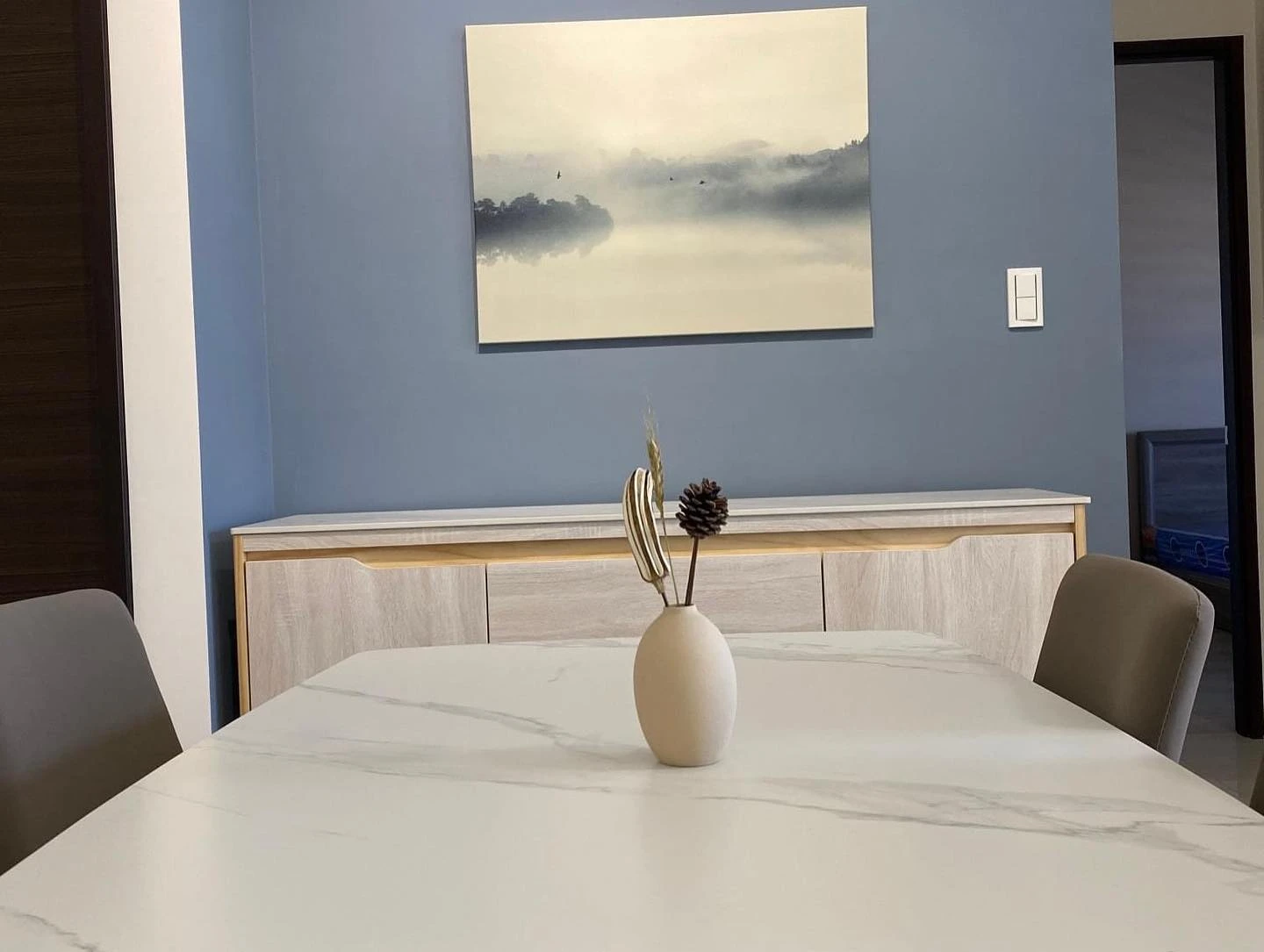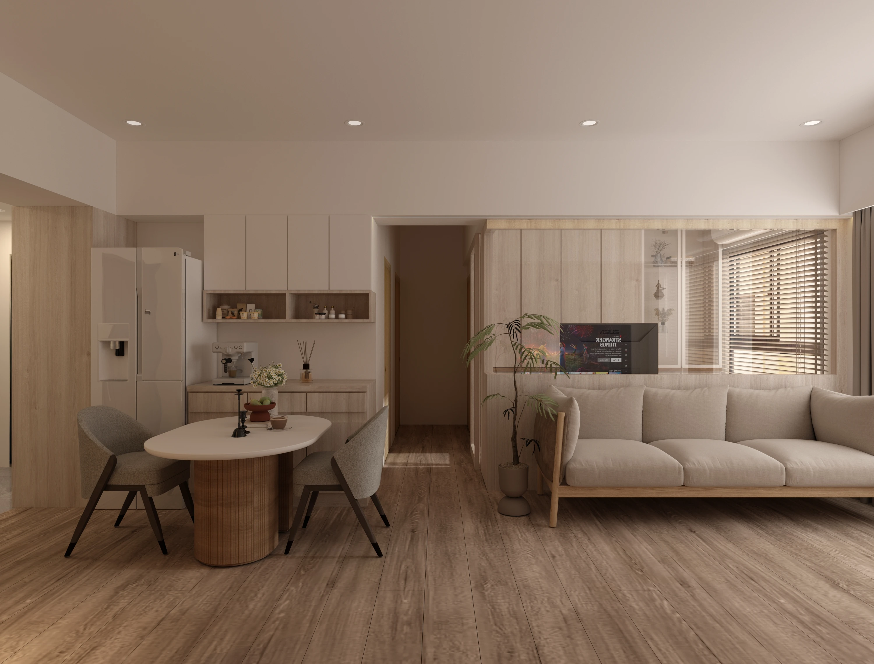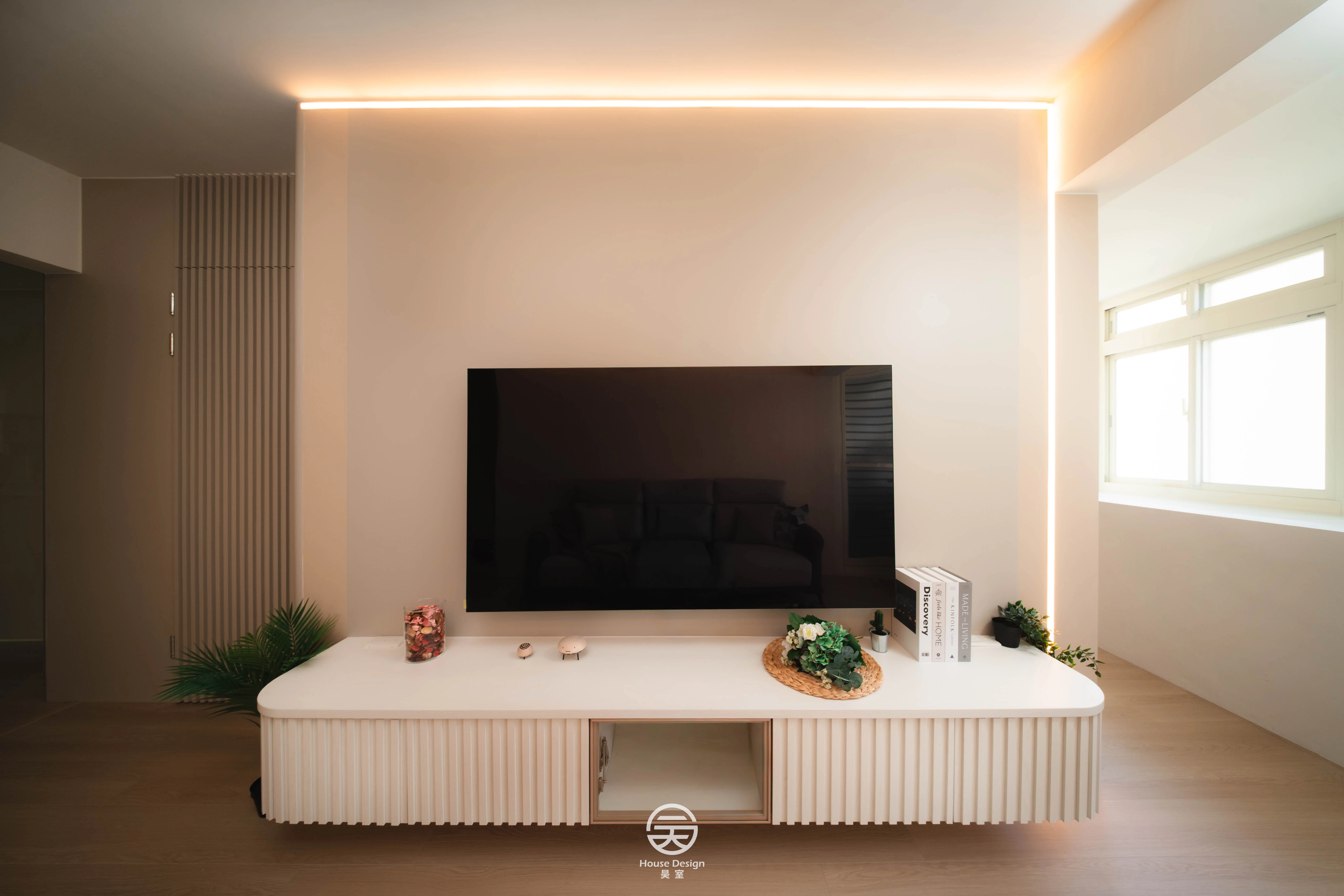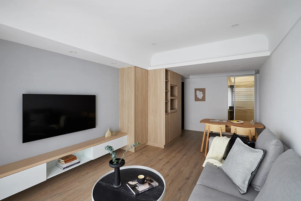 電視以極簡立柱支撐,視線零阻擋;客廳與餐廚自然串聯,空間感完全放大。 午後的光灑落在木地板上,連追劇都變成一種儀式感。 🌿 質感小宅的日常,就是這麼簡單又迷人