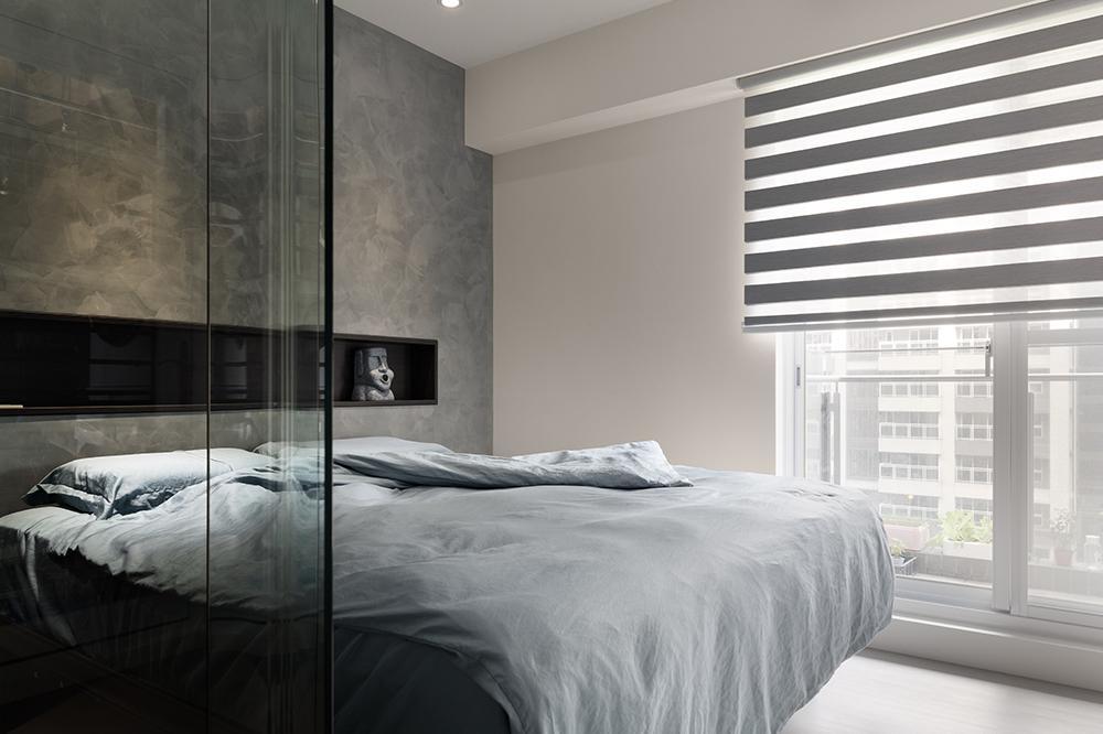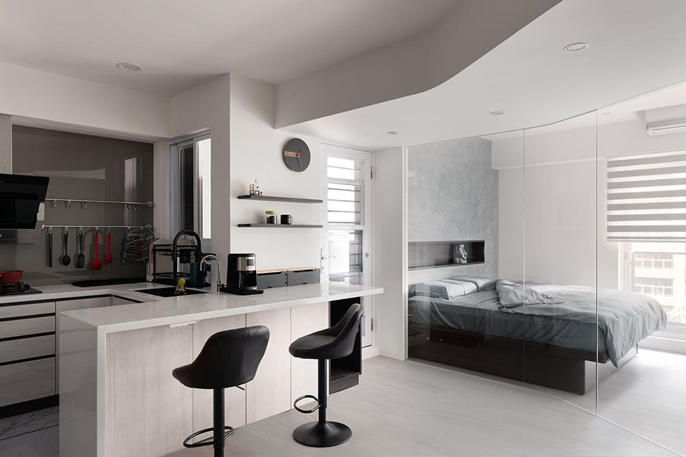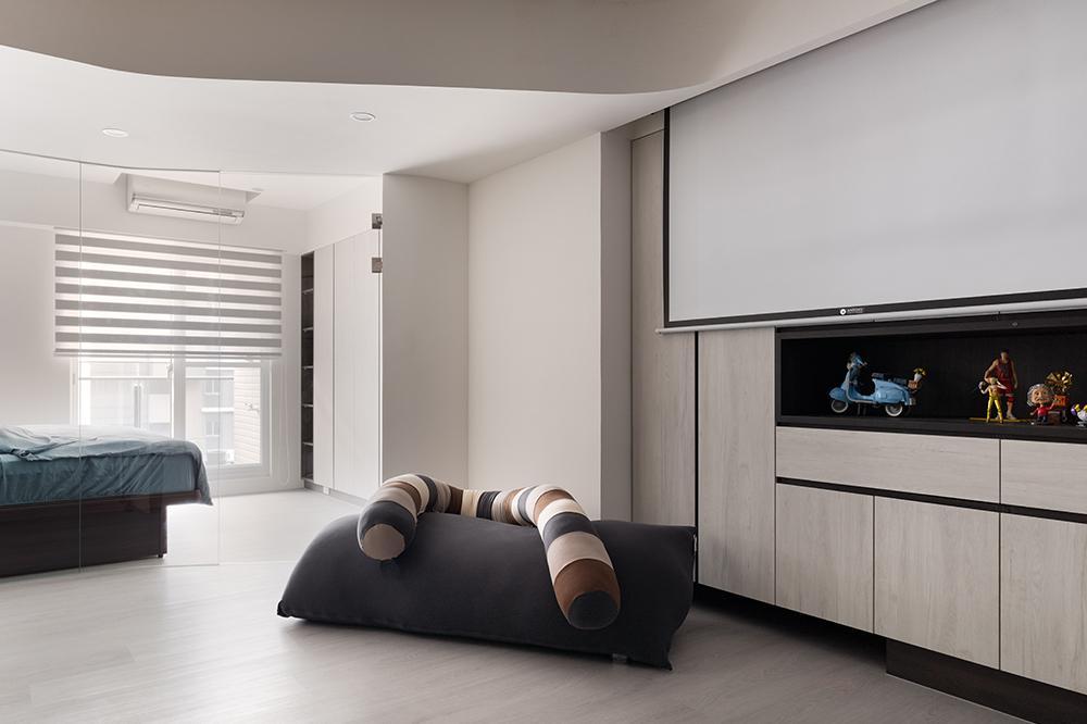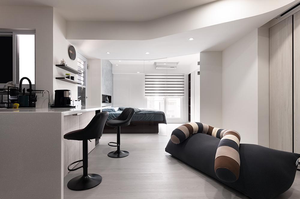原有格局屬於長方形空間,為保留空間延伸性與視覺開闊的特點,採用玻璃隔間劃 分公私領域,與弧型梁線做呼應,將日常收納融入其內,降低櫃體本身的厚實感, 使空間呈現出俐落而現代感的氛圍。