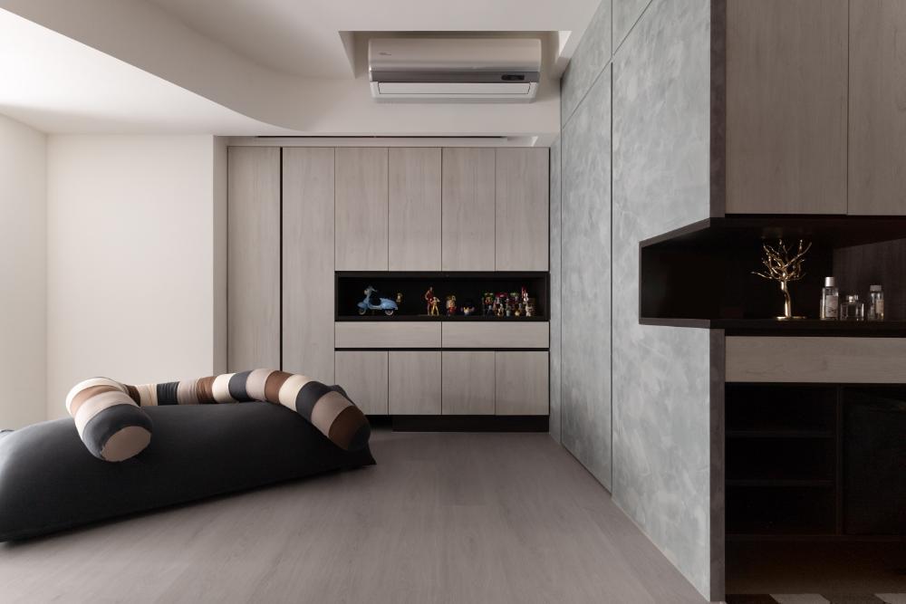 往往過於現代感的氛圍,讓人會感受到距離與冷淡,而此次空間的主軸為「住宅」 ,為了兼具時尚與溫馨感,於兩者之中加入藝術塗料點綴空間色彩層次,降低空間 中的冷冽感,讓整個空間呈現內斂而不失溫暖的空間感,營造出輕盈的生活姿態。