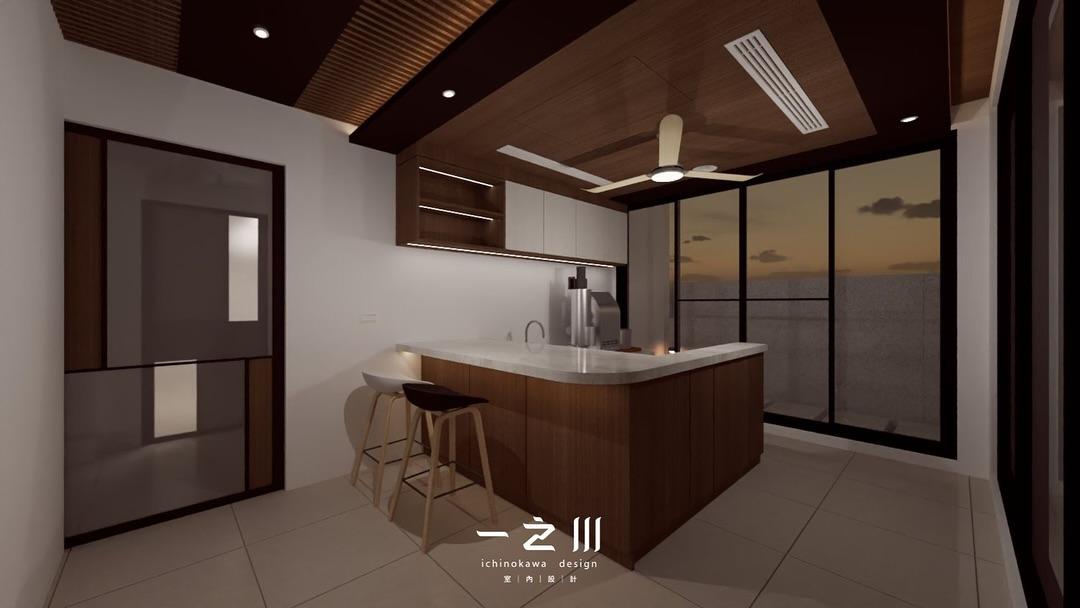 木質天花延伸溫度,搭配柔光石紋檯面,