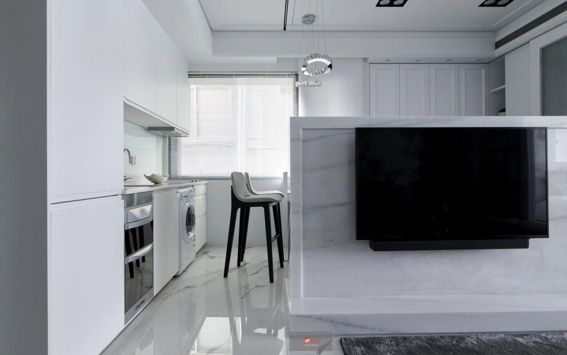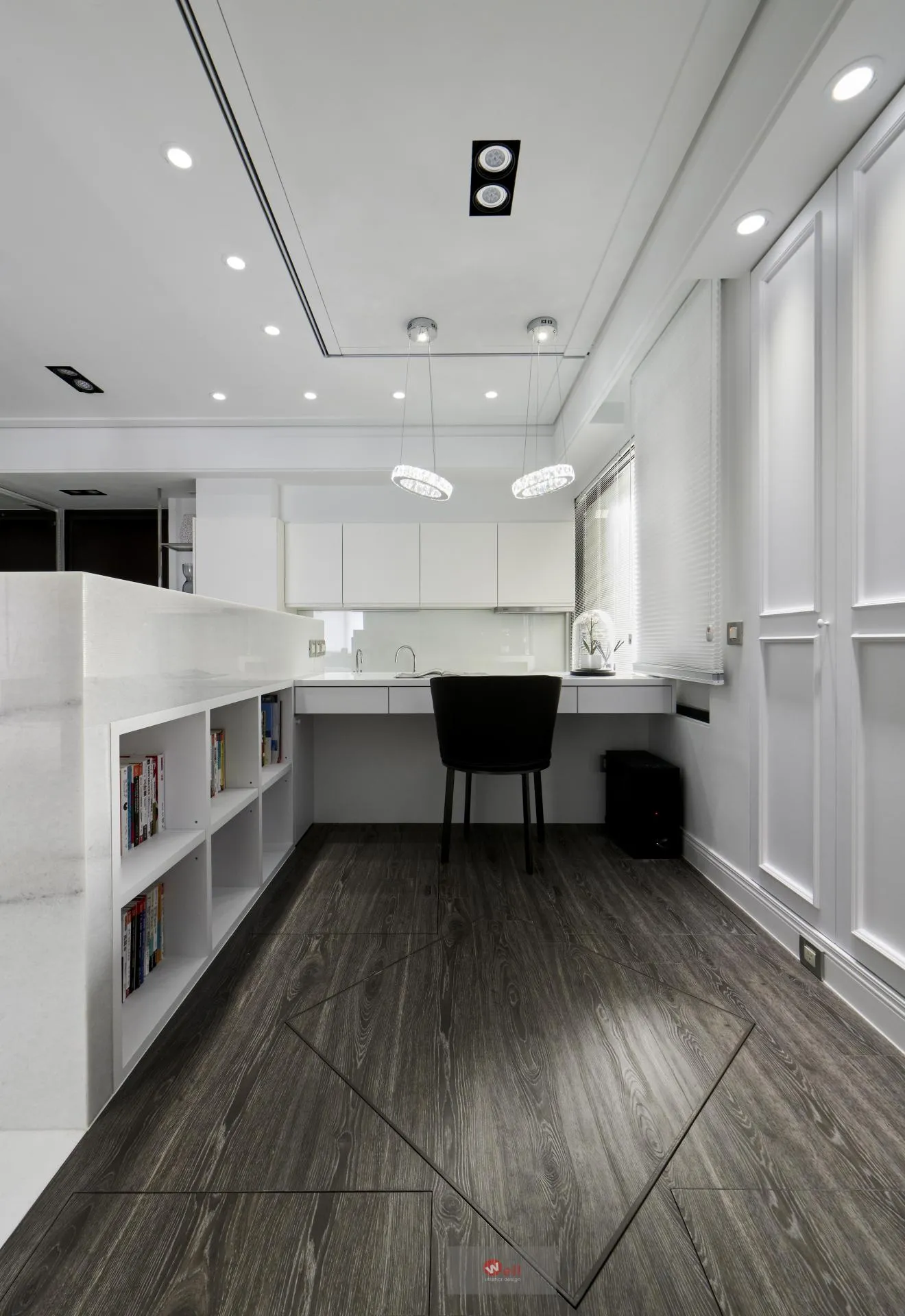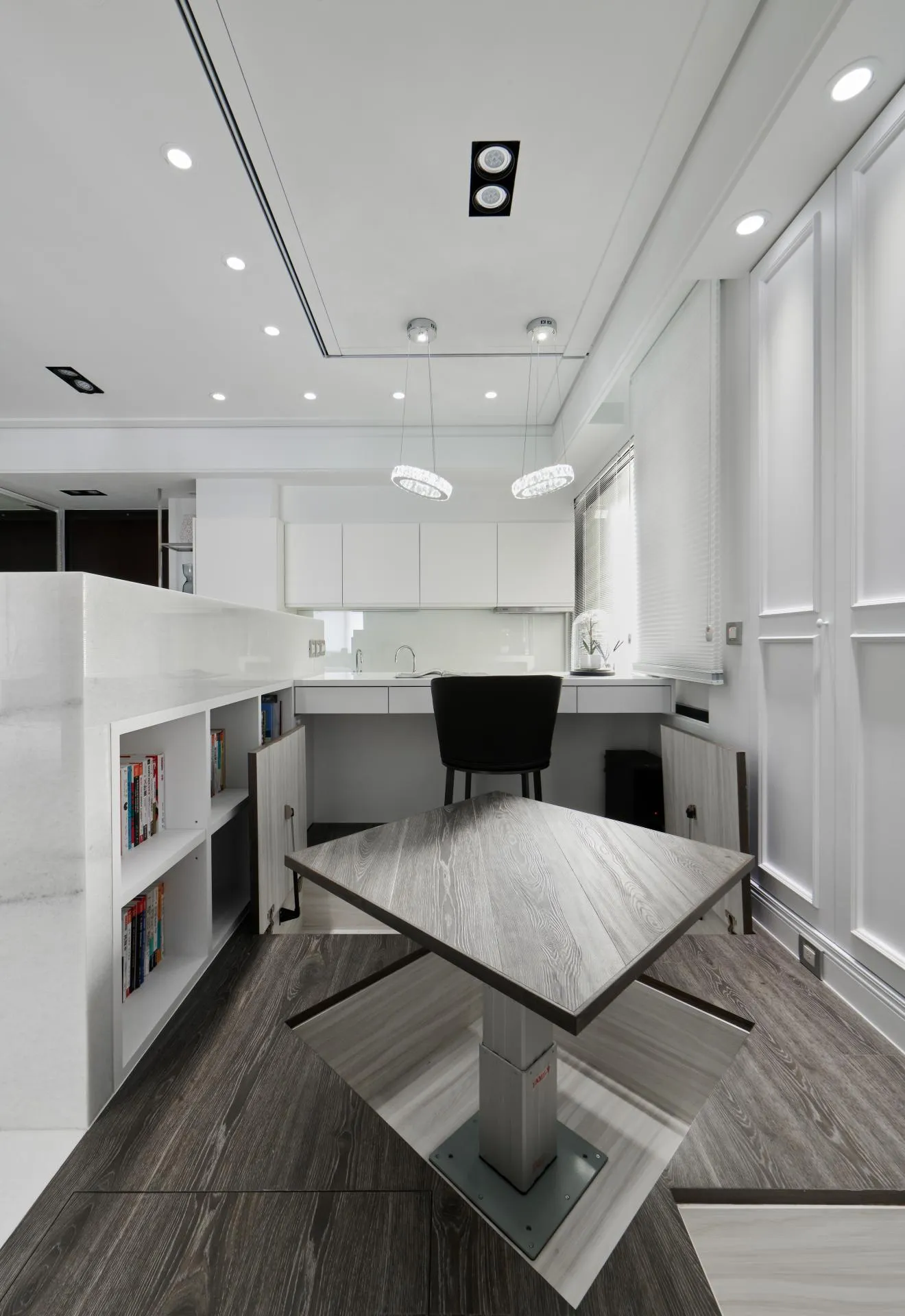 Behind the TV wall lies the multipurpose area, which serves a variety of settings including reading room, dining room, guest bedroom and Japanese-styled reception room. Matched with the extra guest bathroom, it can even be upgraded into an independent bedroom suite. In particular, the two sides of the dining counter can be used with chairs of different heights to interest, a feature well-loved by the users. In addition, the residence is fully installed with a floor heating system. The wall behind the sofa and the bedroom headboard are both made of stone-textured brick, with different textures pieced together along the horizontal and vertical axes, providing different expressions of the same material. A large series closet is placed at the end of the bed in the master bedroom, with the bathroom doorway integrated among them. The height of the ceiling in front of the closet is carefully calculated to include a 55-inch height-adjustable TV, a devil’s trick of a detail filled with thoughtful design within a clean and minimalist layout that optimizes the use of space.