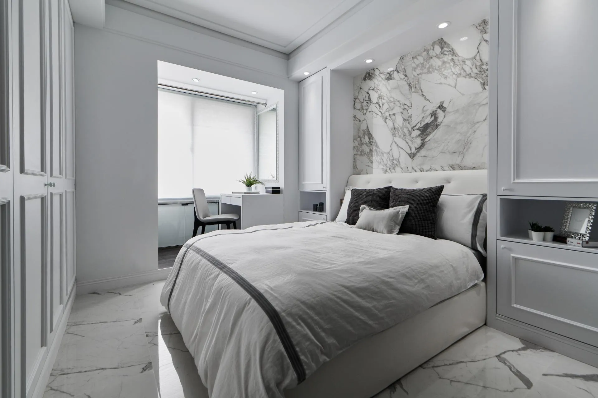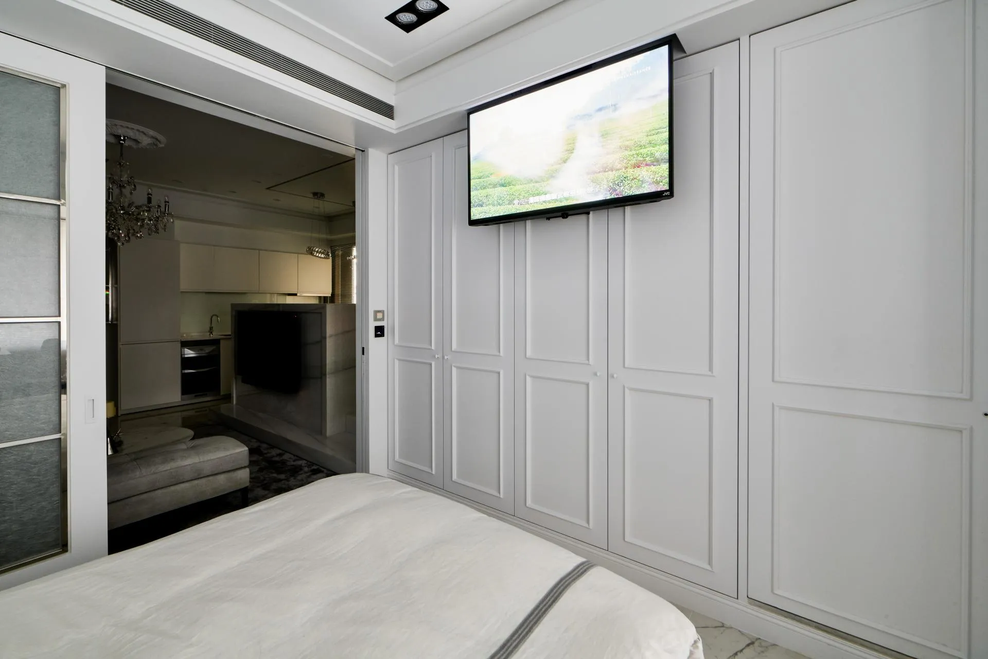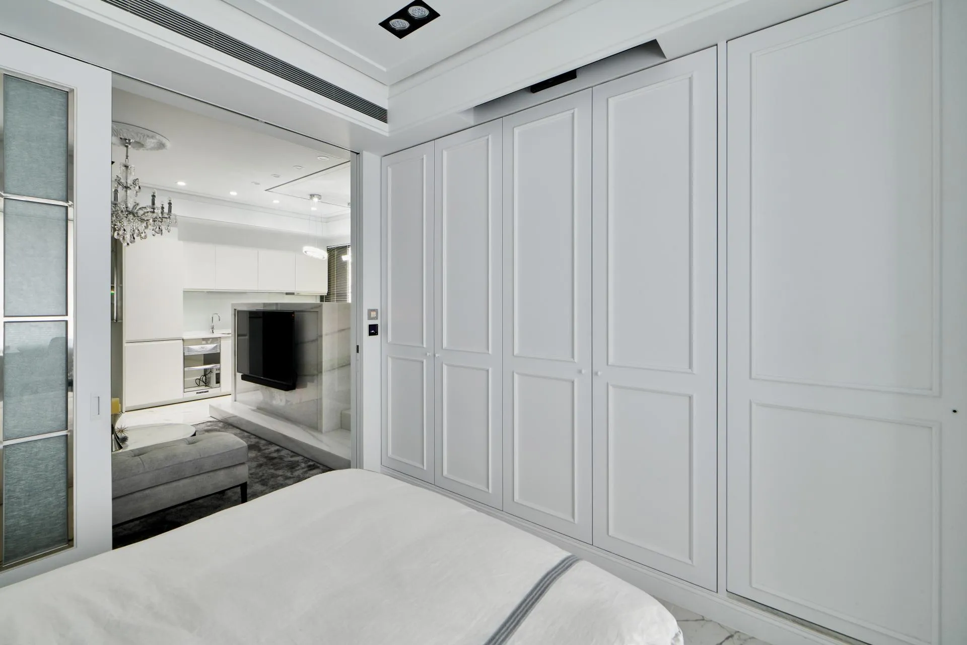 Behind the TV wall lies the multipurpose area, which serves a variety of settings including reading room, dining room, guest bedroom and Japanese-styled reception room. Matched with the extra guest bathroom, it can even be upgraded into an independent bedroom suite. In particular, the two sides of the dining counter can be used with chairs of different heights to interest, a feature well-loved by the users. In addition, the residence is fully installed with a floor heating system. The wall behind the sofa and the bedroom headboard are both made of stone-textured brick, with different textures pieced together along the horizontal and vertical axes, providing different expressions of the same material. A large series closet is placed at the end of the bed in the master bedroom, with the bathroom doorway integrated among them. The height of the ceiling in front of the closet is carefully calculated to include a 55-inch height-adjustable TV, a devil’s trick of a detail filled with thoughtful design within a clean and minimalist layout that optimizes the use of space.