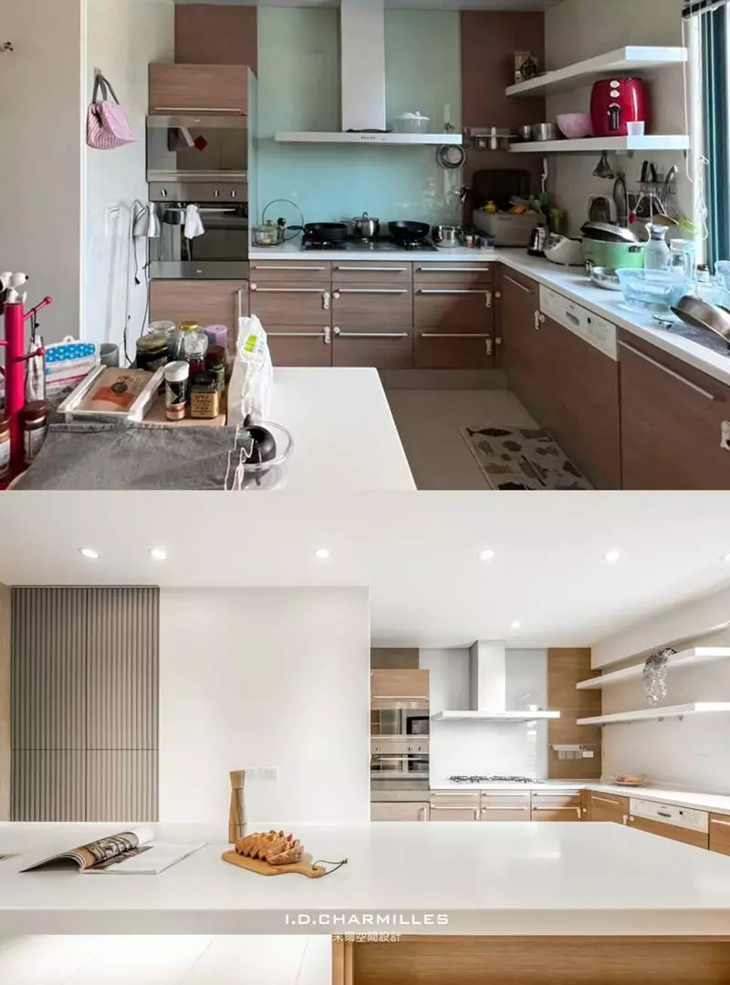 施工前我們用心諮詢了解屋主需求與生活習慣,以米爾團隊的親切專業和奇妙之手的力量來改造!客廳的部分以木質調和白色為主要,使人一進家中便能感到輕盈、清爽自在,也增加了收納和展示空間,讓生活便利性與好心情同時擁有,大片落地窗的位置是淺灰系的窗簾,使白天光線柔和且舒服的灑落下來,晚上則有崁燈照進暖光,點亮幸福的家,餐廳結合廚房二合一,視覺放大了一倍,搭配白色潔白美麗中島和酒櫃,讓功能性大大提升,也凝聚了家人之間的感情,可以一同準備美味佳餚、分享每日樂趣和酸甜苦辣。