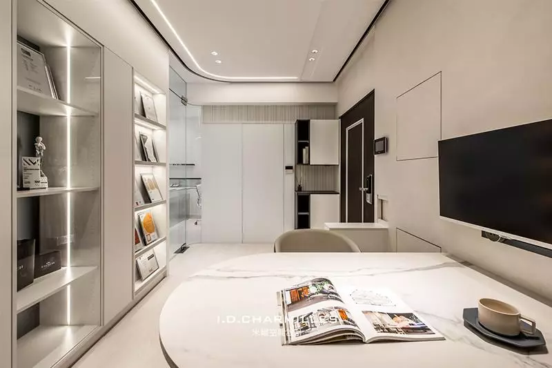 會議區以一張訂製的圓弧桌為中心,與弧形天花相互呼應;側邊打造「榮譽櫃」,櫃體運用氟酸玻璃、軟條燈與烤漆質感的塗料,營造出溫潤的光暈效果,進而把獎狀、獎盃襯托得更有質感。