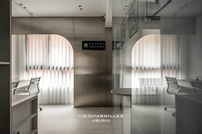 辦公室牆面以帶有珠光的藝術漆賦予空間色彩,另融入直線元素,讓簡約的環境更顯俐落。窗面加入弧形不鏽鋼造型牆,形成剛中帶柔的端景效果。