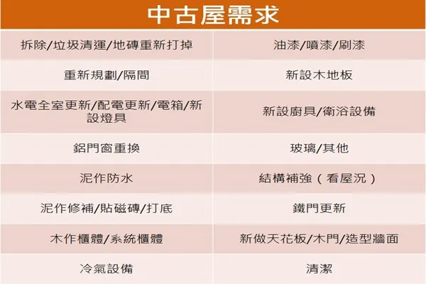 一般來說,中古屋的裝修工程會較新屋來的複雜許多,蔡昀璋設計師提醒大家,若是水電設備超過 15年以上就建議要更新,另外,他也列出中古屋裝修會包含的工程清單: