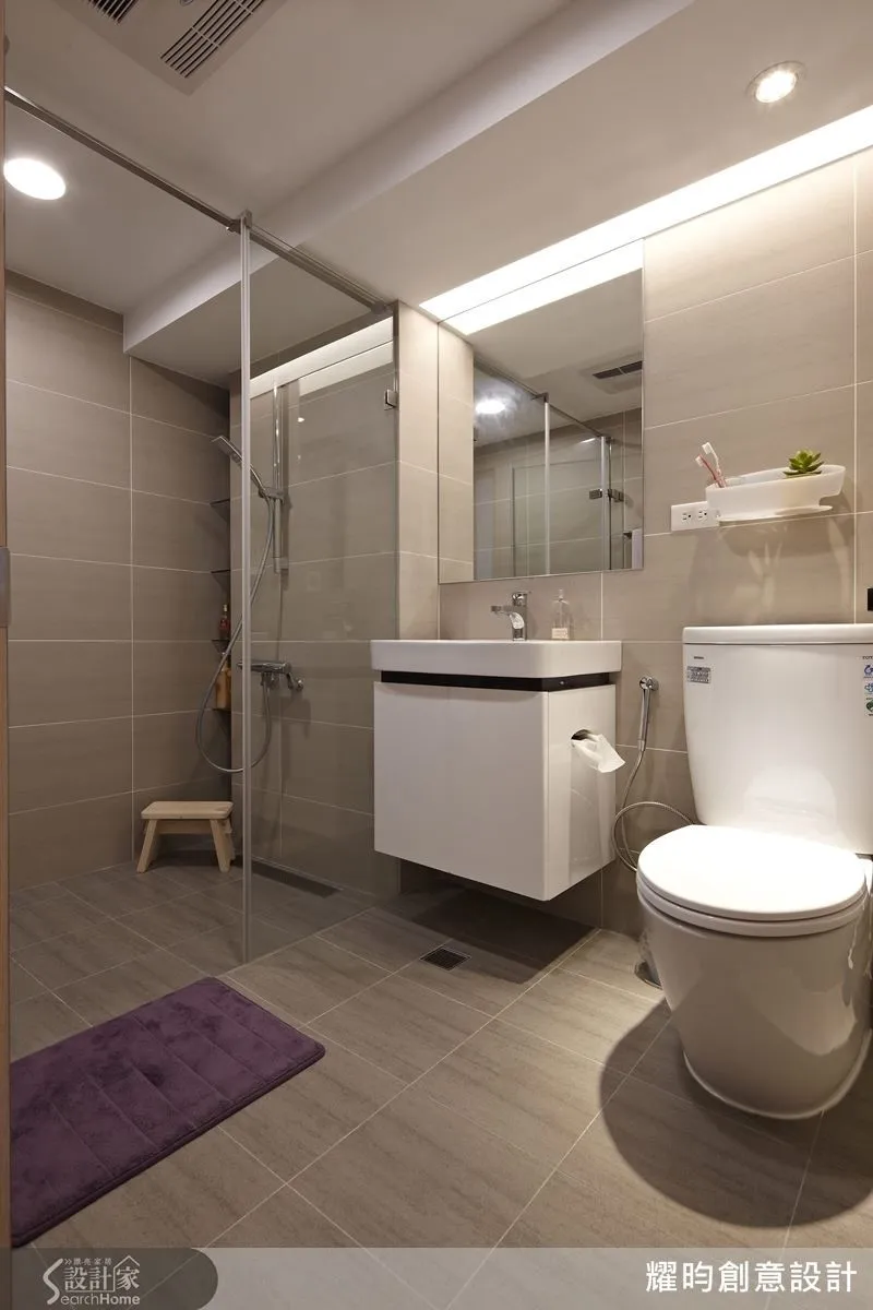 為了讓衛浴空間乾爽好清理,選用清玻璃,讓空間顯得輕透,鋼琴烤漆的櫃體門片則是深具質感加上乾溼分離的設計,提升衛浴空間的機能性。