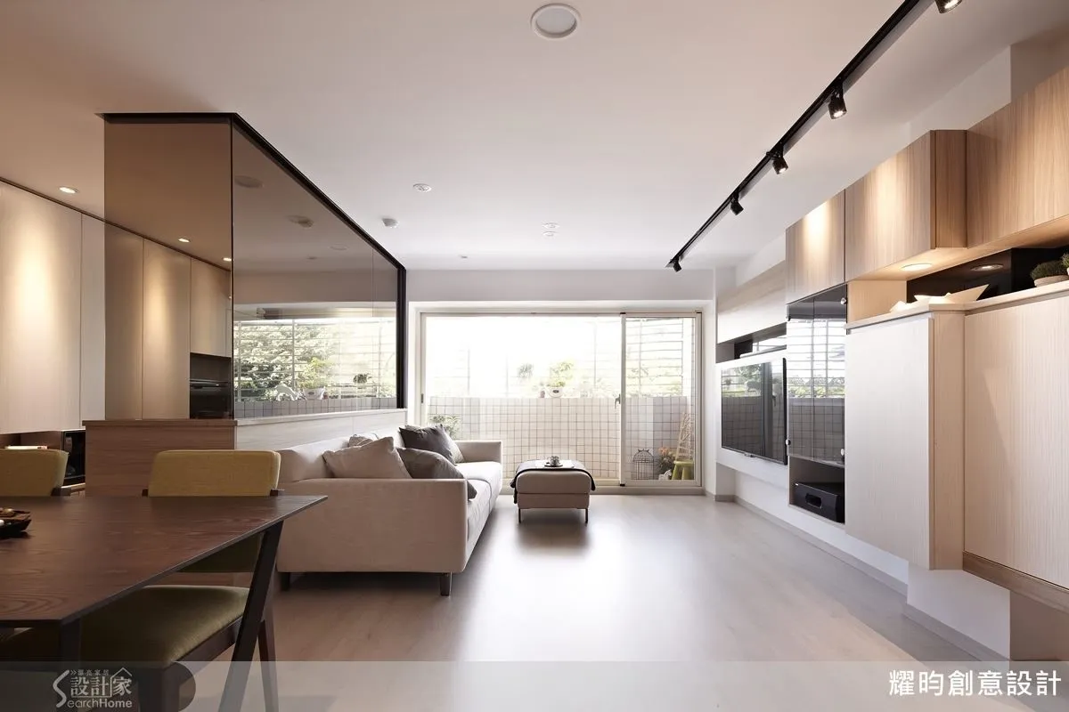 天花運用吸頂燈及軌道燈的鐵件效果刻劃空間線條,而雙色訂做系統櫃,搭配玻璃與鏡面,營造出極具變化又有質感的現代風氛圍,也強化客廳收納空間。