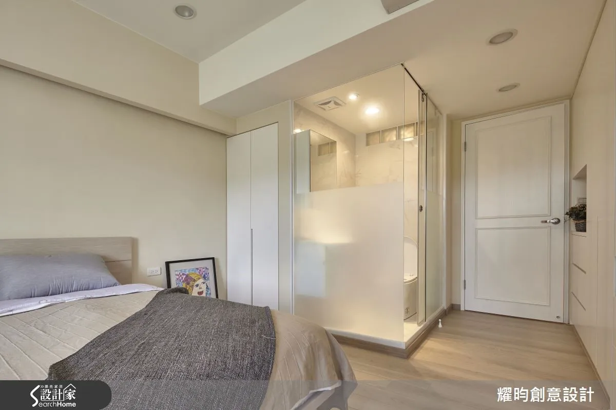 設計師採玻璃隔間區隔主臥衛浴及睡眠場域,並將清玻璃、霧面玻璃兩種材質結合,打造出通透又隱蔽的視覺感,同時於牆面配置鏡面吊櫃,將機能做出整合,營造使用上的多元彈性!