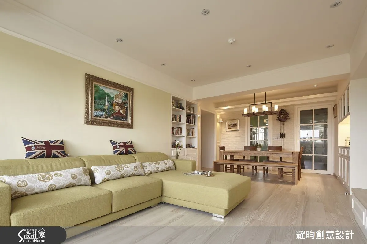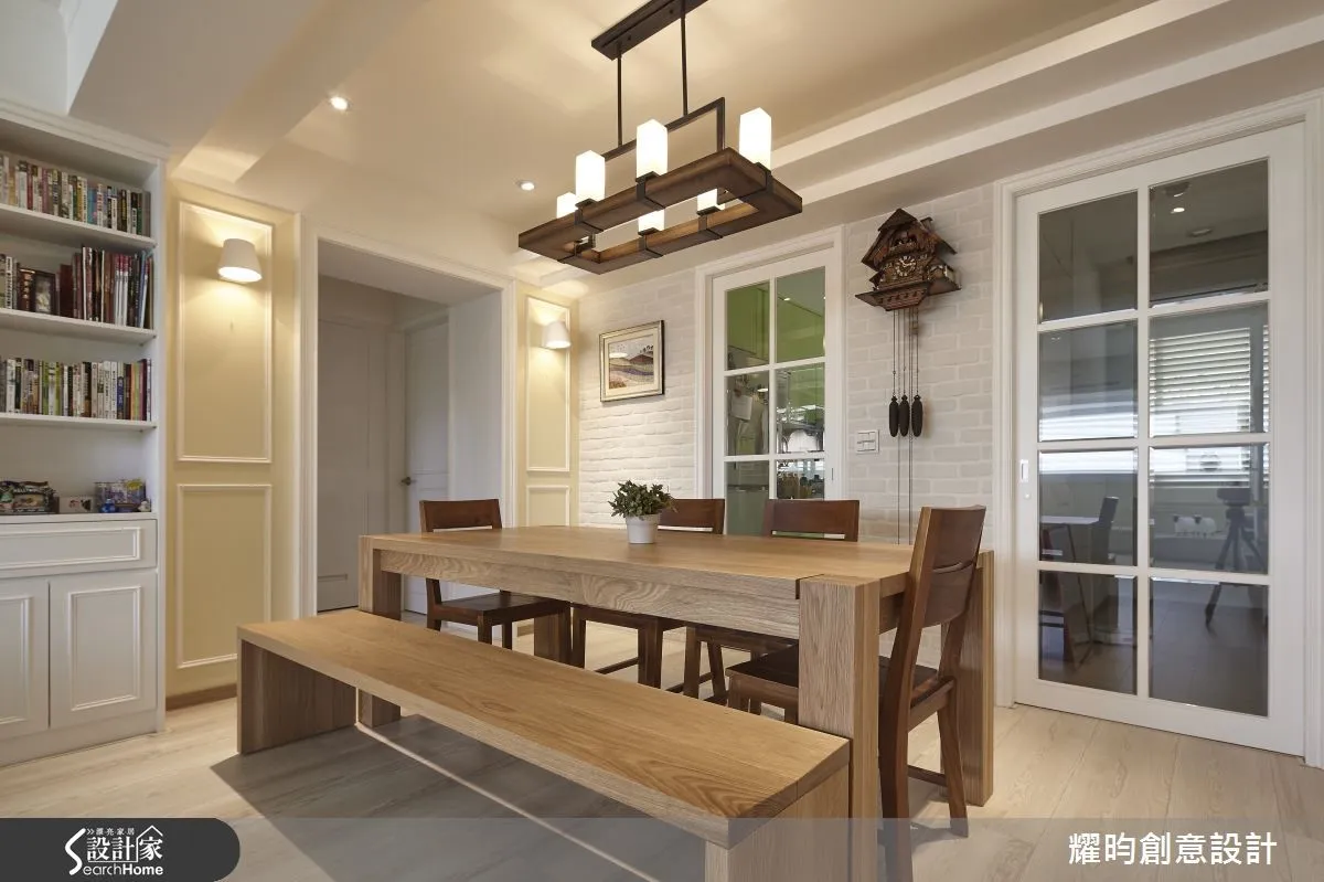 公領域中,設計師以淺黃色調鋪陳牆面,搭配薑黃色軟件,形成輕盈視感,並於牆面點綴創意畫作,建構隨興的美式格調,同時讓視聽櫃延伸至窗邊,開拓出臥榻檯面,且於底部暗藏收納空間,形成舒適、機能兼具的休憩小天地,沙發背牆則於左右兩側規劃書櫃空間,底部佐以細膩的線板線條,提升櫃體層次;餐廳領域陳列木質大長桌,搭配吊燈量體與古董掛鐘等,挹注溫潤古樸的氣息,並配置清玻格子門片做為場域界定,讓居家採光得以自由流通,開啟通透感受;走進臥房內,則可見櫃體門片與立面結合的隱藏設計,讓空間線條顯得清爽簡練,床邊一隅則規劃木質書桌,搭配小窗灑進的明亮天光,區劃出不受干擾的寧靜閱讀角落!
