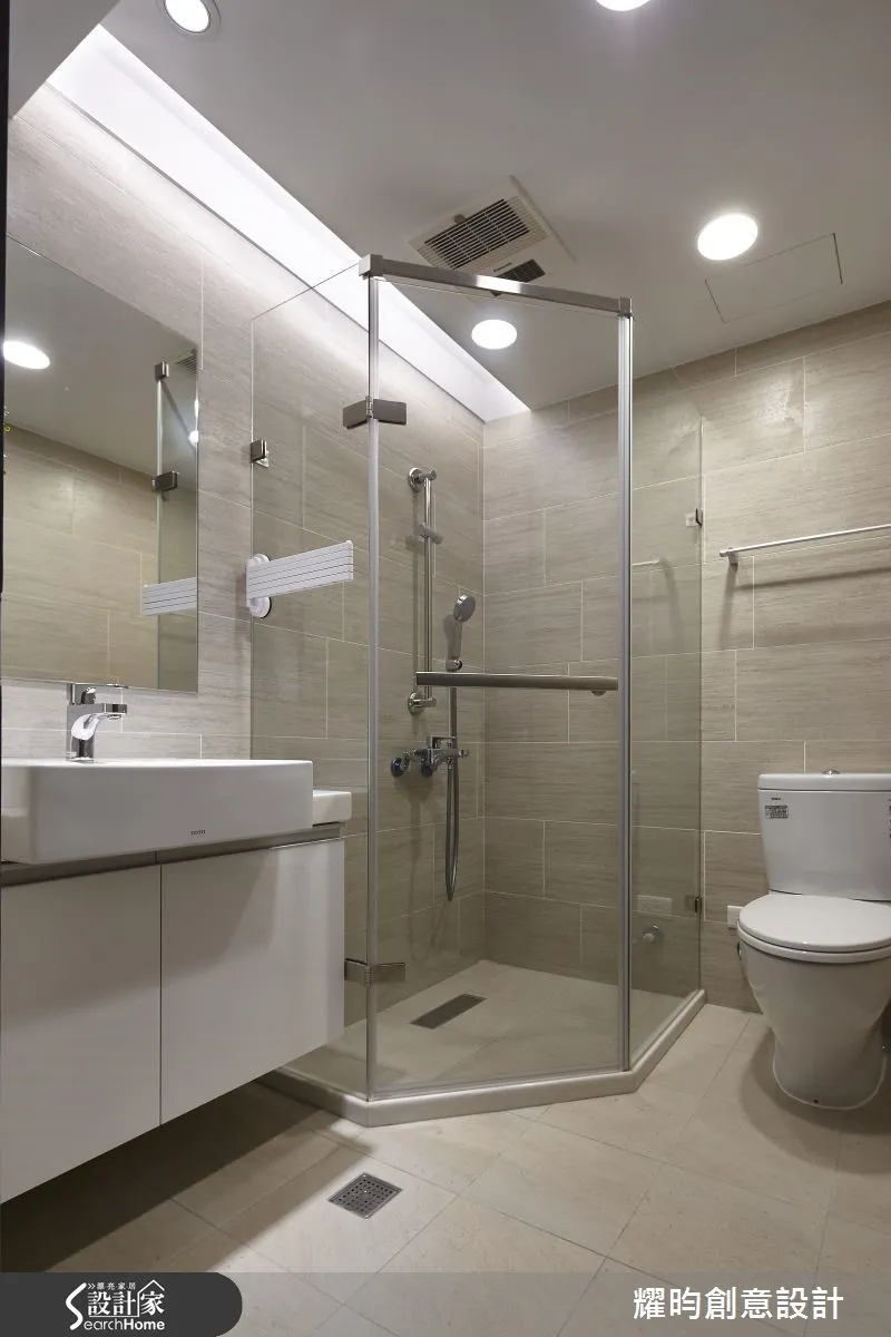 衛浴內善用邊角地帶,以清玻圍塑五角型區塊,打造乾濕分離空間,藉由特殊的領域劃分,以保留較多的留白,讓空間使用更有餘裕!