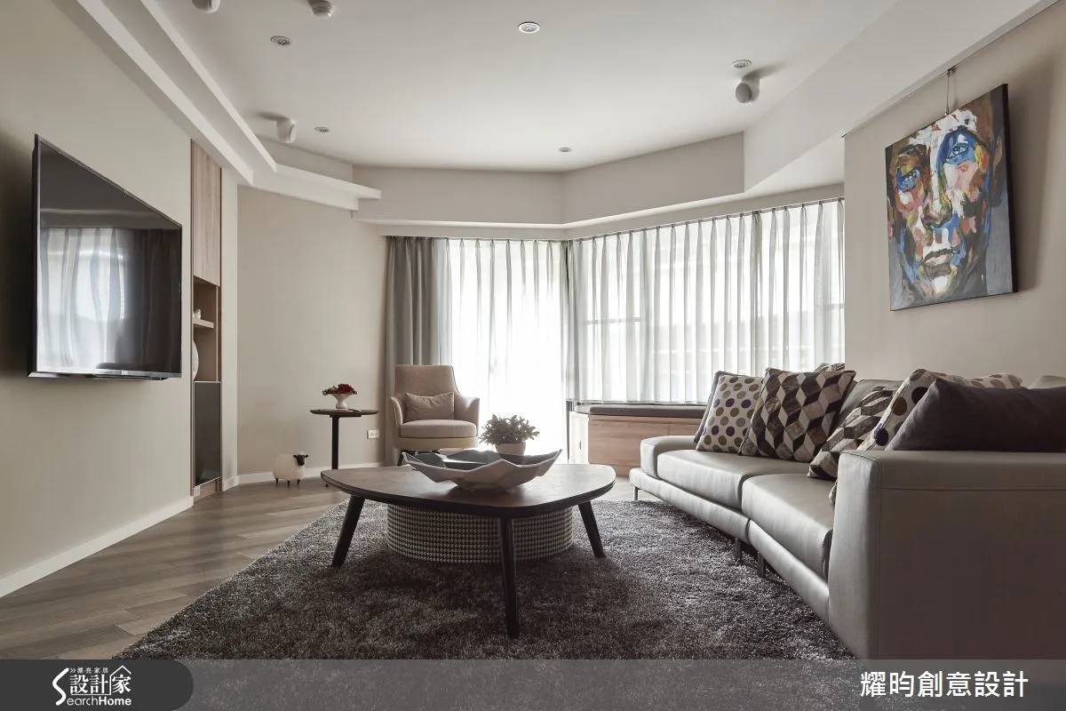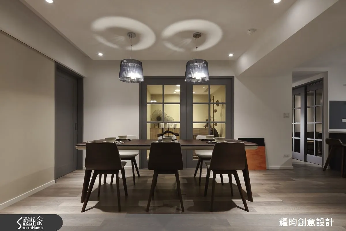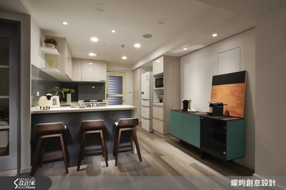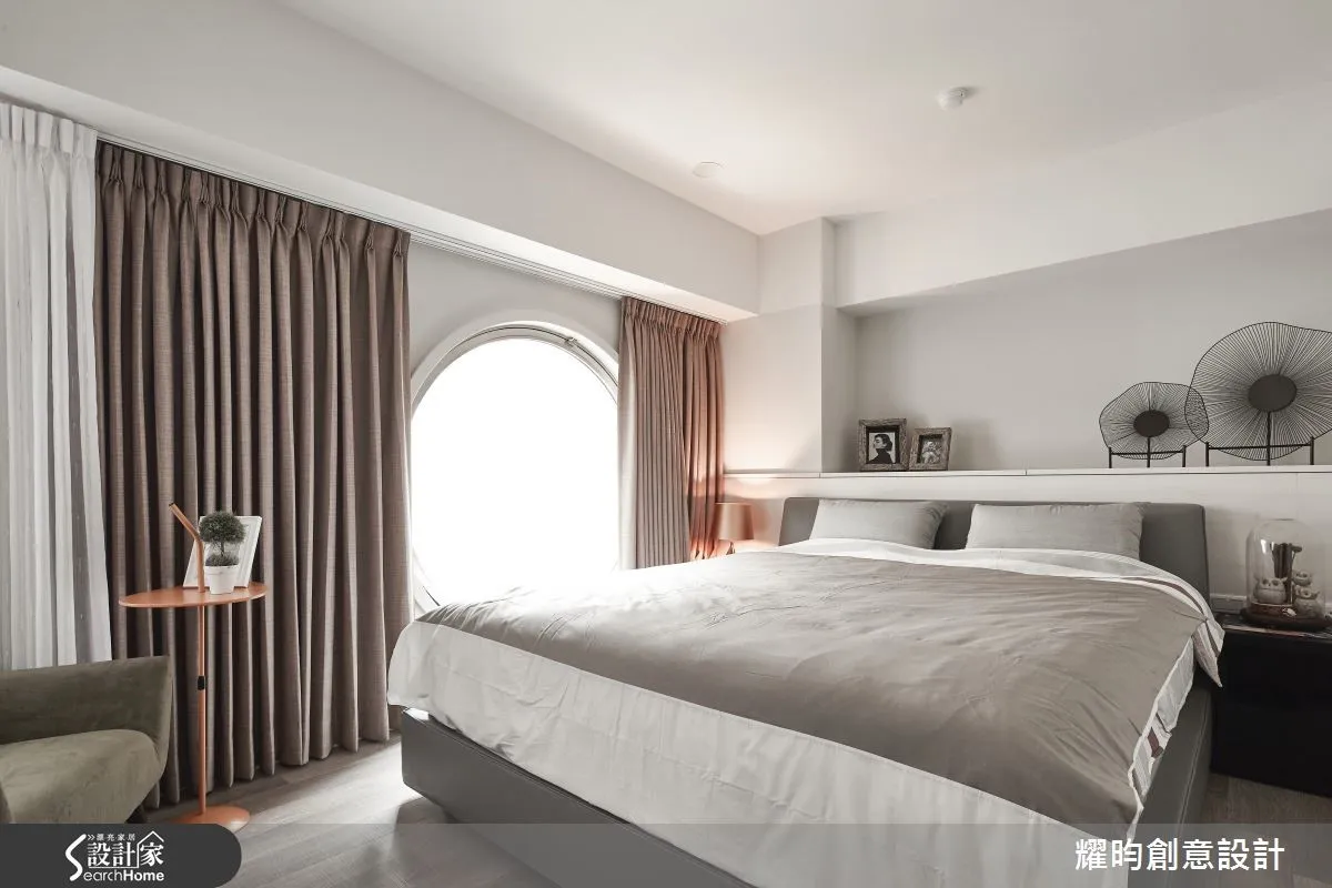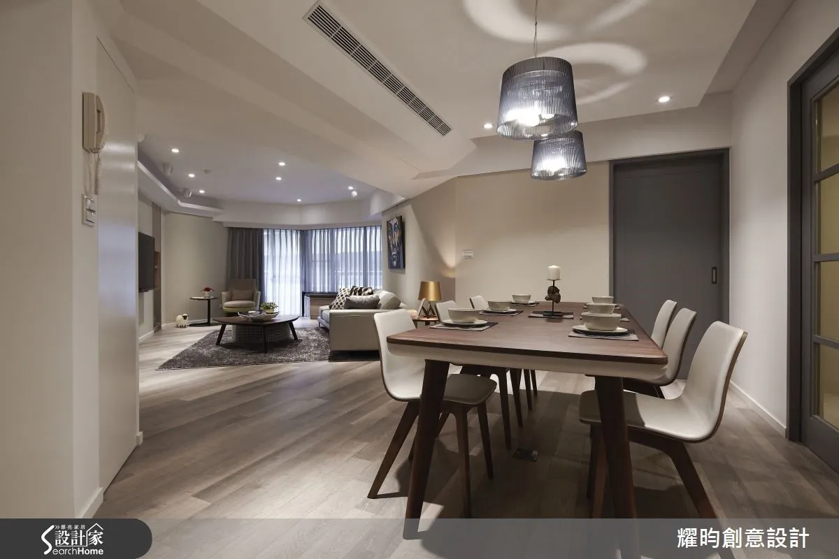 走進客廳,可見天花板特殊的折線造型,搭配簡約嵌燈塑造居宅個性,沙發牆則鋪陳淺色調作為背景,將多彩壁畫襯托得更為醒目,牆面後則延伸臥榻場域,並加入木作層板於臥榻底部規劃隱藏櫃體,把格局與收納機能完美結合;沿動線來到餐廳,則在天花懸吊兩盞吊燈營造優雅氛圍,使光暈向上漸染,產生漂浮視覺感,並將空調設備隱於傾斜天花內,形成順勢自然的風向,打造舒適情境,牆面則規劃對開格子拉門,藉由清玻延伸場域深度,塑造櫥窗般的美好意象;廚房結合了吧檯打造輕食區,一旁則透過櫃體、畫作等提升空間彩度,形成畫龍點睛效果;臥房內透過極簡白體現現代風尚,並融入獨特的圓型窗戶,使方正的格局線條更顯柔和!