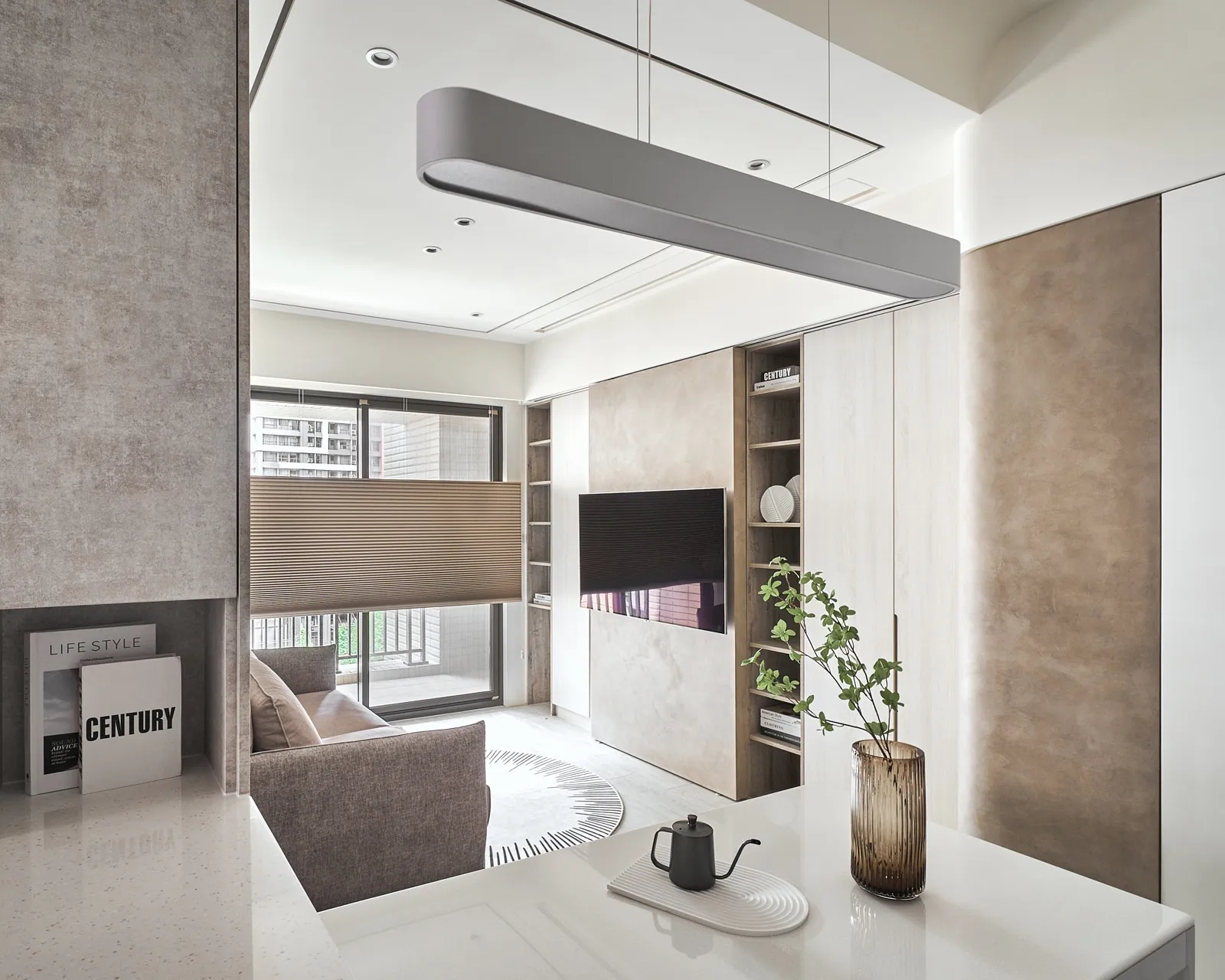 電視牆幾乎是客廳必備,但在小坪數空間中,若只是單純掛電視,等於浪費了一大面牆。把電視牆設計成可移動式,正面能作為影音娛樂中心,背面則是隱藏收納櫃,用來放雜物、書籍甚至小型家電。