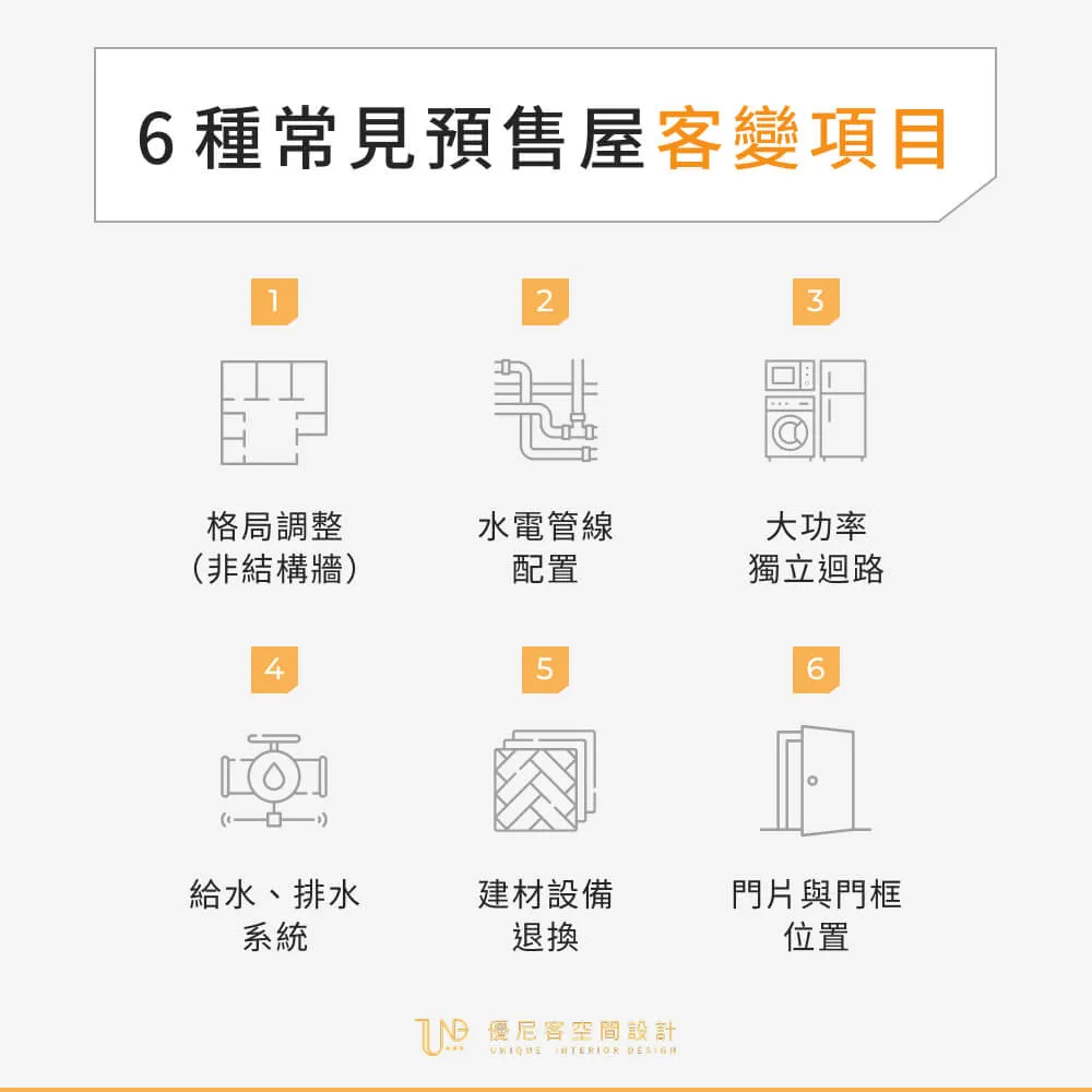客變的重點在於處理那些交屋後拆改成本高昂且困難的「基礎工程」。這些調整一旦在結構體完成後動工,將耗費巨額金錢與時間。以下是預售屋客變最應該優先處理的 6 個基礎工程項目: