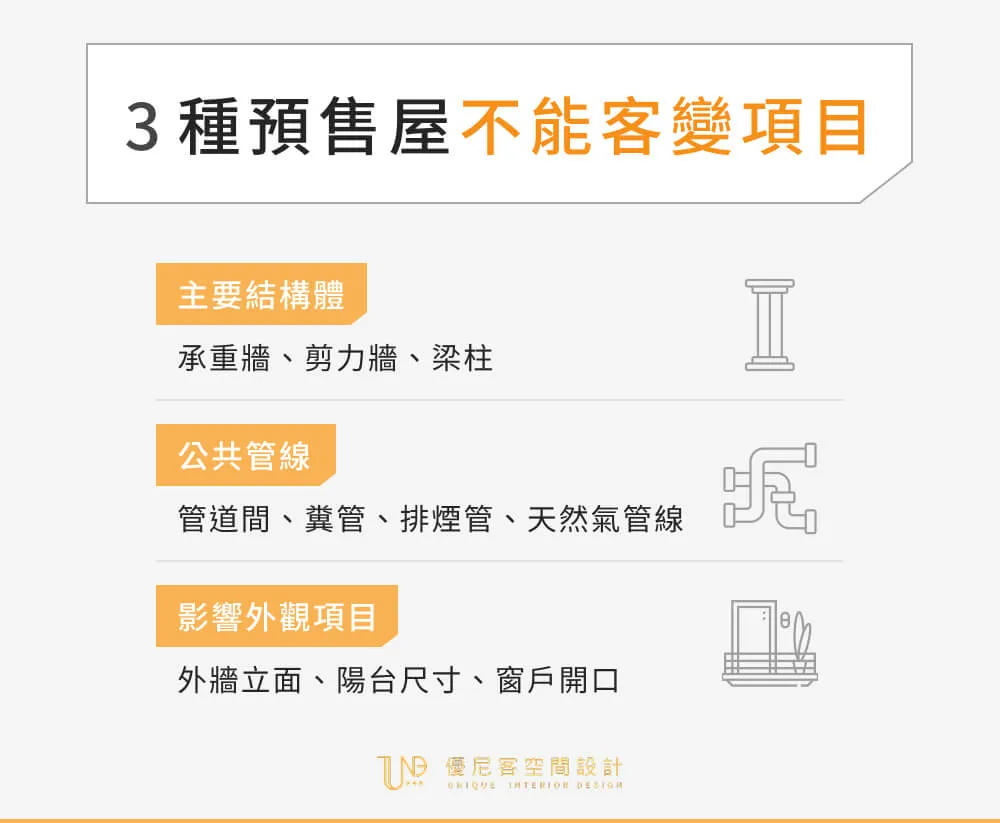 預售屋客變雖然具備高度彈性,但一旦涉及建築結構安全或法規紅線,就不能任意變更。這不僅關係到個人住戶的安全,也牽涉整棟建築的合法性與公共權益。若違規變動,可能導致無法取得使用執照,甚至面臨法律責任。以下整理出客變時不能調整的 3 大類項目: