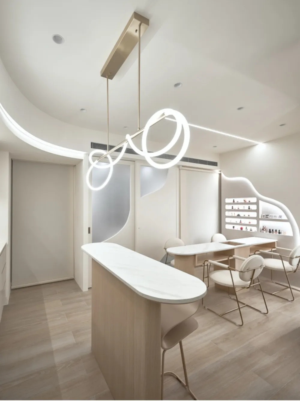 視覺減壓:低飽和色彩與圓弧線條的結合,避免視覺過度刺激,讓空間更加舒適。