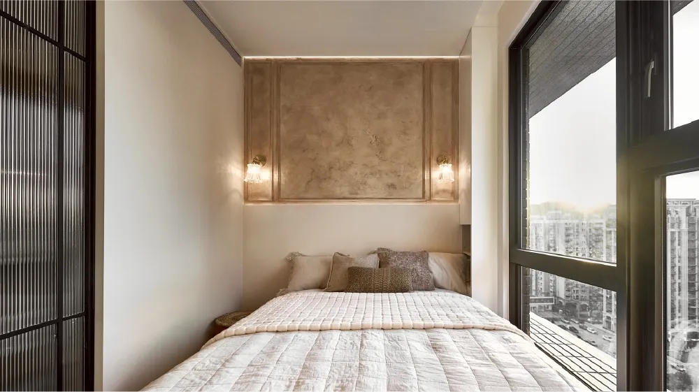 這間臥房巧妙運用深淺奶油色調,創造出舒適又富有層次的視覺效果。床頭牆選用淺暖棕的特殊漆面,搭配精緻的線板造型,為簡約的奶油風注入一絲法式復古的精緻感。