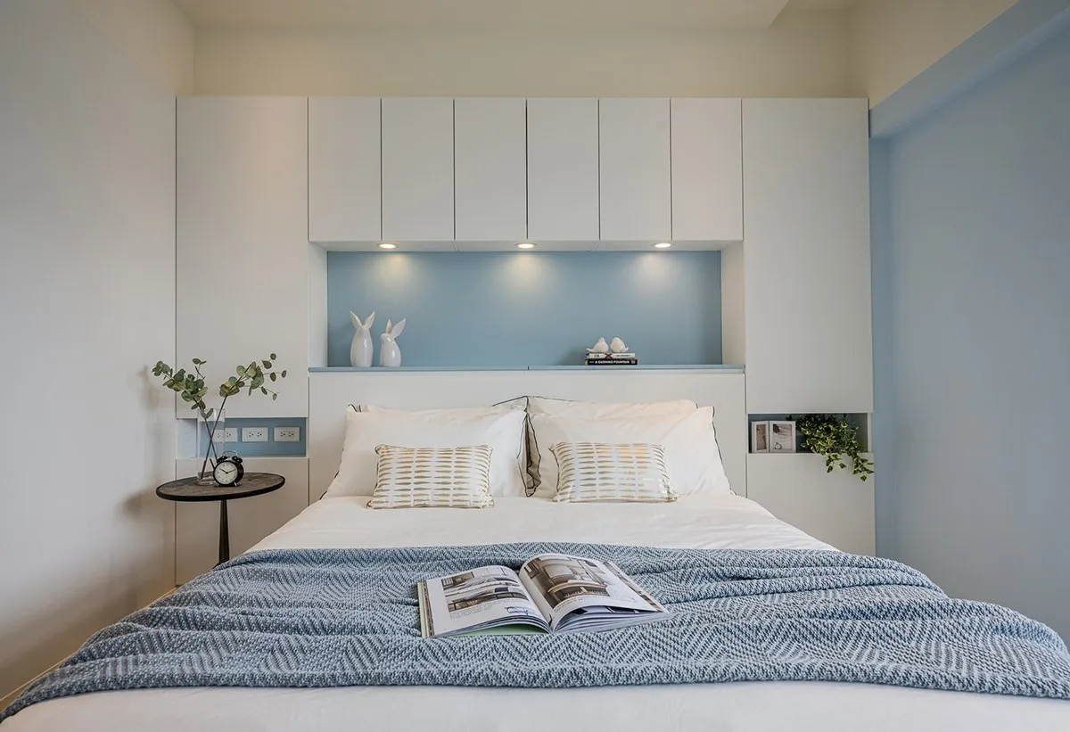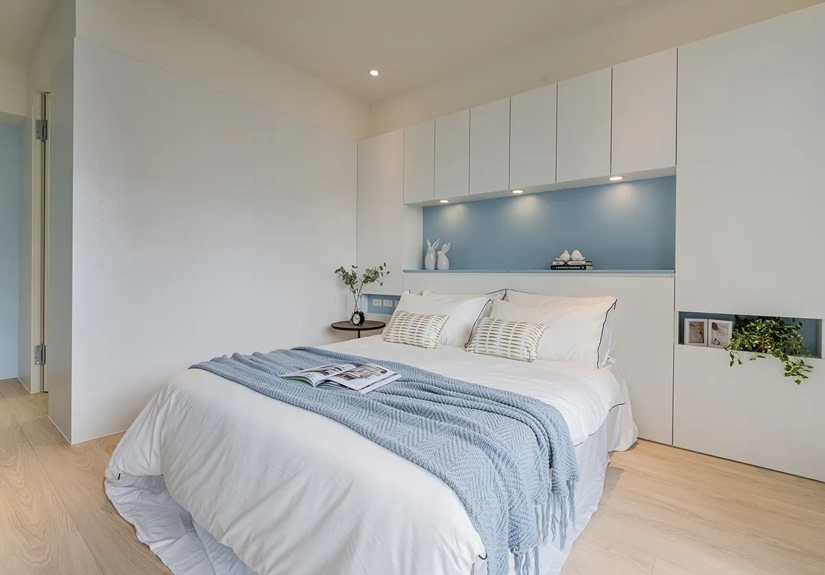 陽台豐沛採光灑落後,盈滿臥房明亮視野,淡藍與白色柔和交織,有如將天際的藍天與白雲帶入室內,也開啟朗闊視感。