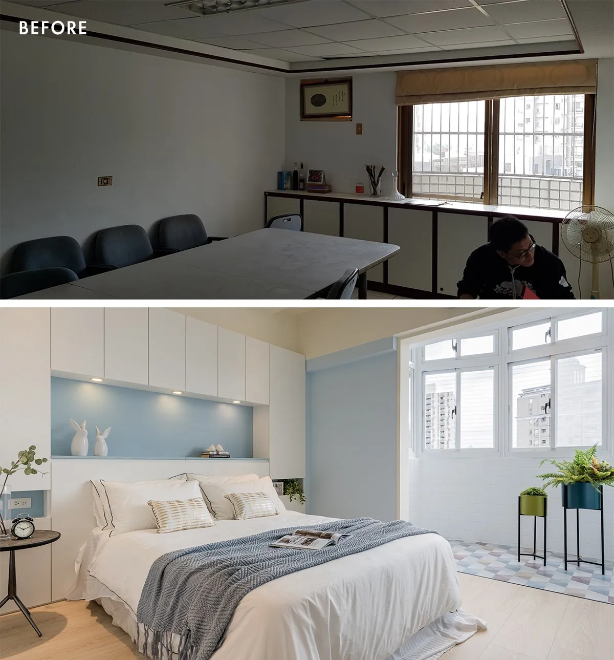 位居住宅後段的空間原經打通後做為辦公室使用,如今,針對家庭成員需求,重新砌築隔牆、劃分回兩房設計,亦從中額外隔劃一間儲藏室。
