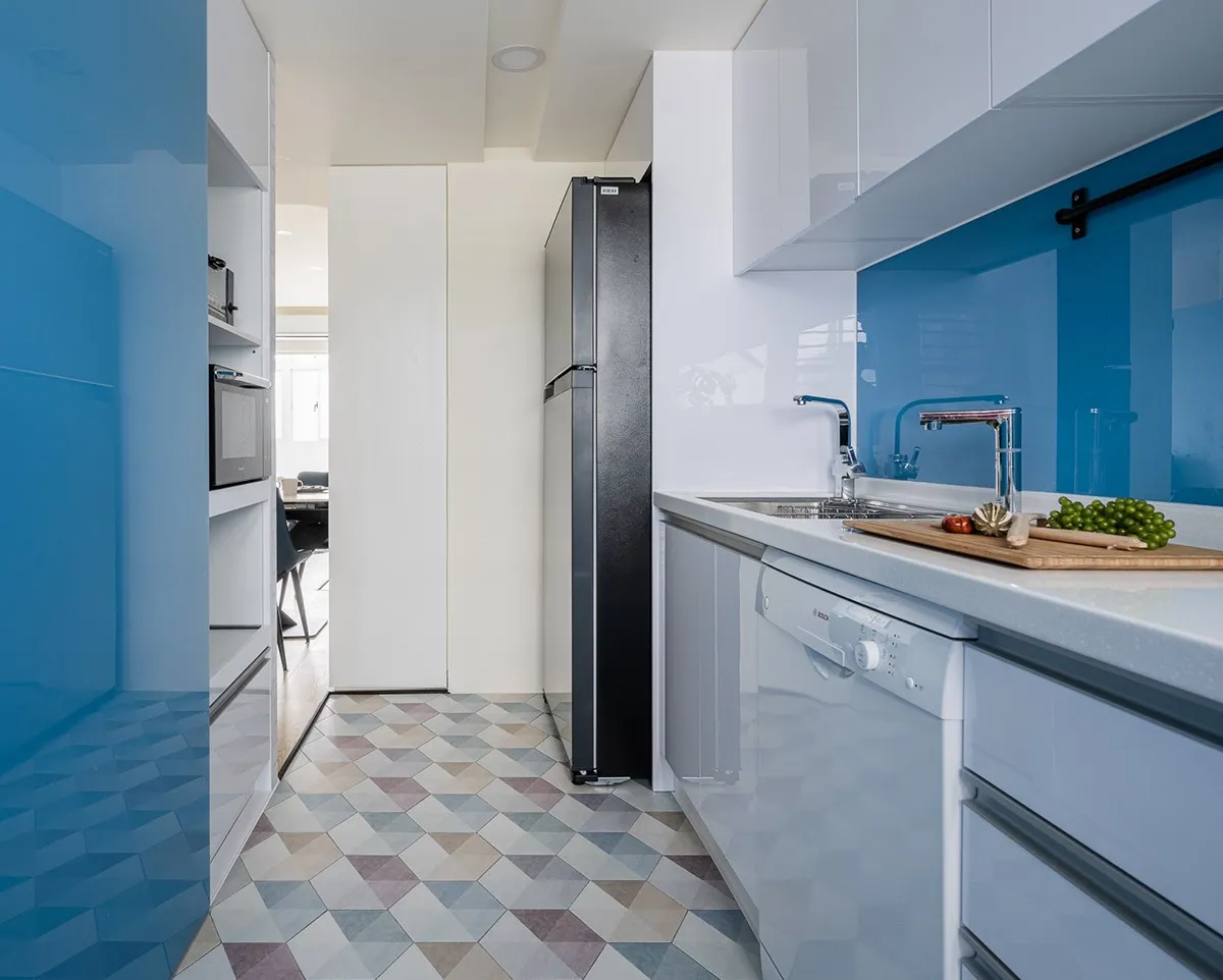 六角磚鋪述下,靛青色烤漆玻璃與白色廚具接軌公區域色調,鑑於過去狹小廚房並不符男屋主期待,因此卸除既有獨立式隔間,使原僅有一米多廚具尺度,拓展成三米長的烹飪區域。