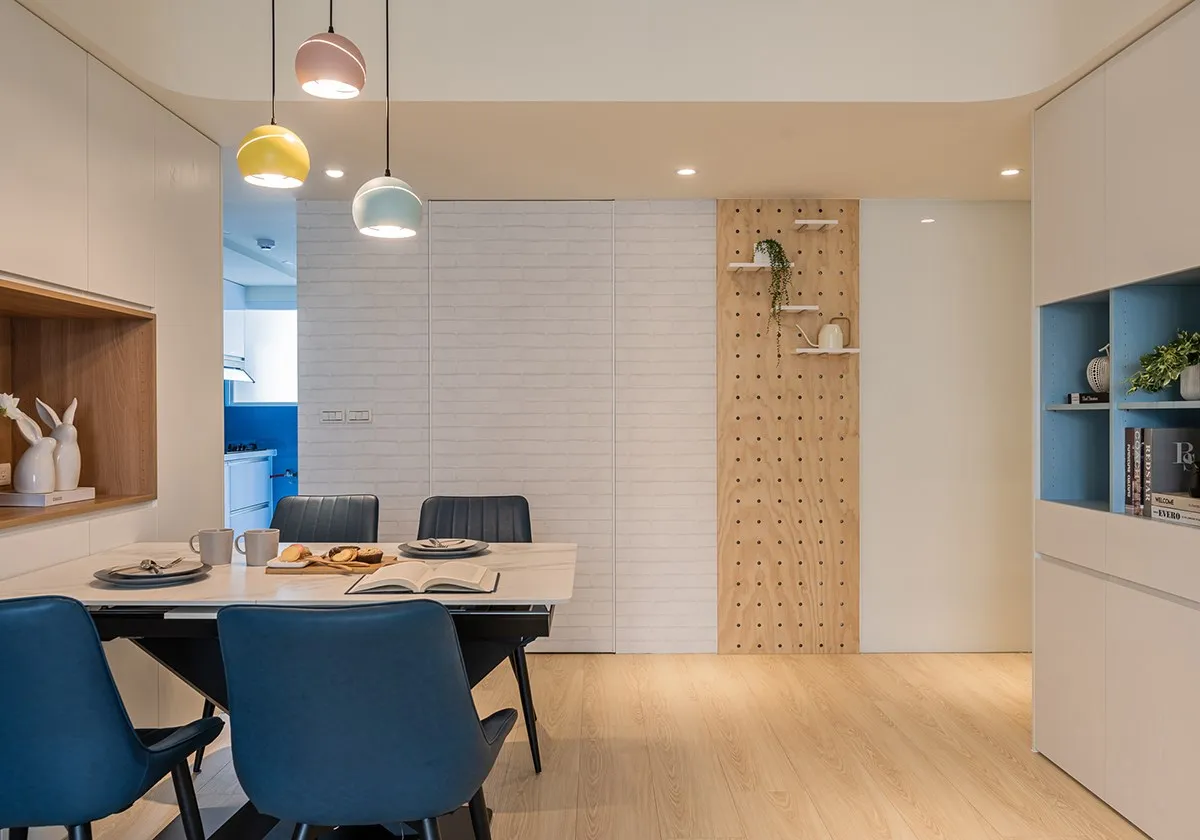 餐邊櫃與書櫃相對呼應,延續孩子在餐桌寫作業、家人圍聚餐桌吃飯情景,於是餐桌兩側以櫃體滿足多重使用機能,同步輔搭孔雀藍餐椅,透過多層次藍色構築連成一氣的視覺,而馬卡龍吊燈由此落下,運用跳脫空間用色的手法,奠定餐廳領域。