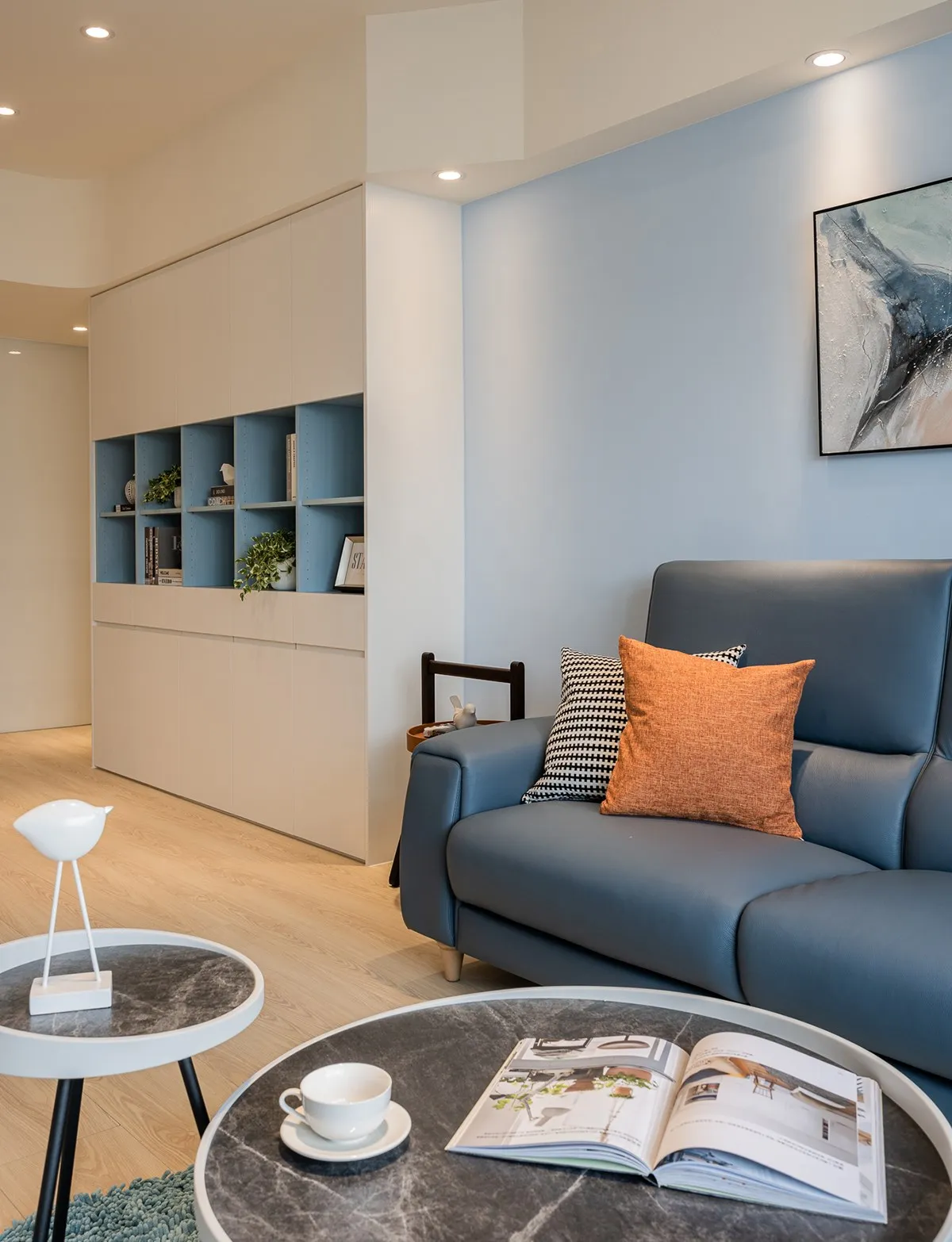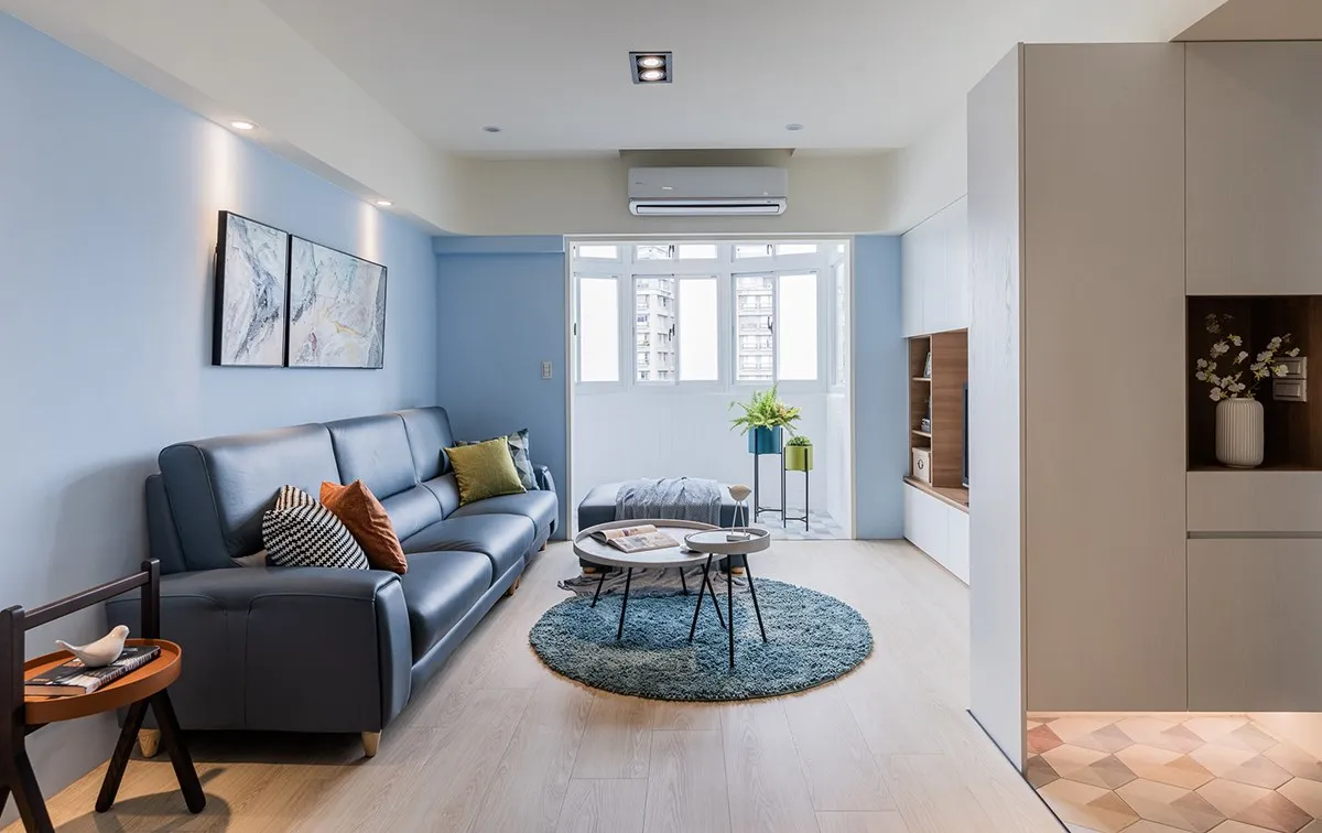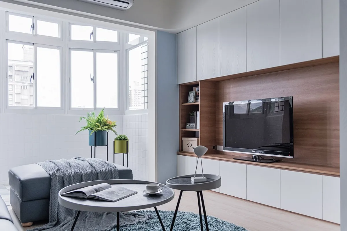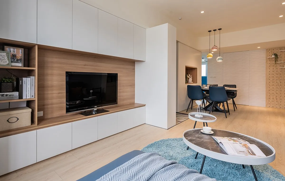 基於女主人喜歡北歐與地中海風格,設計師擷取部分精髓融合兩者,電視牆這側以白色和木料詮釋北歐元素,而沙發背牆則選搭藍白色表述地中海,無形地於空間中置入一條軸線,以簡鍊手法實現理想生活輪廓。