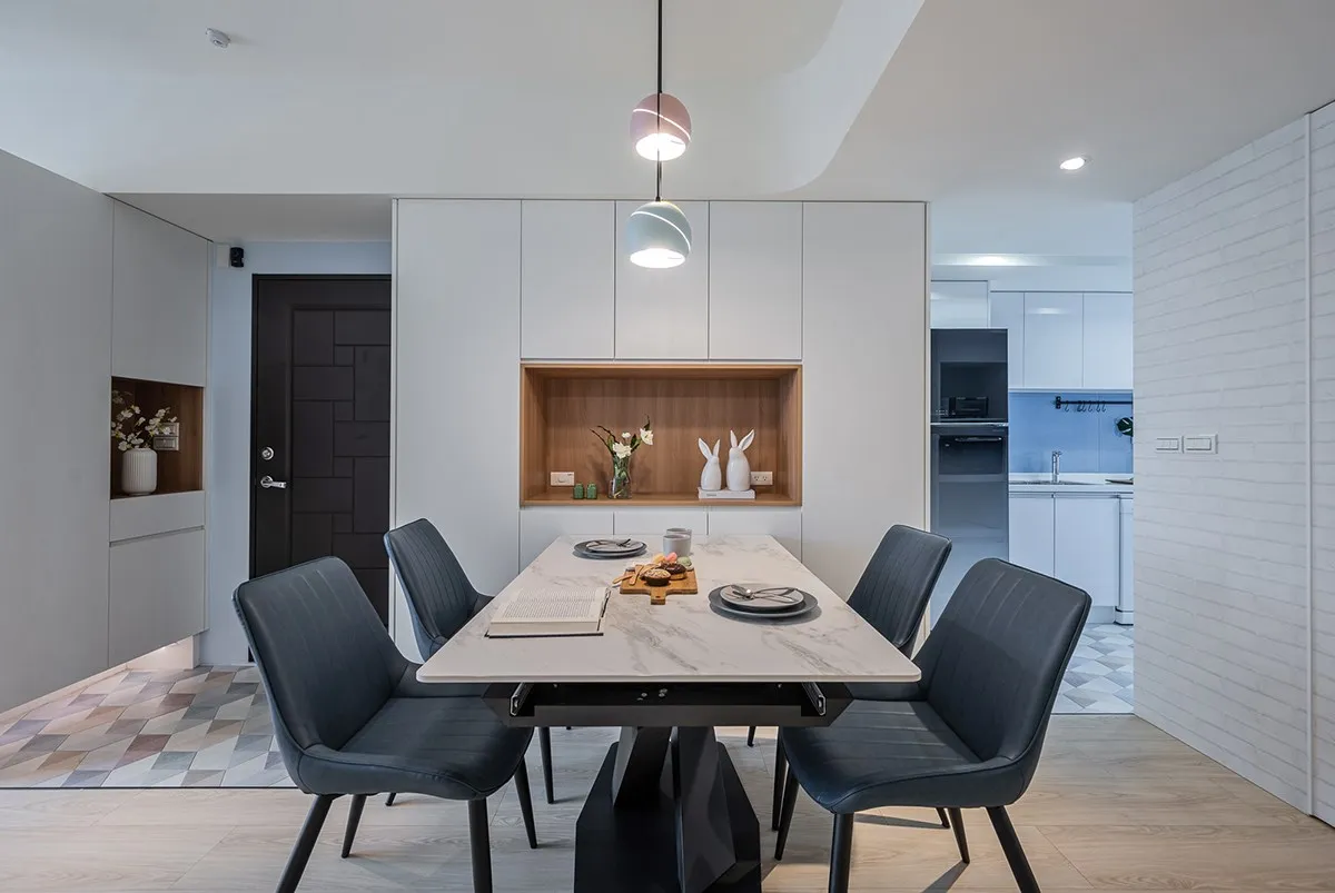 如今,長型領域藉由局部挪移隔牆嵌入電器櫃,將所有設備彙整於一區,流暢烹調取物動線,白色廚具更選用耐潮六面結晶鋼烤,方便屋主整理清潔。
