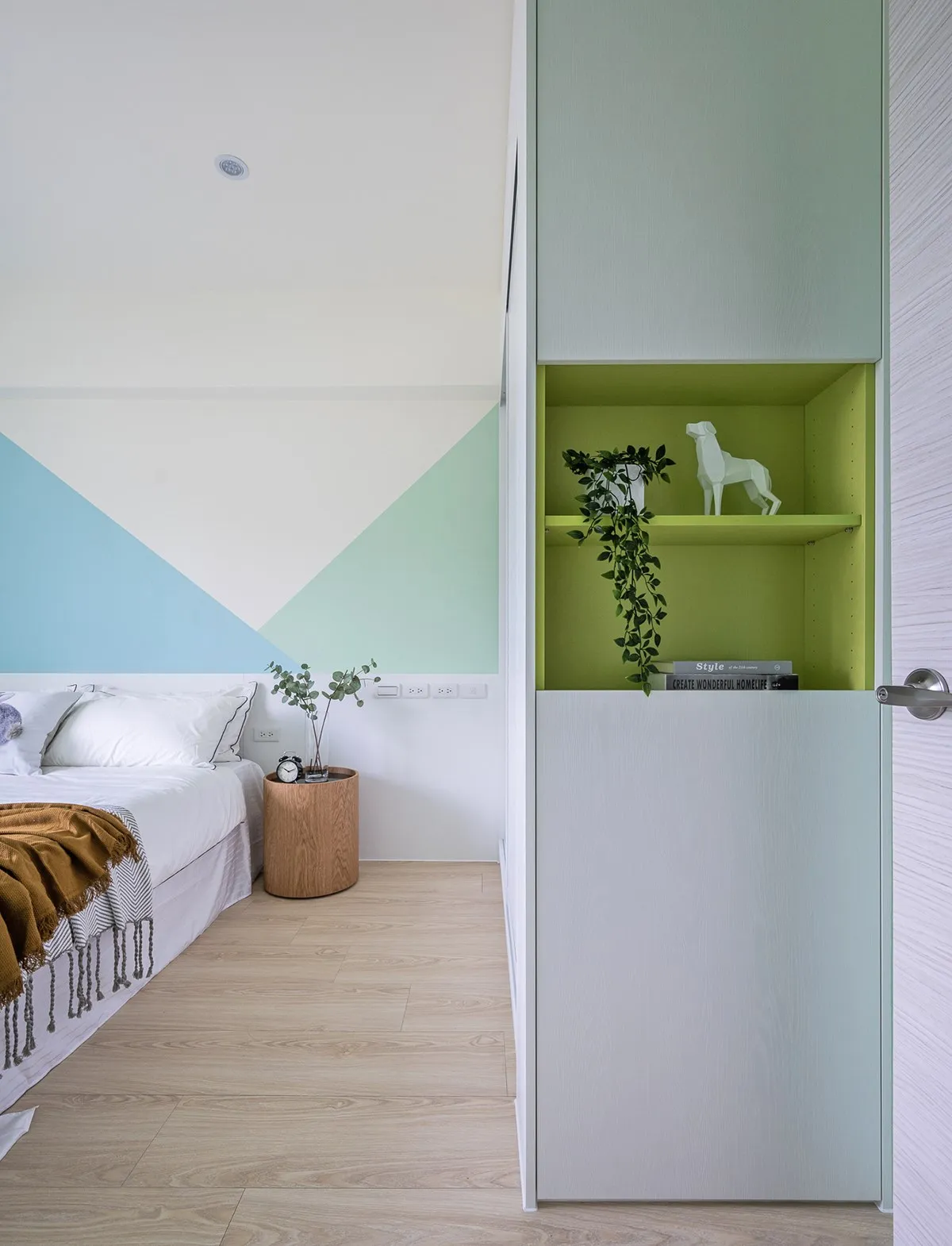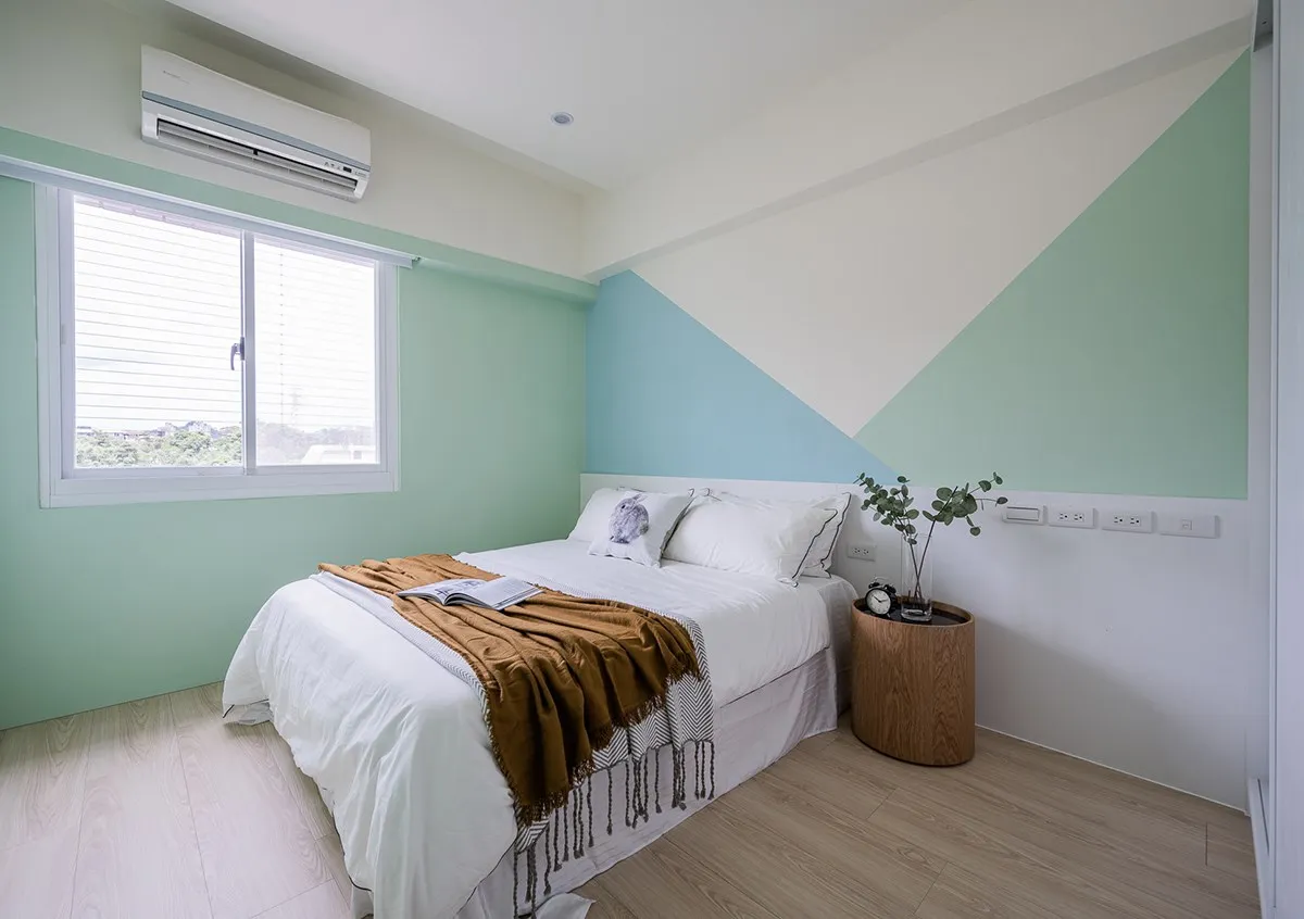 因為孩子年紀還小,考量日後成長所變,設計師選擇以色彩+幾何床頭造型,揮別過於童趣語言,局部選用藍白色,特別輔以孩子指定綠色系,描繪漫步森林裡活潑氛圍,同步於靠牆衣櫃輔搭入門端景櫃,提供孩子們展示作品與收藏的小天地。