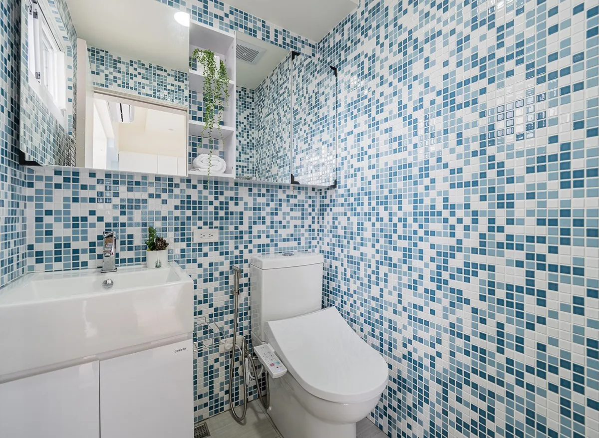 為了呈現聖托里尼小鎮的藍白色調,壁面以馬賽克拼貼渲染地中海浪漫情懷,主衛浴隔間經過推移後,採取精巧二件式衛浴規劃,並搭配鏡櫃與陳列架佈局 1.3 米寬度,放大有限空間感,同步以此拓增其中收納機能。