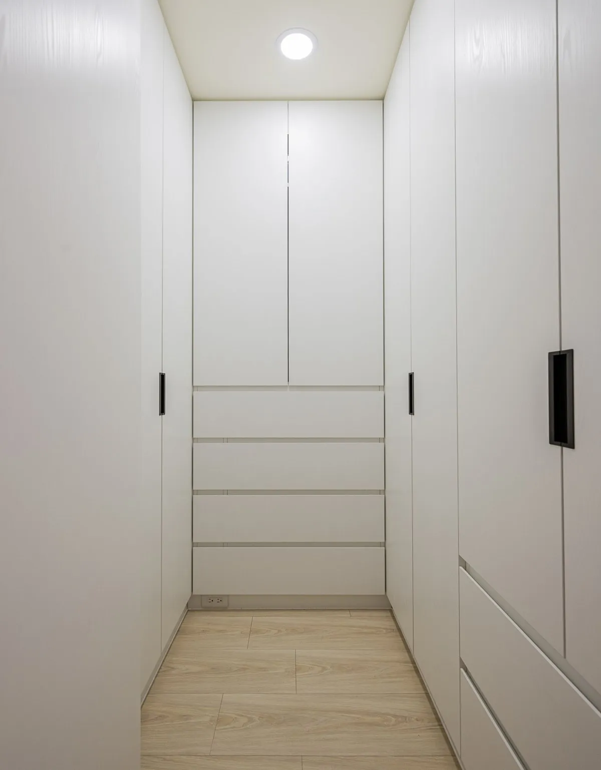 因應寬敞主臥空間已符合屋主日常所需,特別推出一間獨立更衣間,擴展一家四口的置物容量,內部利用 ㄇ 字型櫃體佈局,分別針對夫妻兩人衣服數量與長度,調配吊掛與抽屜,更採用封閉式櫃體以便維持整潔。