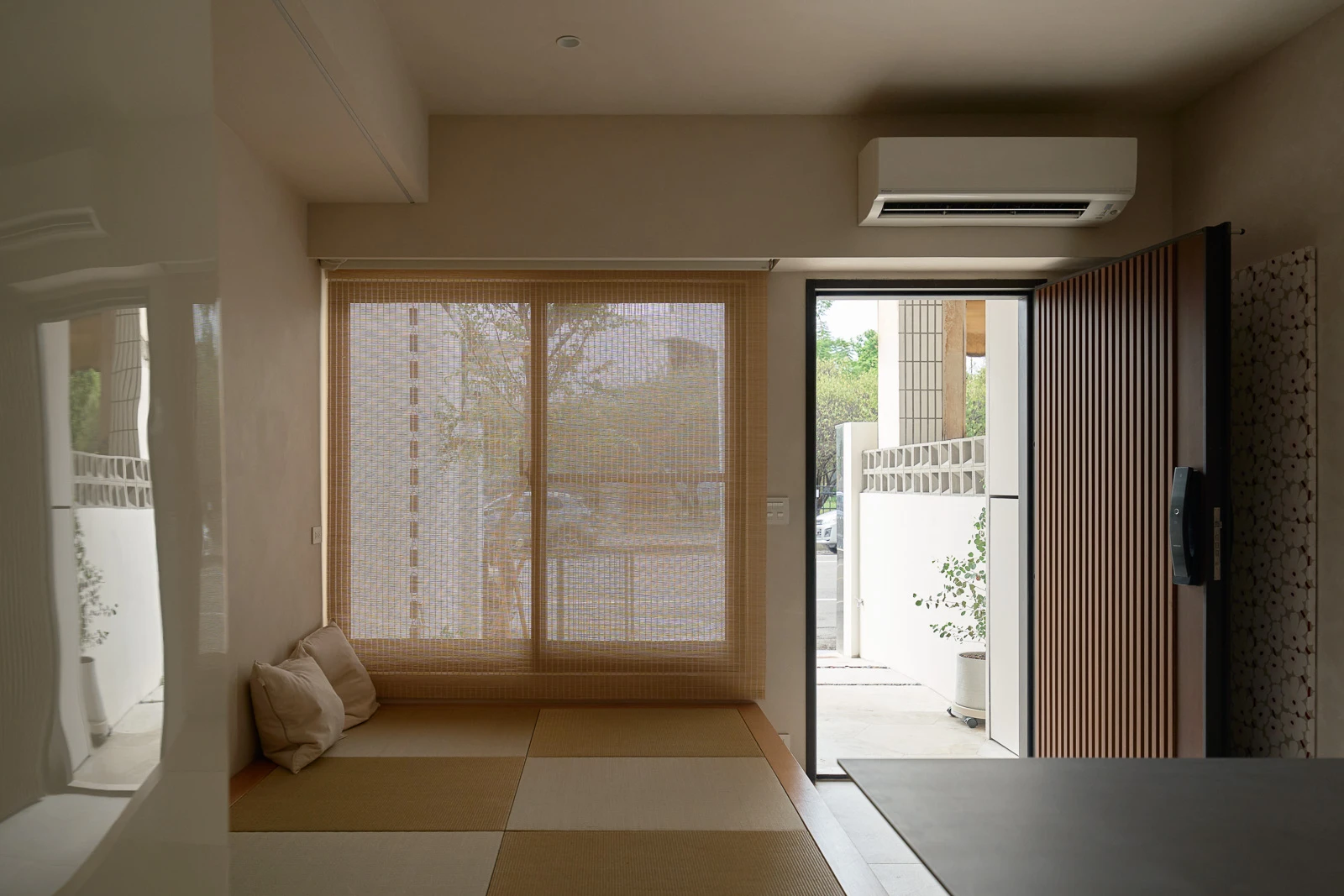 當色彩退一步,生活才真正成為主角。我們用米色石紋鋪陳衛浴,以淺木色書架隱藏樓梯結構,最後點綴一抹柔和粉色。不張揚的設計,讓空間更輕、更有呼吸感。