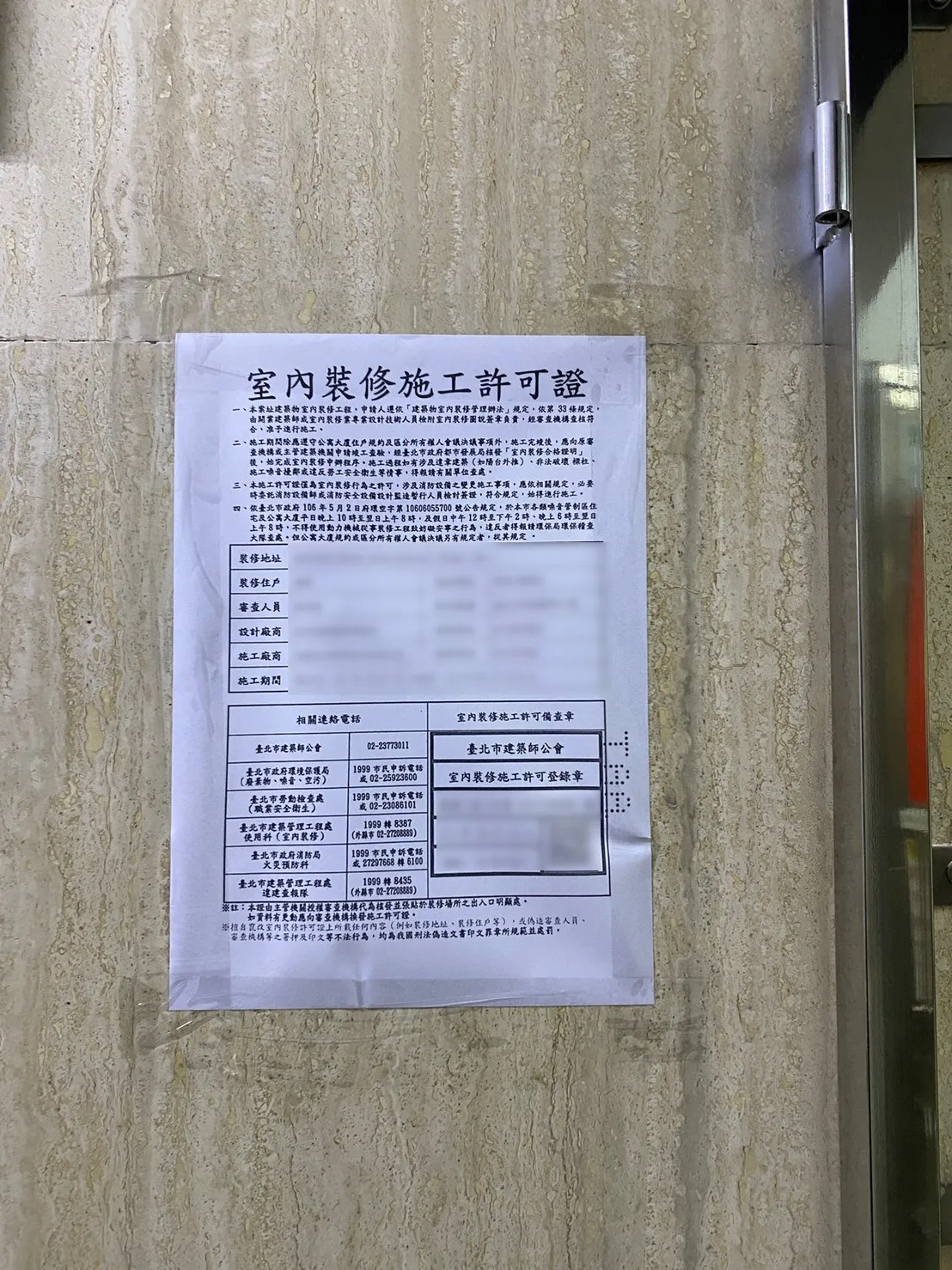 施工前要申請室內裝修許可,根據建築物室內裝修管理辦法的規定,家中如有裝修,需申請室內裝修許可證,違者新臺幣6萬元以上30萬元以下罰鍰。( 相關規定放在下方 )