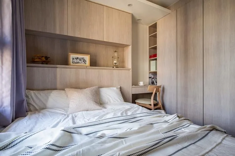 總共裝潢了兩間房間,第一間的床鋪顏色使用米白色,溫和的色系,在陽光照射進臥室後,顯得更加溫馨。