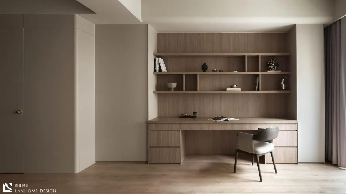 主臥以木質調與柔和燈光打造安穩氛圍,書桌與衣櫃整合於同一動線;次臥以簡潔線條與收納設計提升實用性,使生活更俐落輕盈。在日光與木質交織下,家的溫度悄然重生,成就一場老屋新生的生活詮釋。
