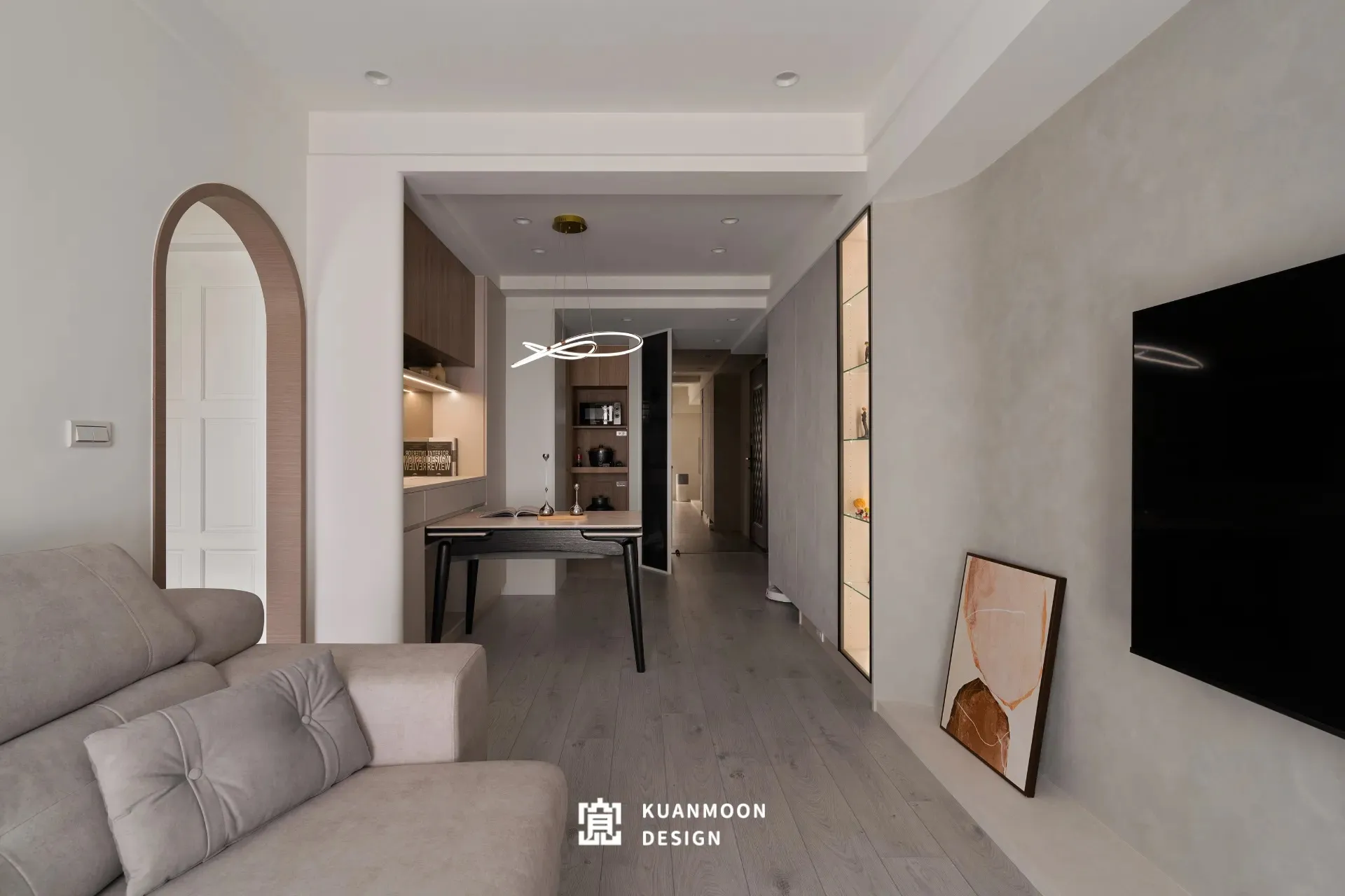 客廳牆面選用灰色水泥質感處理,搭配嵌入式木質收納櫃,兼具實用機能與視覺秩序。整體以微澄為設計概念,巧妙借助自然光線與柔光燈具,營造通透不刺眼的舒視氛圍。金屬燈具與局部點綴,則為溫潤的空間注入一絲現代氣息。