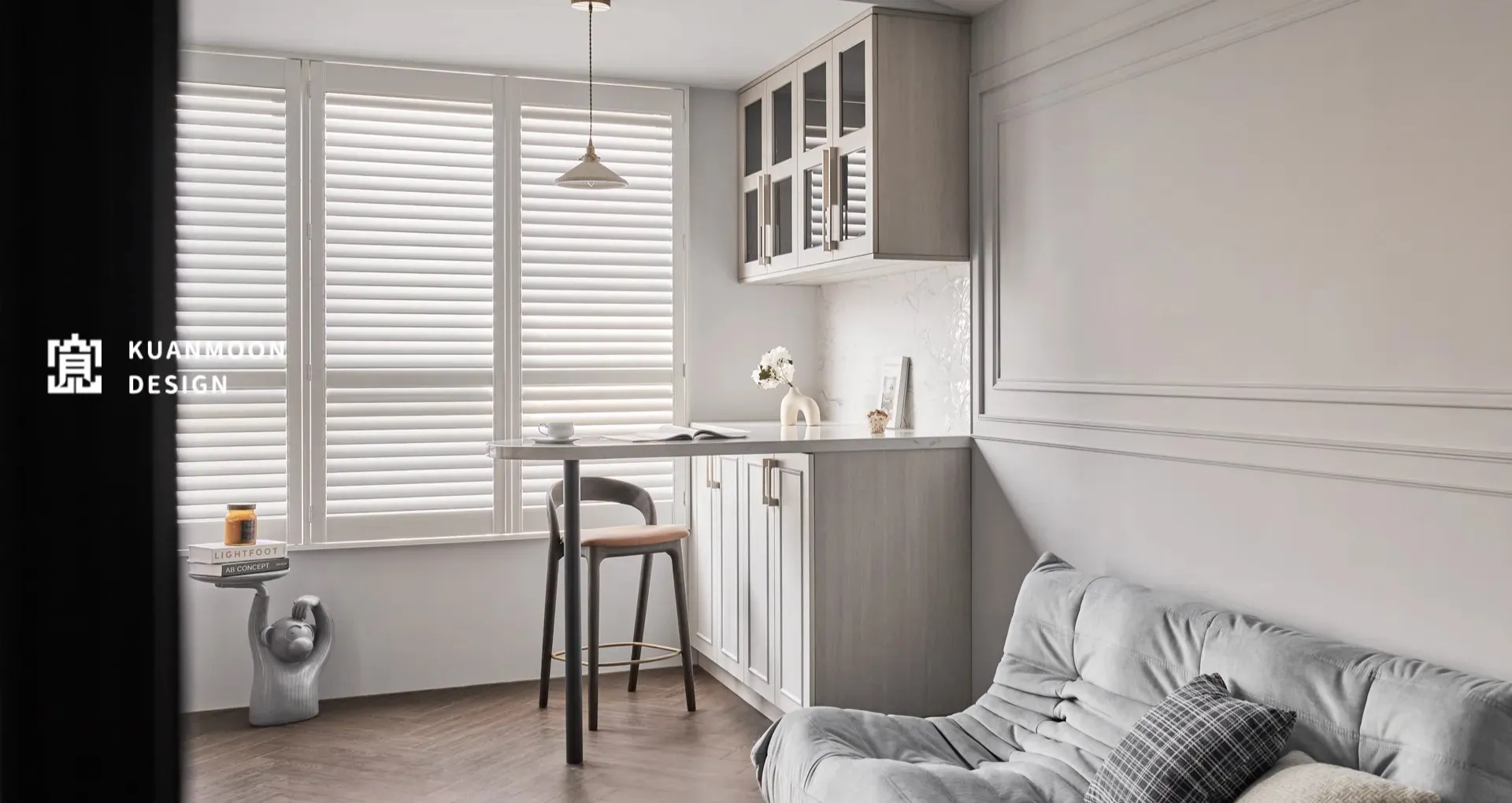 百葉窗如詩,如簾;光線透過縫隙溫柔地鋪灑,營造一種「被光擁抱」的靜謐感。 而那只猴子造型邊桌與幾何花瓶,則在雅緻之中注入了一絲俏皮靈動——就像這個家的性格,不過於嚴肅,也絕不隨意。