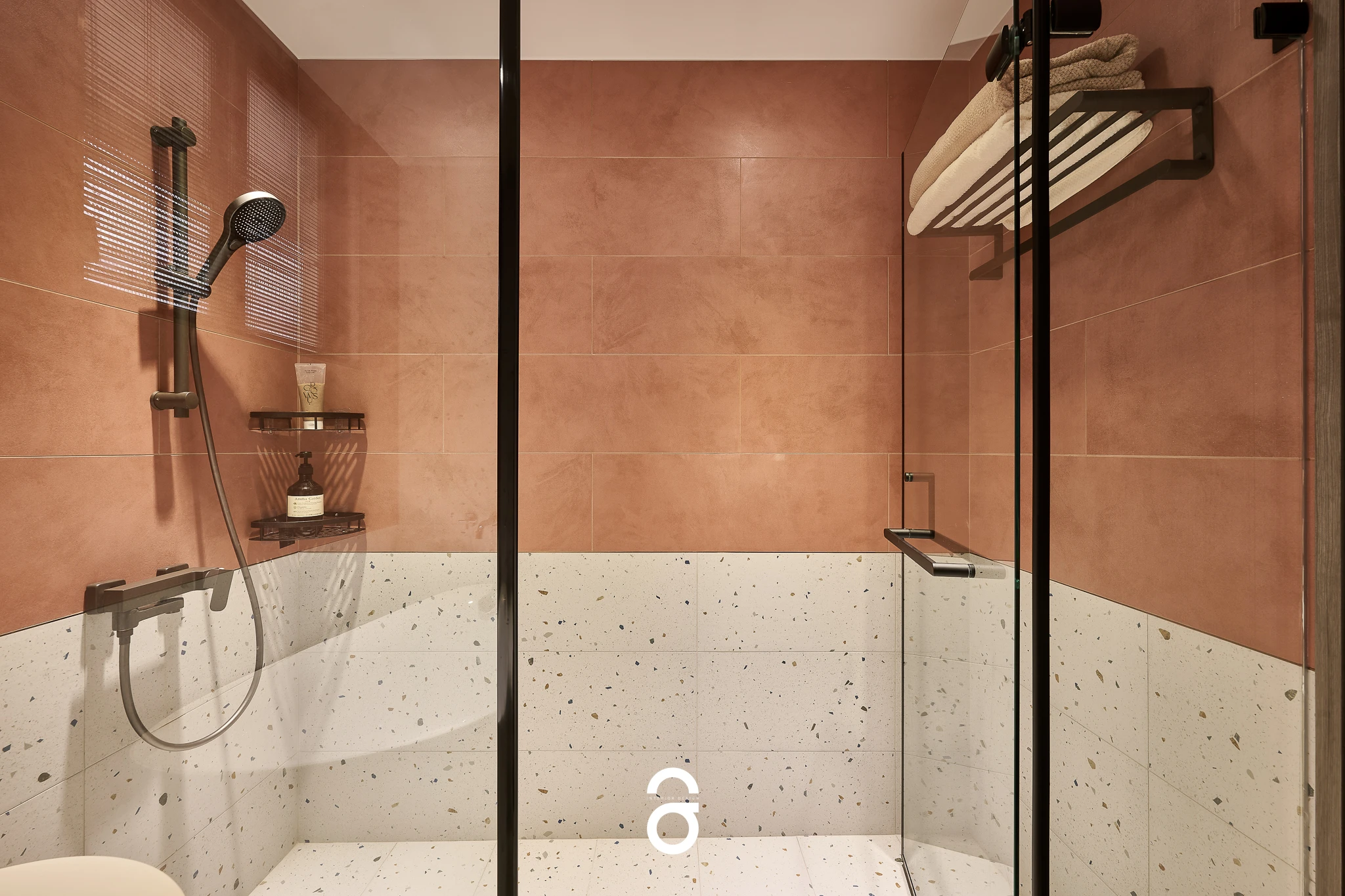 主衛浴|粉橘磁磚搭配圓弧浴缸,泡澡像是一場柔和的儀式