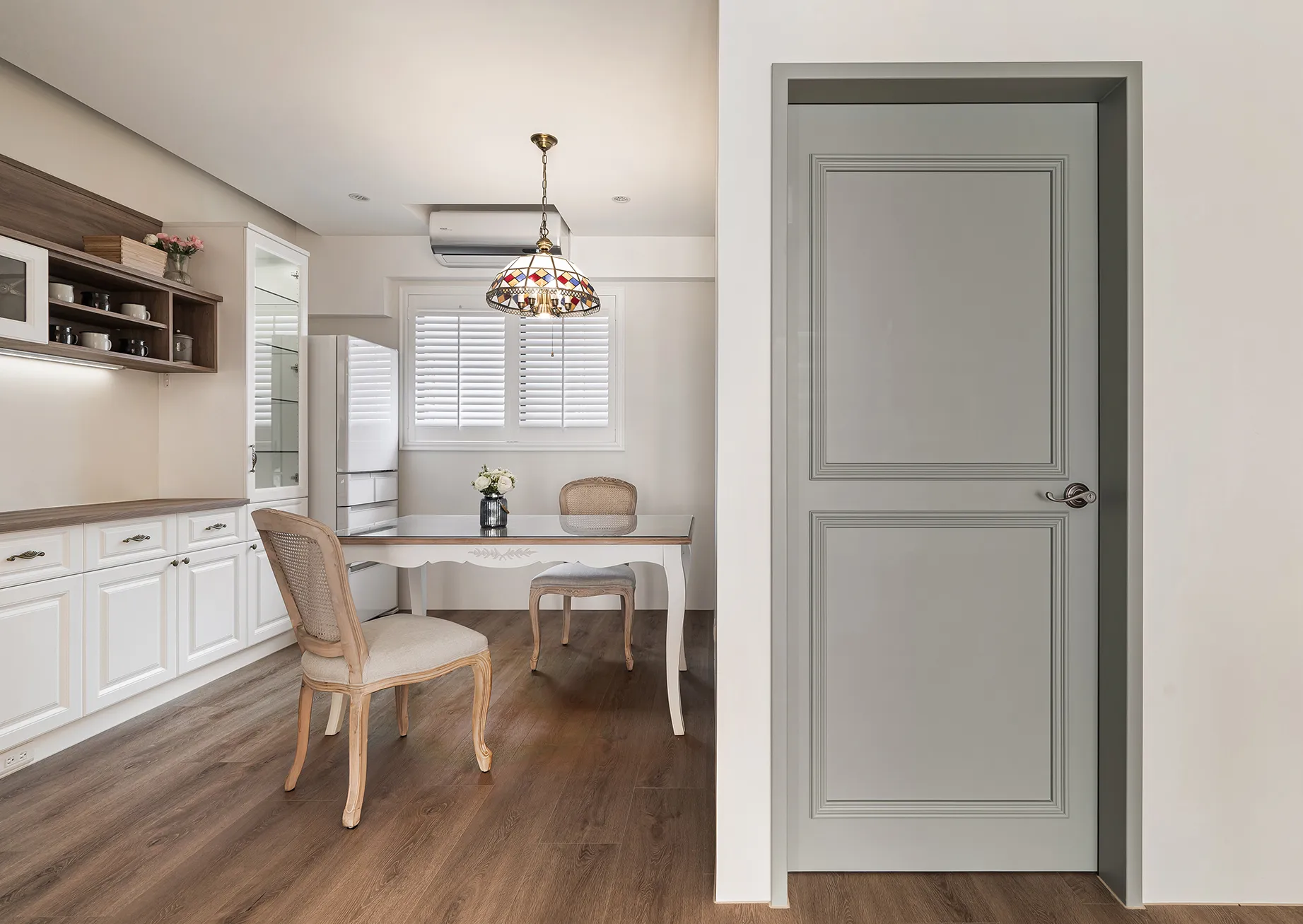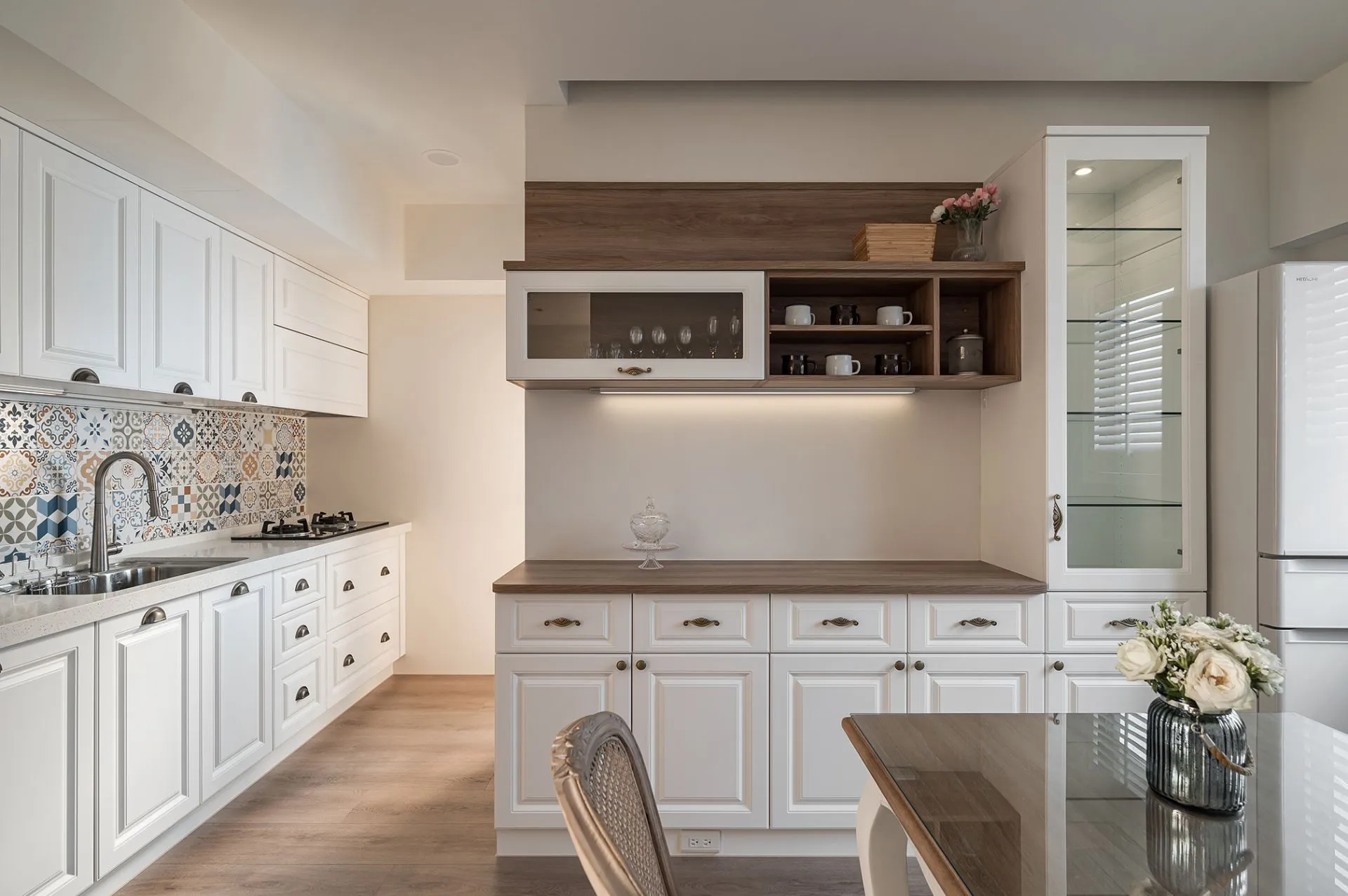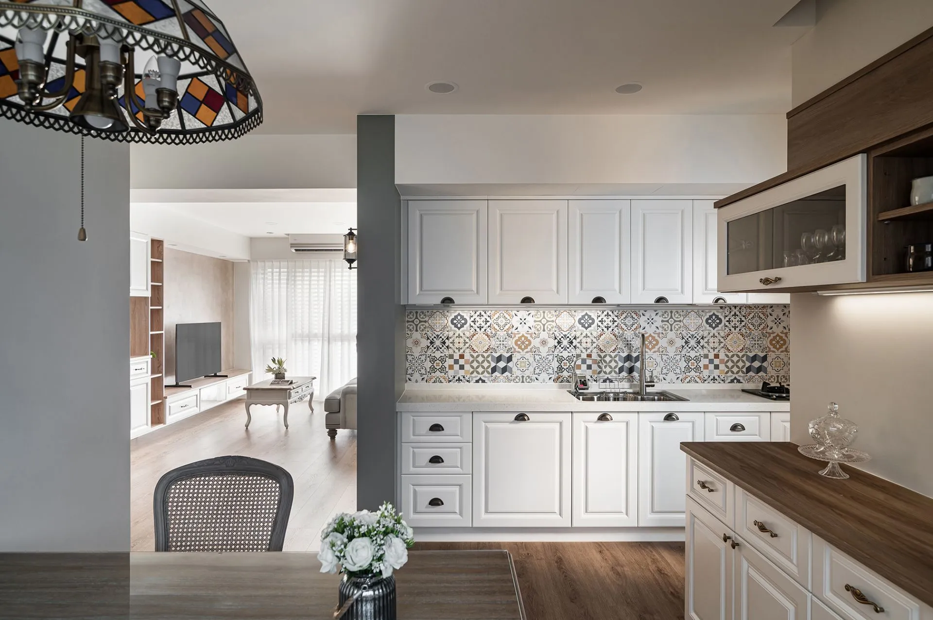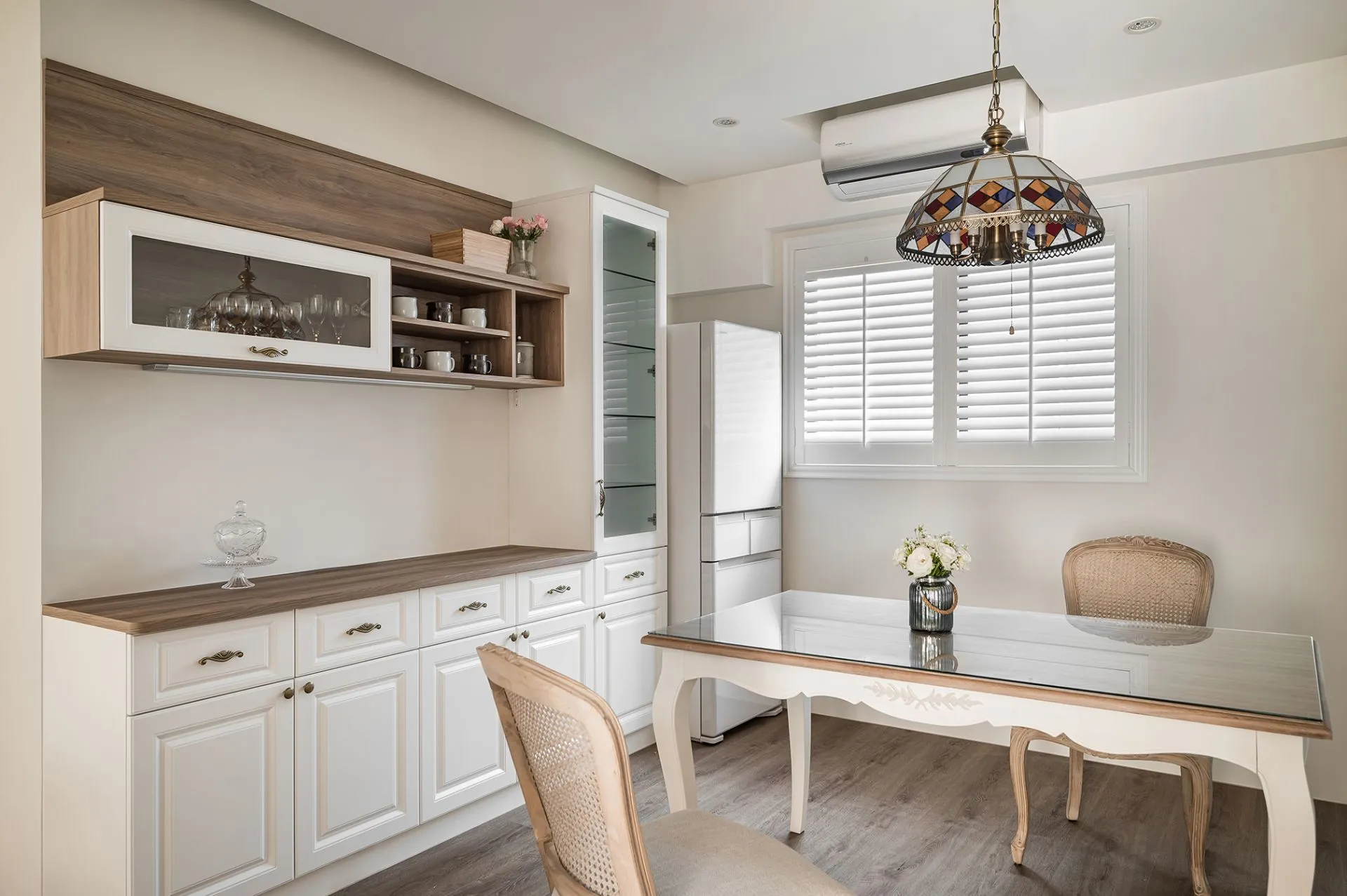 屋主是位有氣質退休女老闆,在年輕的時侯就有一個夢想要能擁有一間 南法鄉村風的家,餐廳對他來講是最重要的地方,家人朋友來時可以一起做飯聊天喝咖啡,平日可以在餐桌上喝個茶翻翻舊照片,兒女們有空也能來渡個假.每一盞藝術燈具都是與屋主共同討論,每一款把手都是特別挑選搭配,廚房的壁面花磚/房間的玻璃格子收納吊櫃/進口的百葉窗都是屋主特指定所有的家具及寢具都是設計師全程陪同挑選搭配