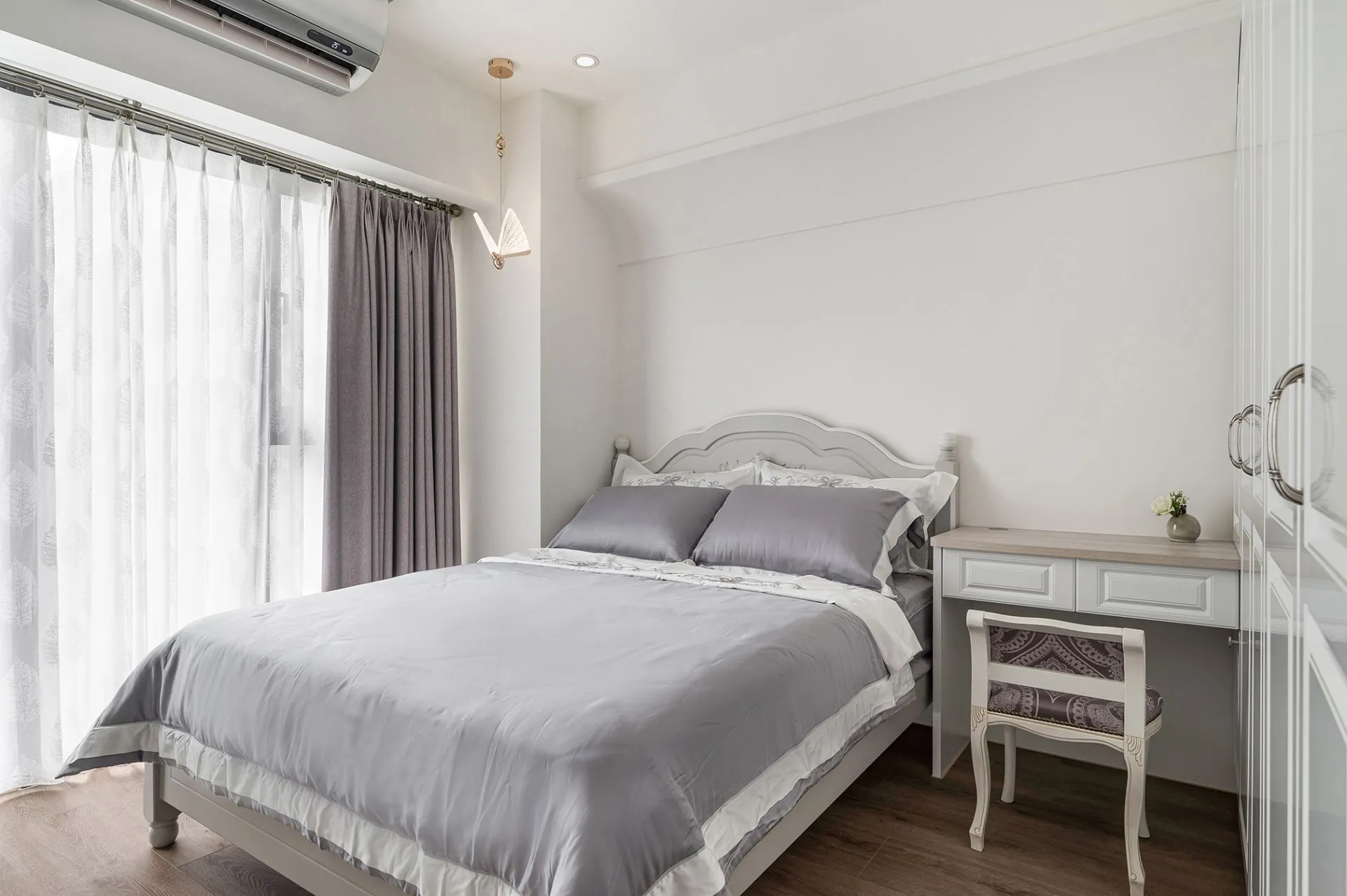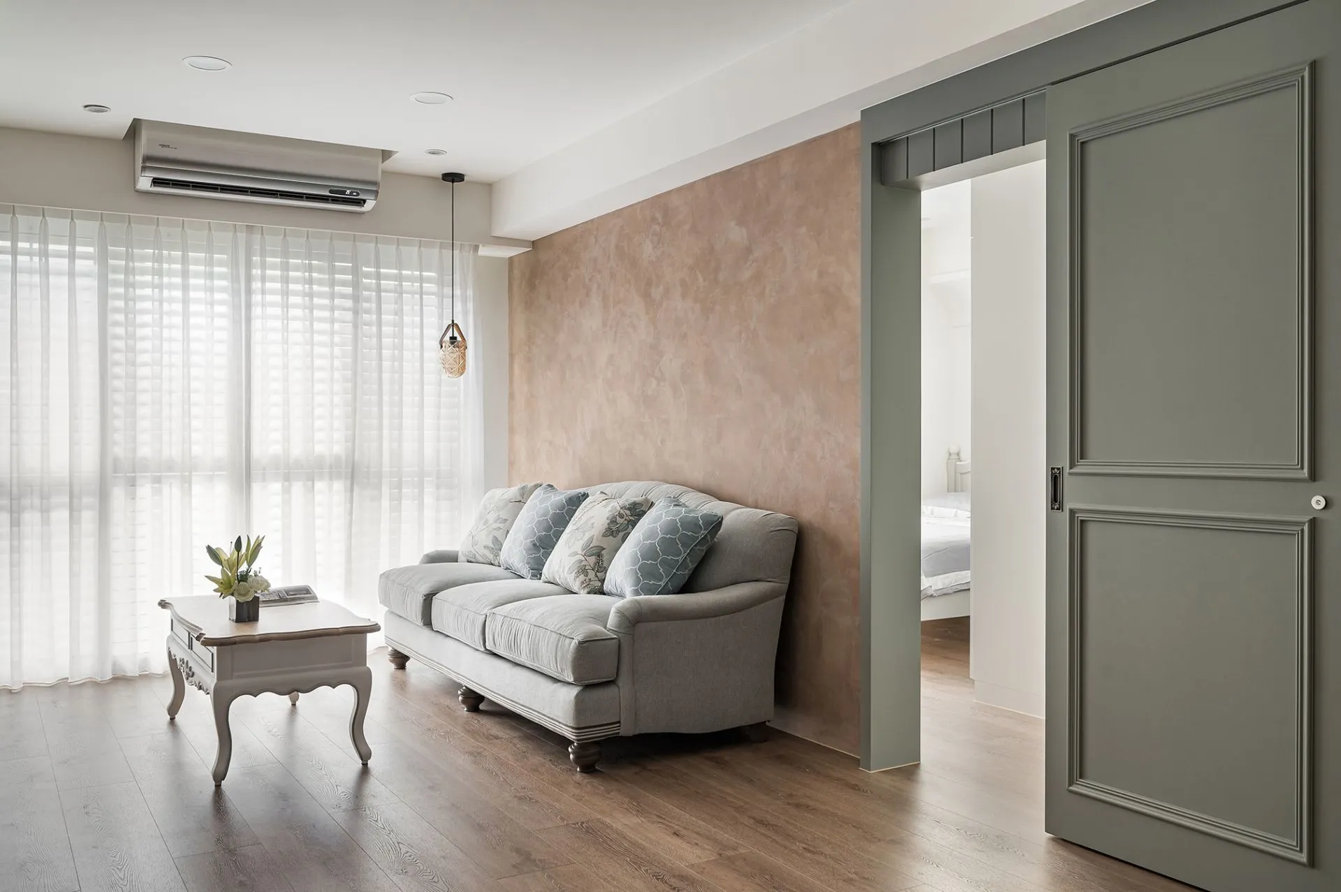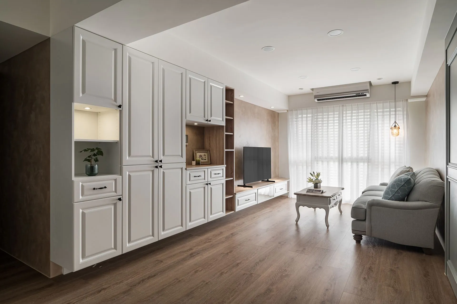 屋主是位有氣質退休女老闆,在年輕的時侯就有一個夢想要能擁有一間 南法鄉村風的家,餐廳對他來講是最重要的地方,家人朋友來時可以一起做飯聊天喝咖啡,平日可以在餐桌上喝個茶翻翻舊照片,兒女們有空也能來渡個假.每一盞藝術燈具都是與屋主共同討論,每一款把手都是特別挑選搭配,廚房的壁面花磚/房間的玻璃格子收納吊櫃/進口的百葉窗都是屋主特指定所有的家具及寢具都是設計師全程陪同挑選搭配