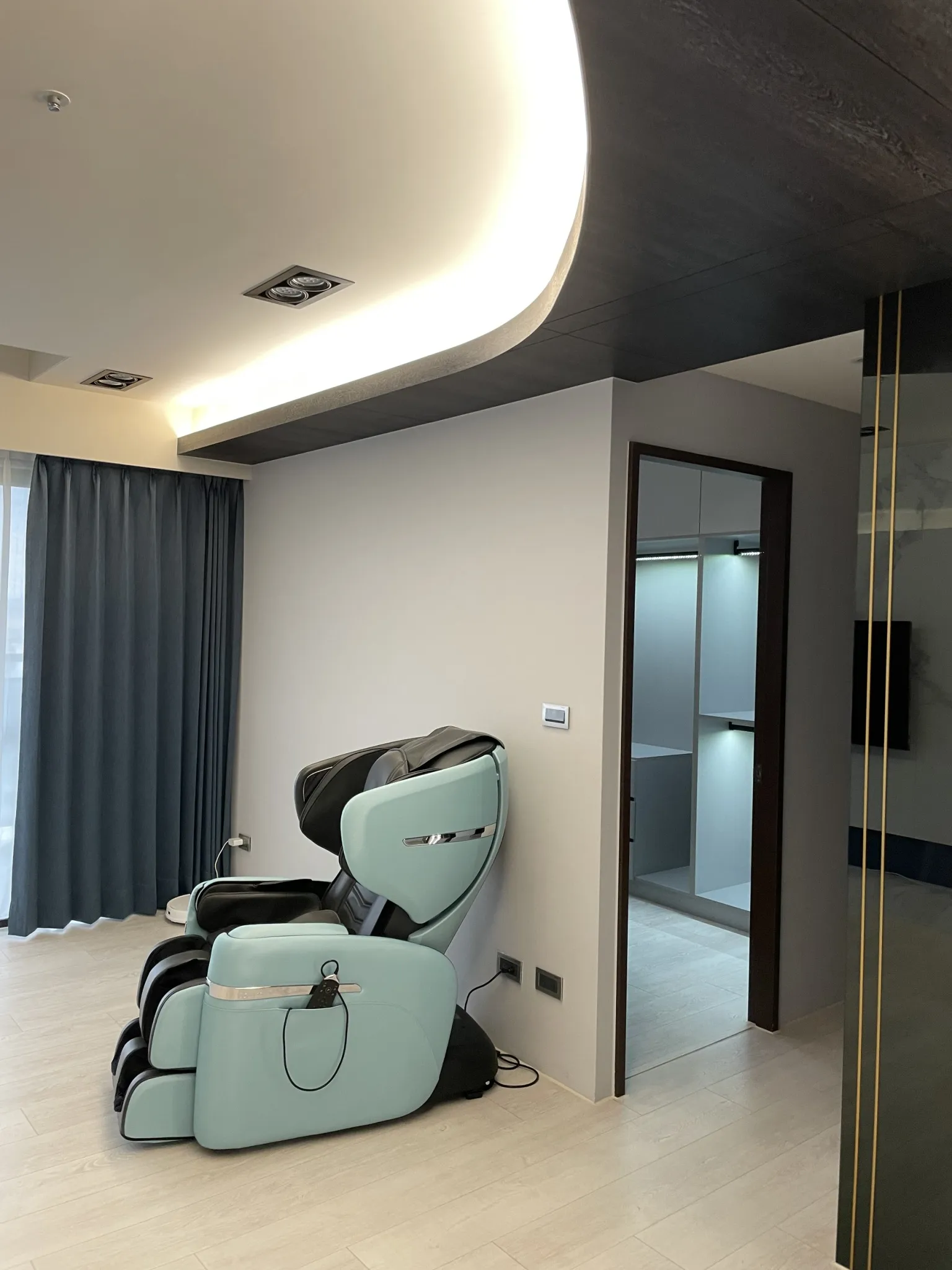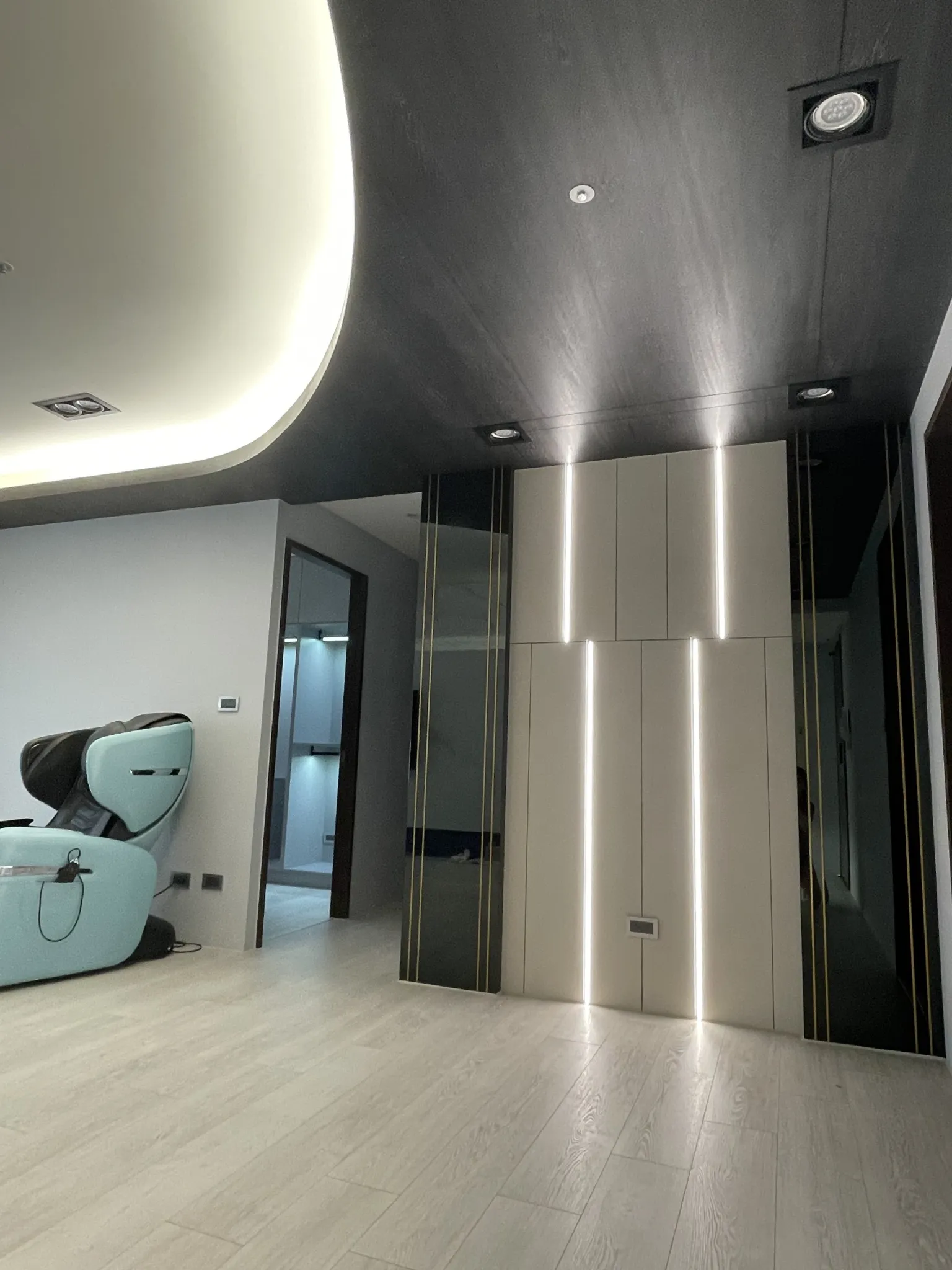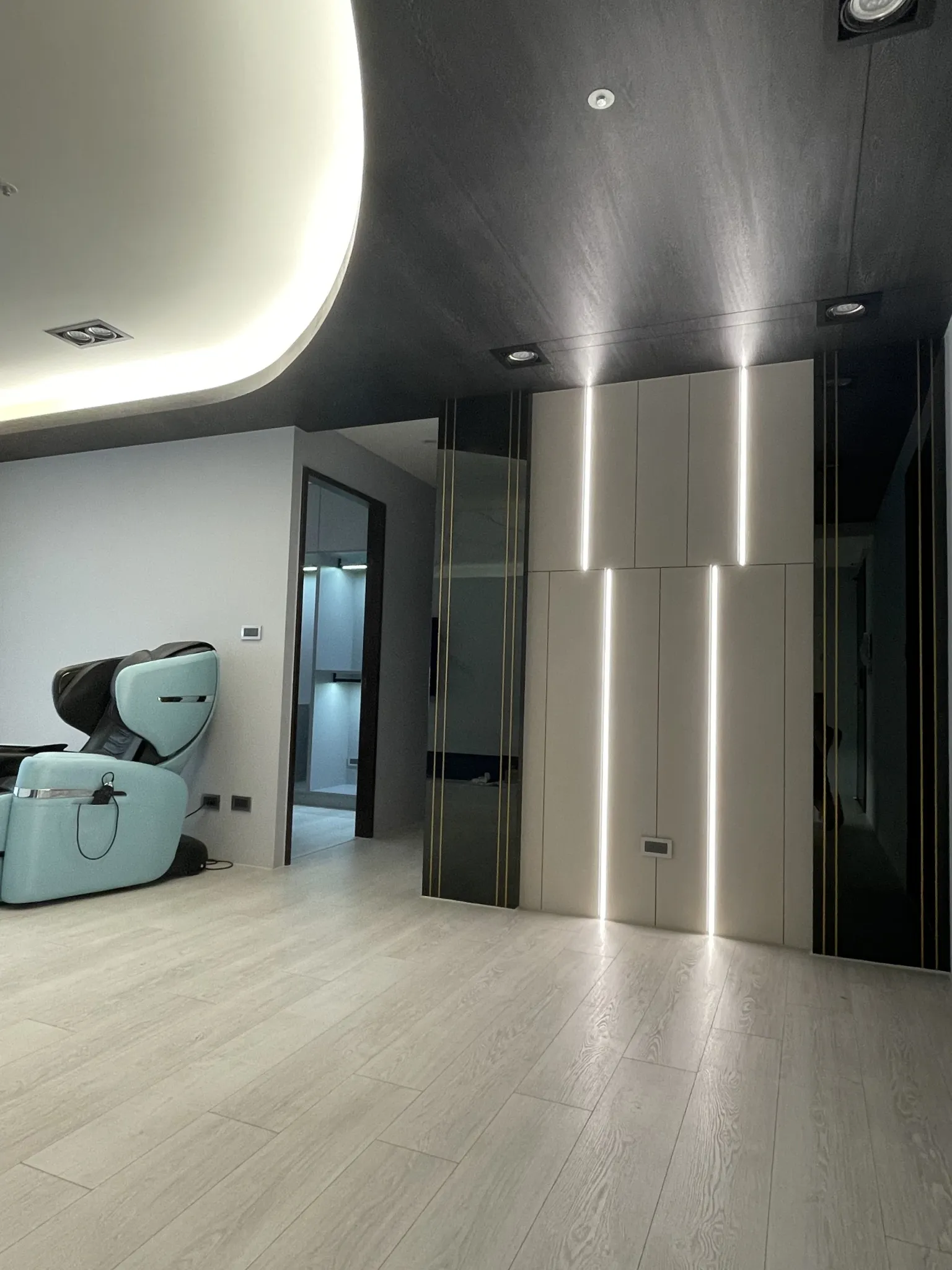 燈光規劃著重於線性照明與間接光源,勾勒牆面比例,同時柔化深色材質帶來的冷調感,使夜晚的空間呈現沉穩而放鬆的狀態。收納機能隱藏於立面之中,維持視覺簡潔,讓生活回歸理性與秩序。