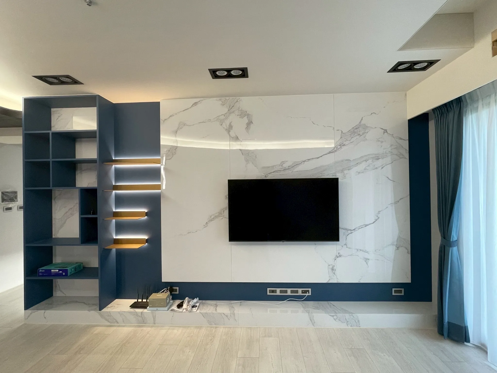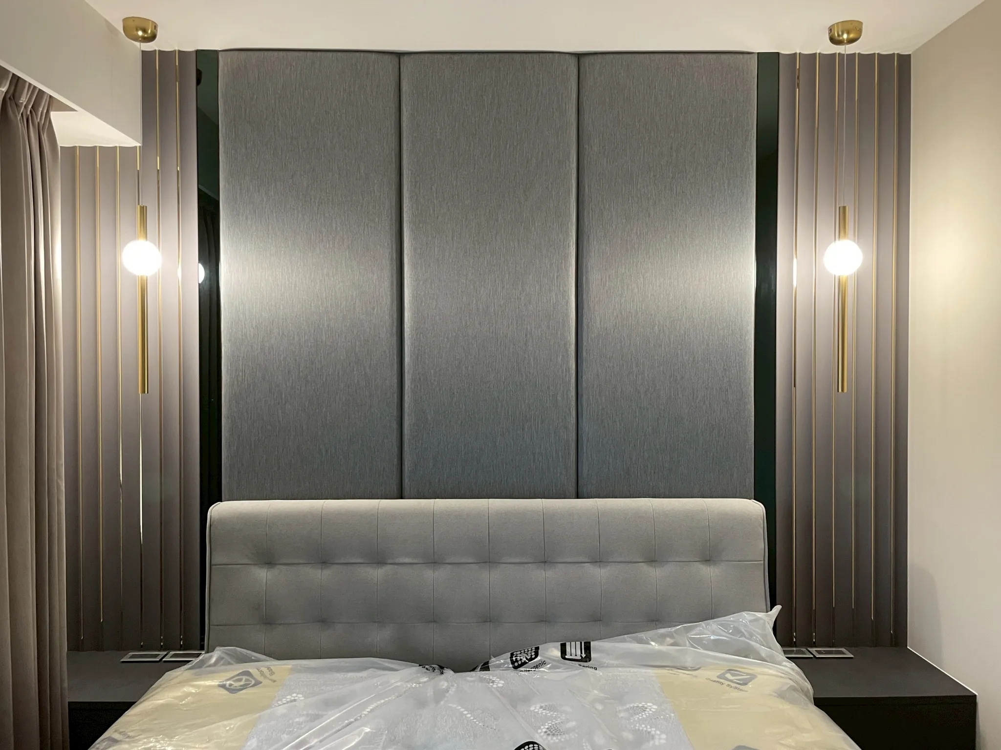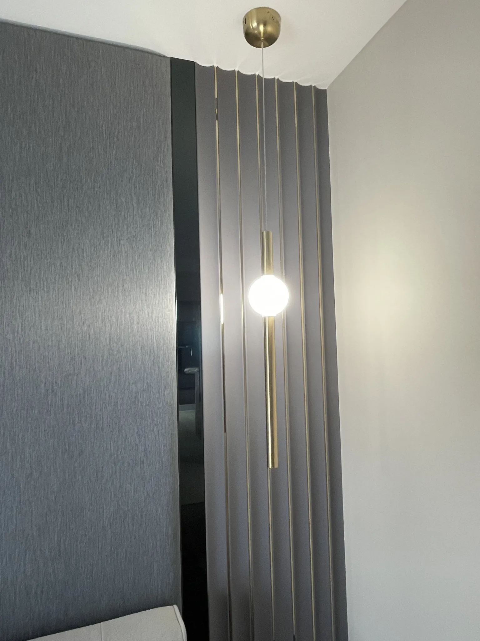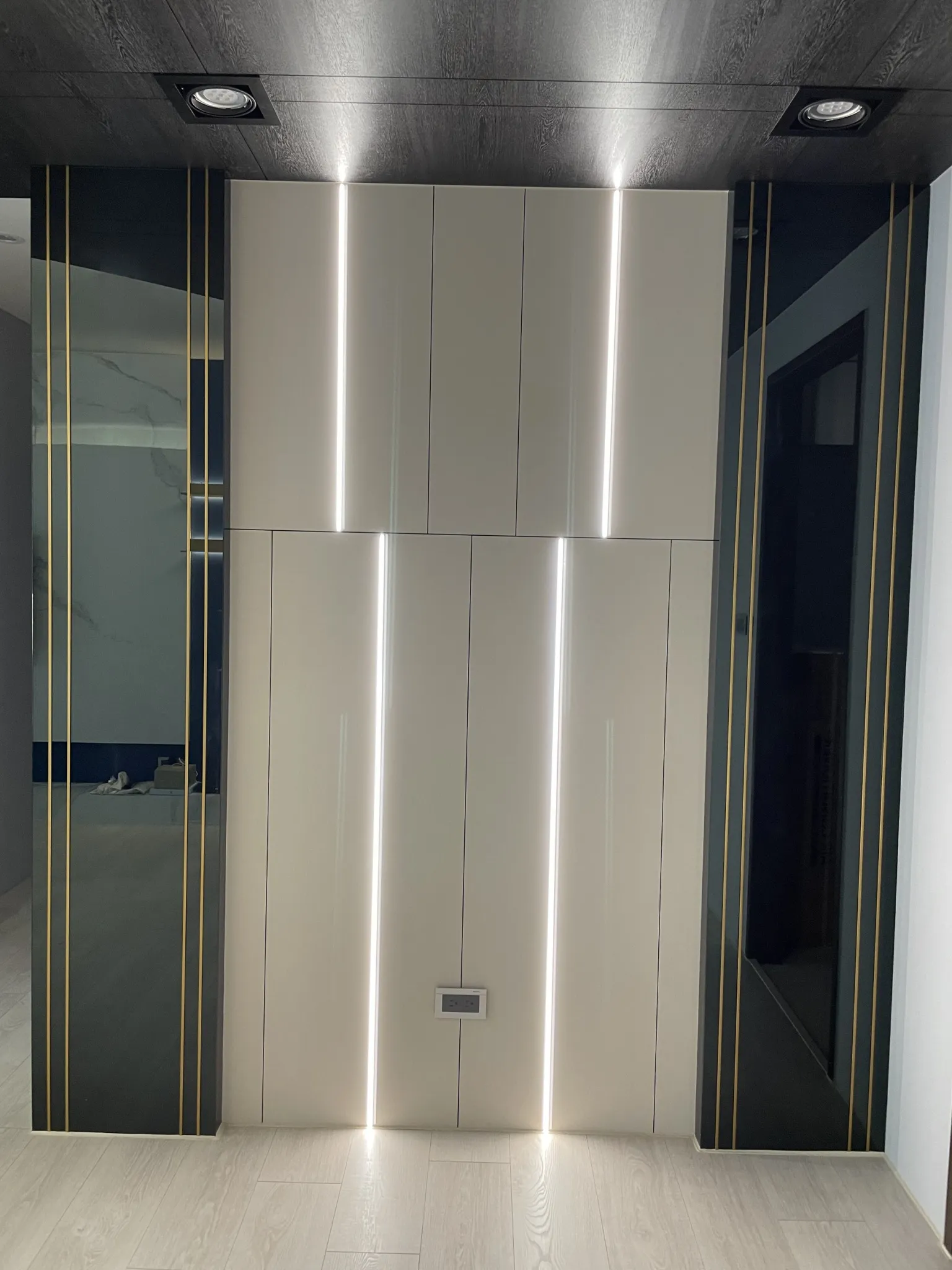 燈光規劃著重於線性照明與間接光源,勾勒牆面比例,同時柔化深色材質帶來的冷調感,使夜晚的空間呈現沉穩而放鬆的狀態。收納機能隱藏於立面之中,維持視覺簡潔,讓生活回歸理性與秩序。